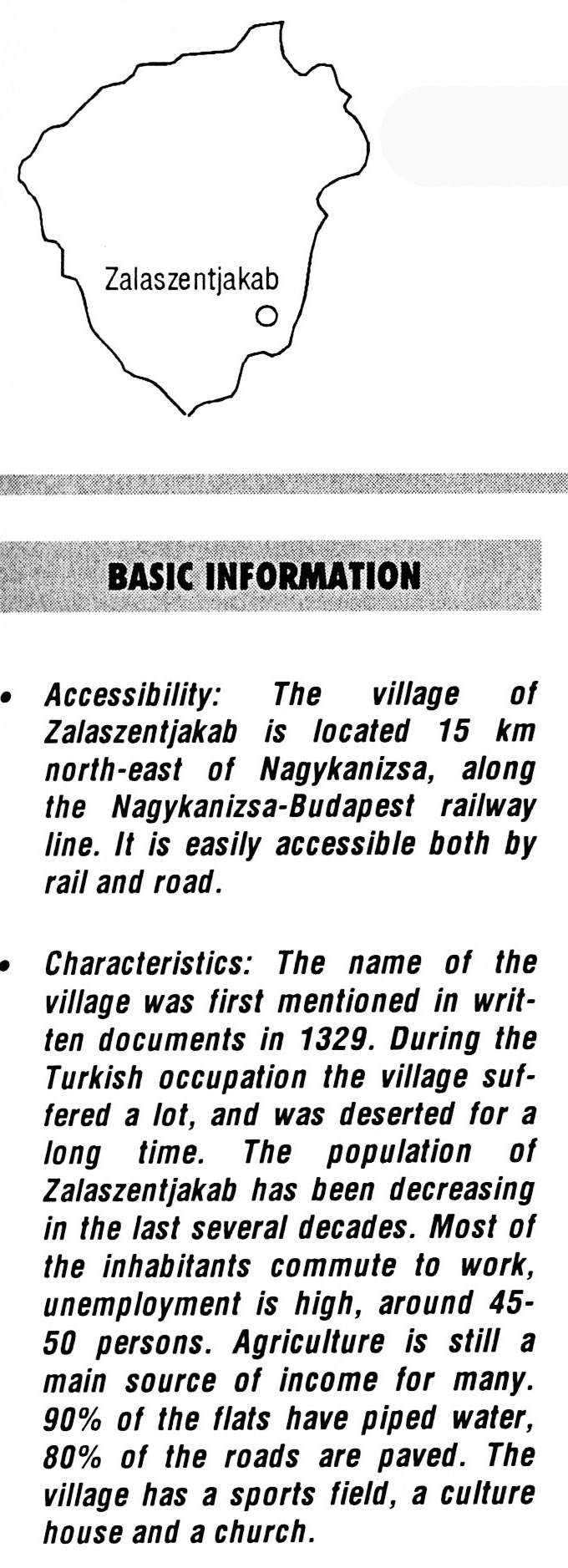 Nyilvános 1897 | 5451 | Zalaszentjakab | BASIC INFORMATION Accessibility: The village of Zalaszentjakab is located 15 km north-east of Nagykanizsa, along the Nagykanizsa-Budapest railway line. It is easily accessible both by rail and road. Characteristics: The name of the village was first mentioned in written documents in 1329. During the Turkish occupation the village suffered a lot, and was deserted for a long time. The population of Zalaszentjakab has been decreasing in the last several decades. Most of the inhabitants commute to work, unemployment is high, around 45-50 persons. Agriculture is still a main source of income for many. 90% of the flats have piped water, 80% of the roads are paved. The village has a sports field, a culture house and a church. This text came from the following book: Title: Handbook of Zala county (Zala megye kézikönyve) Series: County handbooks of Hungary (Magyarország megyei kézikönyvei) Chief editor: Hóbor József Publisher: (Hatvan), CEBA-Hungary Ltd, 1998 ETO: 908.439.121(035) ; 050.8(439.121) ISBN: 963-9089-18-2 Pages: 488-1040 p. Remark: Closed on: 1998. márc. 31. |