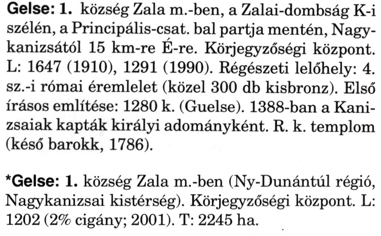Nyilvános 2259 | 6323 | A szócikkek felismertetett szövege: | (A csillag után a kiegészítő kötetből származó szöveg következik) Gelse: 1. község Zala m.-ben, a Zalai-dombság K-i szélén, a Principális-csat, bal partja mentén, Nagykanizsától 15 km-re É-re. Körjegyzőségi központ. L: 1647 (1910), 1291 (1990). Régészeti lelőhely: 4. sz.-i római éremlelet (közel 300 db kisbronz). Első írásos említése: 1280 k. (Guelse). 1388-ban a Kanizsaiak kapták királyi adományként. R. k. templom (késő barokk, 1786). *Gelse: 1. község Zala m.-ben (Ny-Dunántúl régió, Nagykanizsai kistérség). Körjegyzőségi központ. L: 1202 (2% cigány; 2001). T: 2245 ha. A szócikkek a következő lexikonból származnak: Cím: Magyar nagylexikon Közreműködő: Élesztős László (1949) (szerk.) ; Barabás Éva (1943) (szerk.) ; Berényi Gábor (1946) (szerk.) ; Bárány Lászlóné (szerk.) ; Adelmann-né Kertész Judit (1945) (közrem.) ; Froemel Károlyné Jáky Éva (1936) (közrem.) ; Akadémiai Kiadó és Nyomda Vállala Szerz. közl.: [... Élesztős László főszerk.] ; [szerk. Barabás Éva et al.] ; [bibliogr. Adelmanné Kertész Judit] ; [kész. az Akadémiai Kiadó Magyar Nagylexikon Szerkesztőségében] Kiadás: Budapest : Akad. K., 1993- Kötetei: 1. köt., A - Anc 2. köt., And - Bag 3. köt., Bah - Bij 4. köt., Bik - Bz 5. köt., C - Csem 6. köt., Csen - Ec 7. köt., Ed - Fe 8. köt., Ff - Gyep 9. köt., Gyer - Iq 10. köt., Ir - Kip 11. köt., Kir - Lem 12. köt., Len - Mep 13. köt., Mer - Nyk 14. köt., Nyl - Pom 15. köt., Pon - Sek 16. köt., Sel - Szö 17. köt., Szp - Ung 18. köt., Unh - Z 19. köt., Kiegészítő kötet, A - Z ETO jelzet: 030=945.11 Szakjelzet: 030 Cutter: M 14 ISBN: 963-05-6611-7 [!ISBN 963-05-6615-X] Nyelv: magyar Megjegyzés: Az 5. kötettől kiad. a Magyar Nagylexikon Kiadó ; A 6. kötettől főszerk. Berényi Gábor ; A 6. kötettől szakszerk. Bárány Lászlóné et al. ; A 6. kötettől bibliogr. Froemel Károlyné ; Bibliogr. a szócikkek végén |