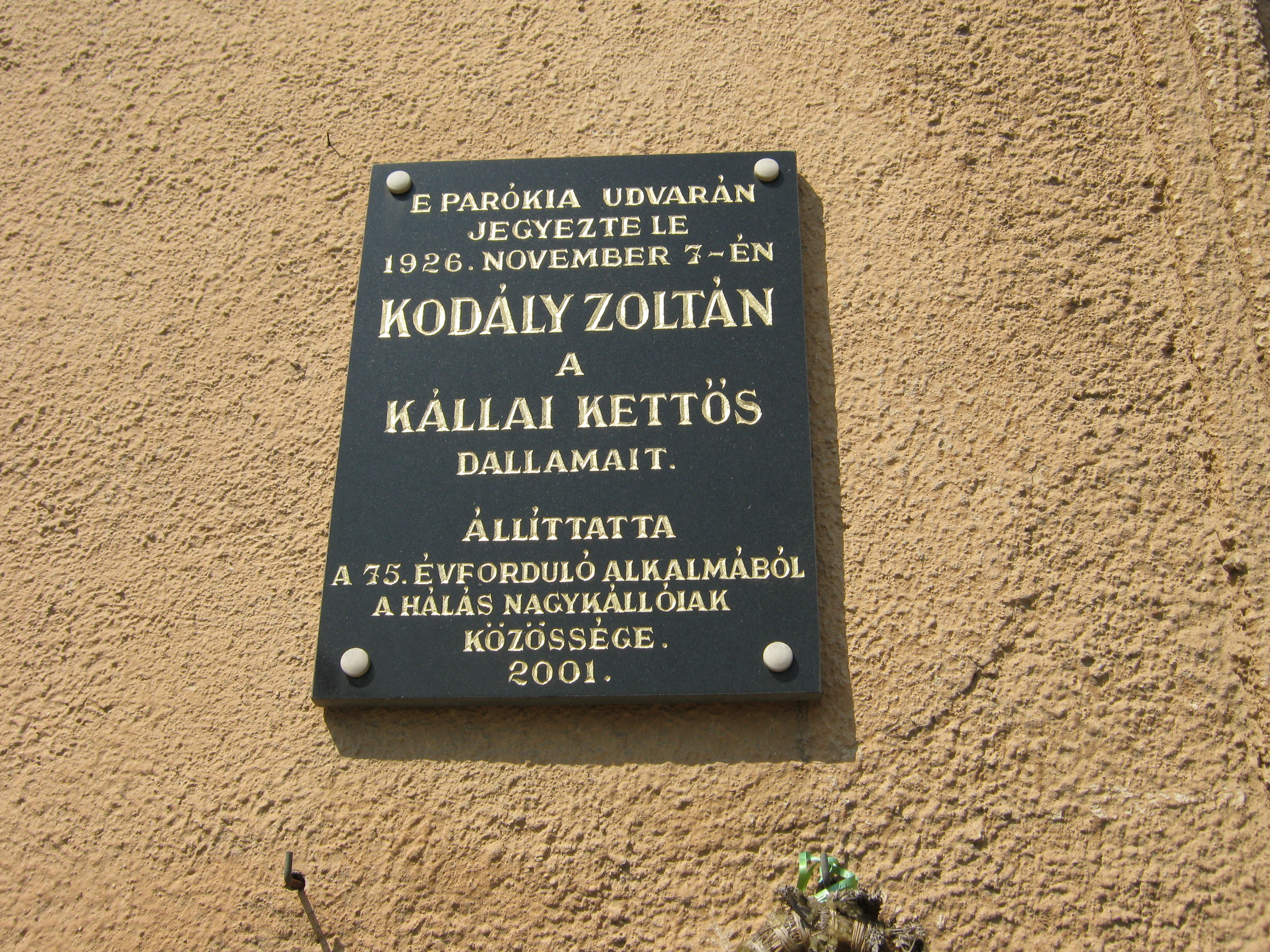 Nyilvános 793 | 1302 | Nagykálló, Nagybalkányi út 1. | A református templom háta mögött áll a parókia földszintes otthona, ami ma lakatlannak tűnik. Homlokzatán emléktábla jelzi, hogy 1926. november 7-én Kodály Zoltán itt jegyezte le a "Kállai kettős" dallamait. Az akkori református lelkész, ifj. Görömbey Péter látta vendégül. A középkori eredetű páros tánc népi formájában ma is él Nagykálló művészeti együtteseinek köszönhetően, Kodály Zoltán által negyedszázaddal később feldolgozott változata pedig a Magyar Állami Népi Együttes előadásában az egész világon ismertté tette Nagykálló nevét. Érdemes a ház kapcsán megemlékezni id. és ifj. Görömbey Péterről. Az apa 1876-tól 43 éven át volt a nagykállói reformátusok lelkésze, s jelentős egyházi szakírói tevékenységet fejtett ki. Ifj. Görömbey Péter atyja nyomdokait követő, rendkívüli műveltségű, hét nyelven beszélő lelkész és tanár volt. Jó barátságban állt Móricz Zsigmonddal, aki róla mintázta Fáklya című regényének főhősét. Felh. irod.: Harsányi Gézáné: Kálló kincsei. Nagykálló, 2007 A fénykép 2010 augusztus elején készült. |