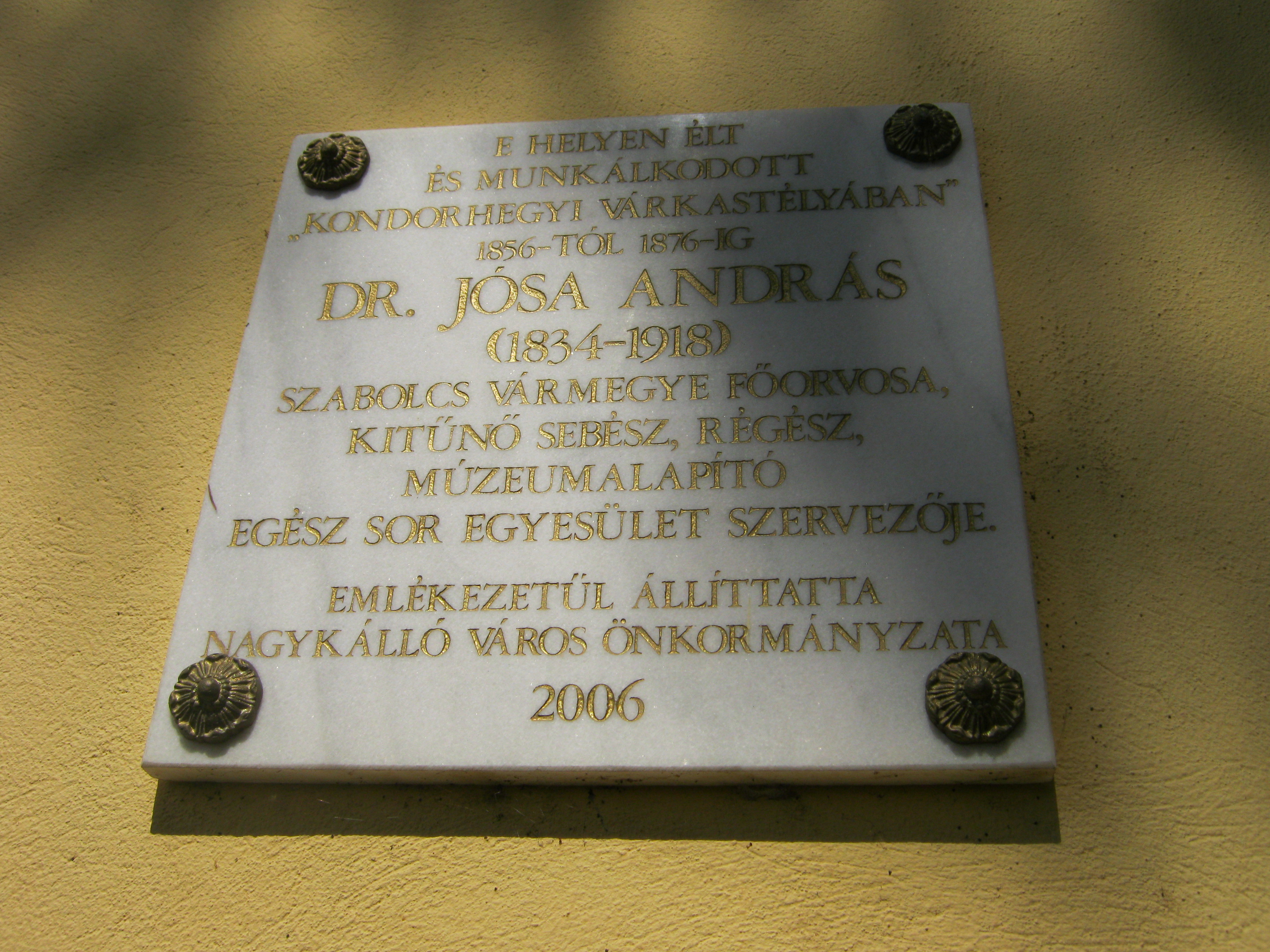 Nyilvános 757 | 1090 | Nagykálló, Somogyi B. út 5-7. | Ma a Polgármesteri Hivatal működik itt, ahol egykor dr. Jósa András orvos, múzeumlapító élt. Jósa fiatal orvosként az 1860-as évek közepén telepedett le Nagykállóban, ahol Korányi Frigyes örökébe lépett. Nagykállóhoz erős családi kötelékek is fűzték: egyik őse kállói várkapitány volt, apai nagyapja pedig a vármegye első főorvosa. Dr. Jósa két évtizedet töltött itt legendássá váló gyakorló orvosként. Itt alapított családot: hat leánya született, akiket "orgonasípok"-nak nevezett :). Házasságkötése után vásárolta meg ezt az azóta átépített kúriát, amelyet - Nagykálló e részének neve után - tréfásan kondorhegyi várkastélyaként emlegetett. Rendkívül széles egyéniségű és sokoldalú ember volt. Hogy kórházának pénzt szerezzen, felvirágoztatta a településen a műkedvelő színjátszást. Mellette fúrt-faragott, később beletanult a régészeti kutatásokba. Amikor a vármegye székhelyét Nyíregyházára tették át, ő is odaköltözött (lásd: Nyíregyháza, Malom utca 3.). Felh. irod.: Harsányi Gézáné: Kálló kincsei. Nagykálló, 2007 Harsányi Gézáné: Nagykálló porában. Dr. Jósa András nyomában. = A nyíregyházi Jósa András Múzeum évkönyve 2008 |