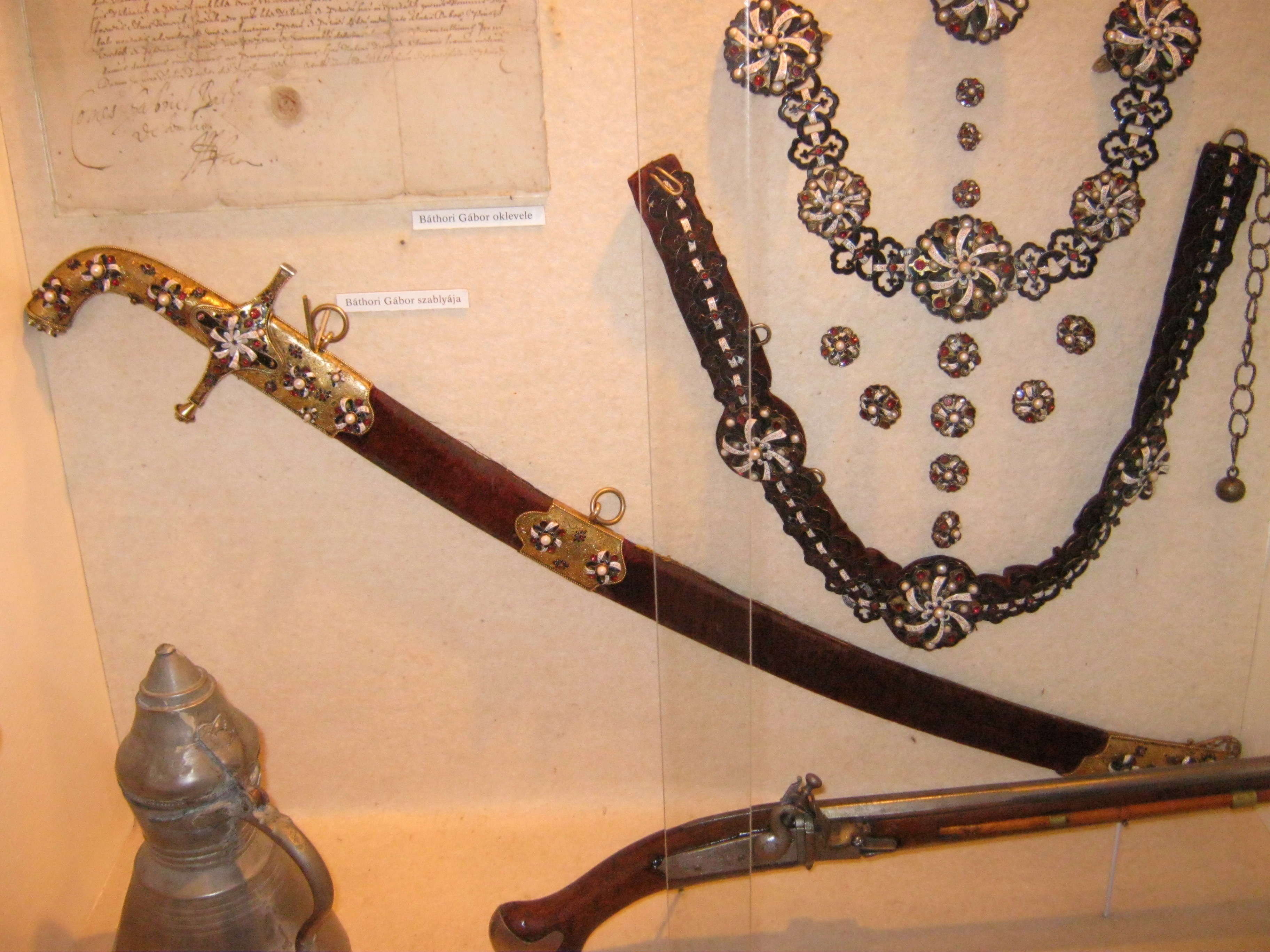 Nyilvános 947 | 1603 | Nyírbátor, Károlyi utca 21. Báthori István Múzeum | A minorita kolostor épültét 1959-ben kapta meg a múzeum. Első igazgatója, Szalontai Barnabás áldozatos munkája nyomán két év múlva már meg is nyílhatott benne az első kiállítás. A képen a múzeum legnagyobb kincsei közé tartozó relikvia, Báthori Gábor erdélyi fejedelem szablyája látható a korból származó sisakforgó, mentekötő, menteöv és a hozzá tartozó gombok társaságában. Balra Báthori Gábor oklevele. Felh. irod.: Látnivalók Szabolcs-Szatmár-Bereg megyében. Miskolc, Well-PRess, 1999 www.nyirbim.hu A fénykép 2010 augusztus elején készült. |