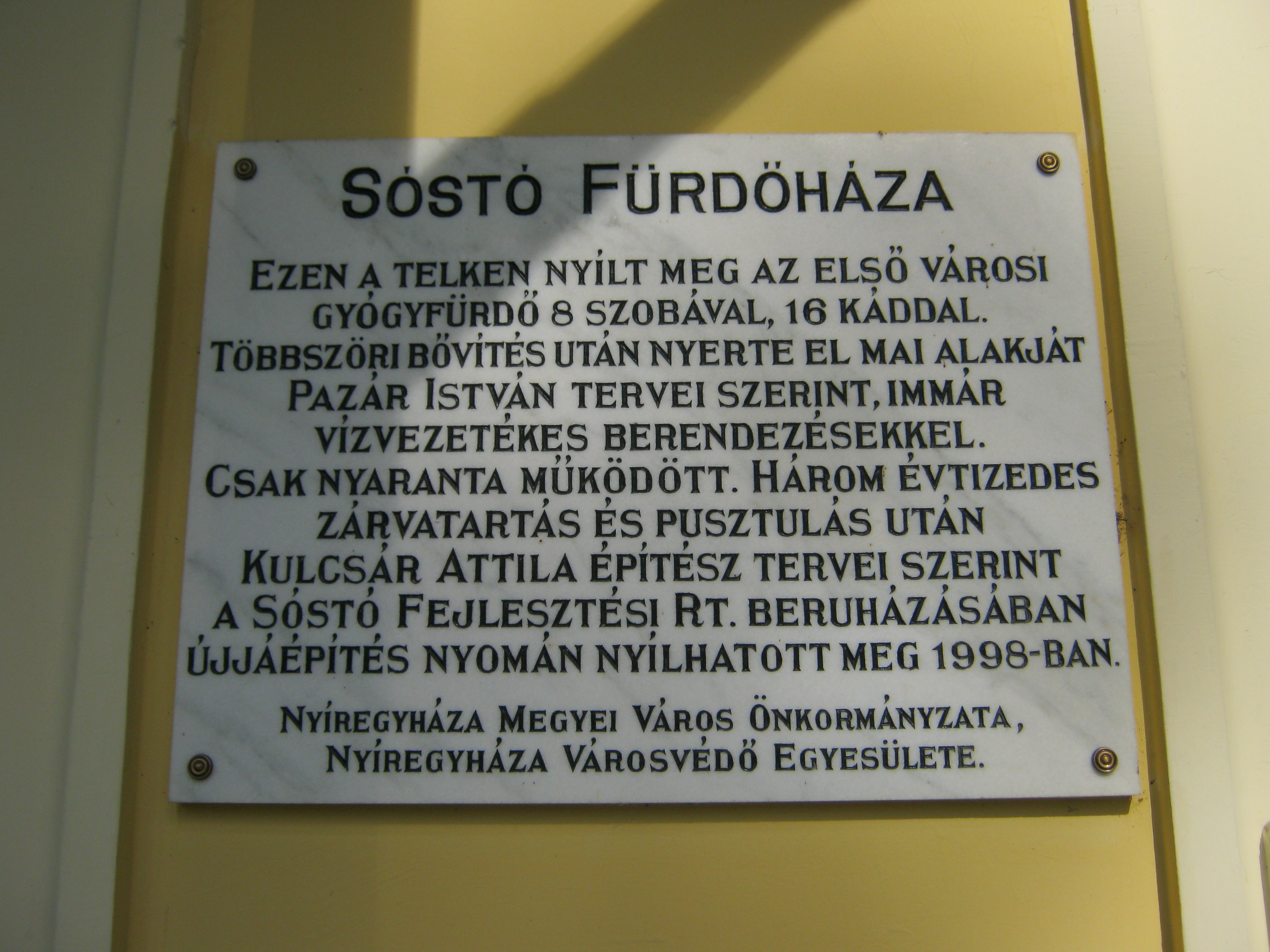 Nyilvános 920 | 1438 | Nyíregyháza-Sóstó, Fürdőház | A várostól 5 kilométerre fekvő Sóstó kedves kirándulóhelye a nyíregyháziaknak. A képen az első fürdőház műemlékké nyilvánított épülete látható.Ezen a helyen nyílt meg az első városi gyógyfürdő 1805-ben. Többszöri bővítés után mai alakját Pazár István tervei alapján 1911-ben nyerte el. Az 1970-es évek közepe után üresen álló, egyre jobban lepusztuló épületet 1997/98-ban újították fel. A fénykép 2010 augusztus elején készült |