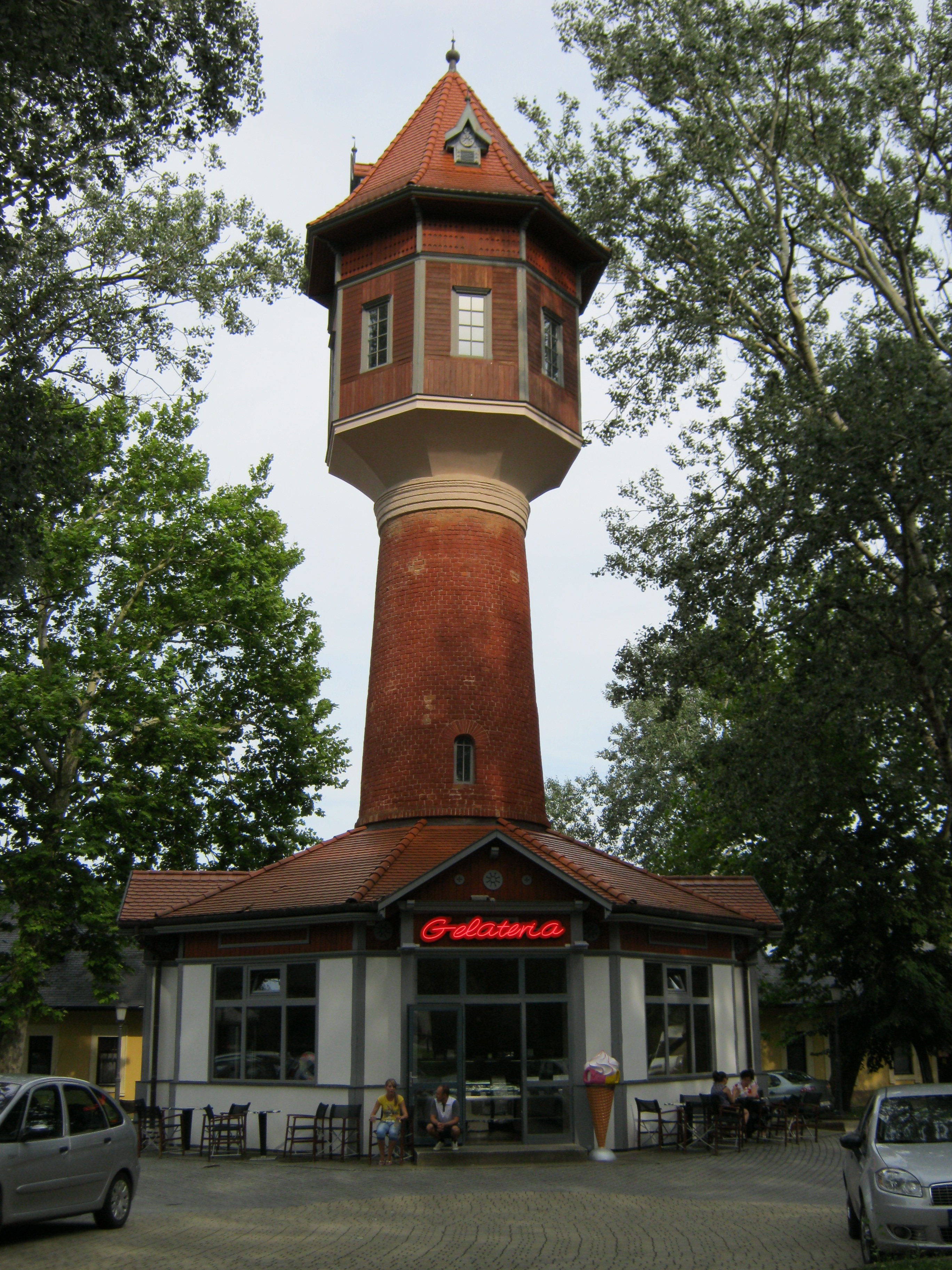 Nyilvános 1042 | 4204 | Nyíregyháza-Sóstó, Víztorony | Sóstófürdő szimbóluma a szintén Pazár István által 1911-ben tervezett víztorony. A felfelé keskenyedő vörös téglaoszlopot kiszélesedő, nyolcszögletű toronyrész koronázza. A 60 köbméteres víztorony ma már nem működik, ipari műemlékké nyilvánították. Földszintjén idegenforgalmi iroda és pizzabár működik. Felh. irod.: Látnivalók Szabolcs-Szatmár-Bereg megyében. Miskolc, Well-PRess, 1990 A fénykép 2010 augusztus elején készült |