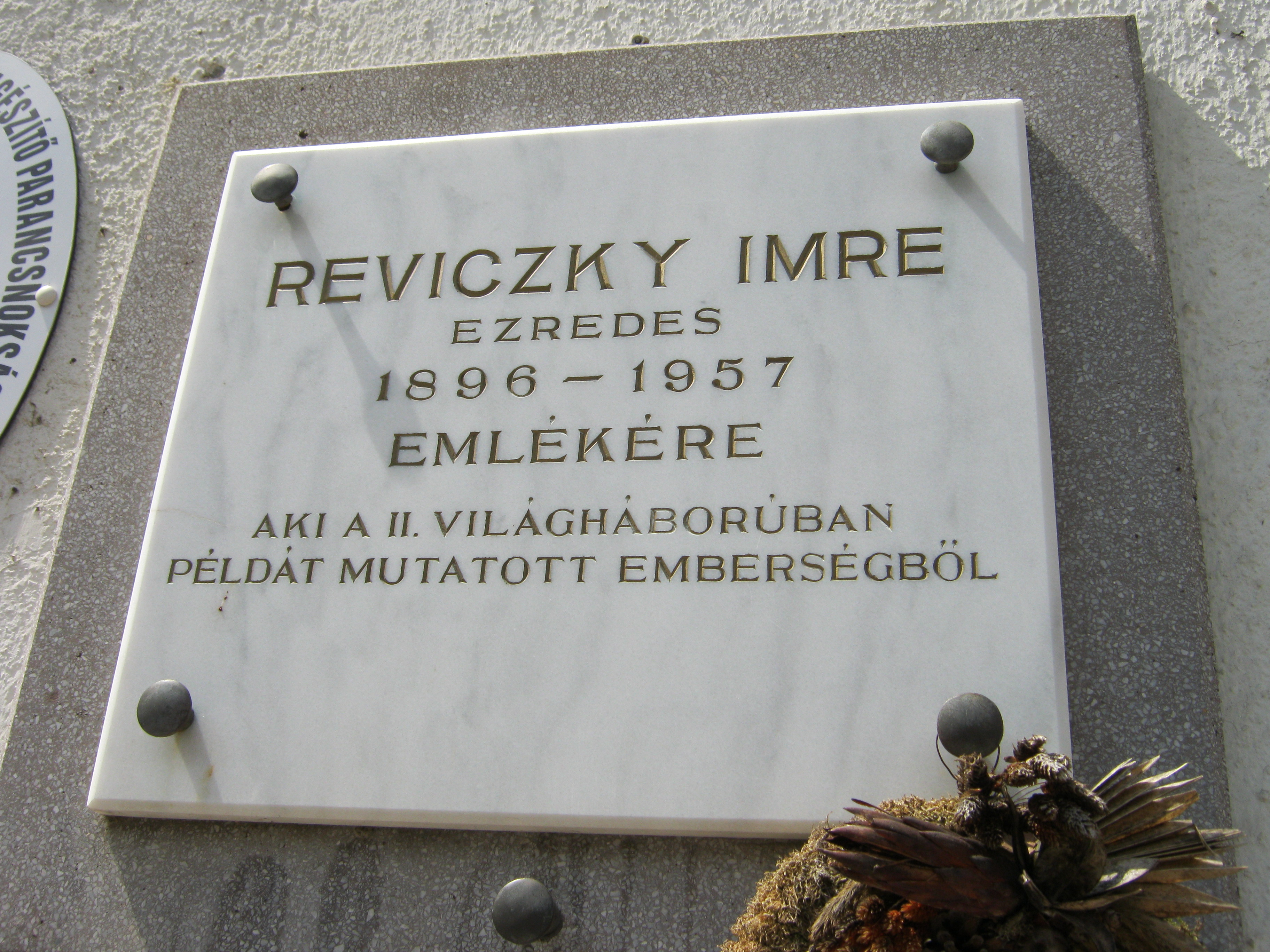 Nyilvános 971 | 1612 | Nyíregyháza, Bessenyei tér 15. | A Kállay-kúriában a Kelet-Magyarországi Hadkiegészítő Parancsnokság működik. Homlokzatán márványtábla emlékezik Reviczky Imre (1896-1957) ezredesre. Reviczky azon hivatásos katonatisztek egyike volt, akik a második világháború végén nem voltak hajlandók a kiszolgáltatott munkaszolgálatosokat német-fasiszta módszerekkel kezelni, hanem igyekezett a sok-sok ember kegyetlenre méretezett sorsán enyhíteni, sokszor nem is sikertelenül. Ezért került sor letartóztatására is, de a felelősségre vonás elől meg tudott szökni. A háború után ebben a házban szolgált, mint megyei kiegészítő parancsnok. 1950-ben nyugdíjazták, 1952-ben megvonták nyugellátását, így 1956-ig szénkihordóként gondoskodott családjáról. 1956-ban rehabilitálták ugyan, de 1957 februárjában meghalt. Életéről fia, Reviczky Ádám írt könyvet Vesztes háborúk - megnyert csaták címmel (Magvető, 1985). Felh. irod.: Margócsy József: Utcák, terek, emléktáblák. Nyíregyháza - Bp., 1984 A fénykép 2010 augusztus elején készült. |
