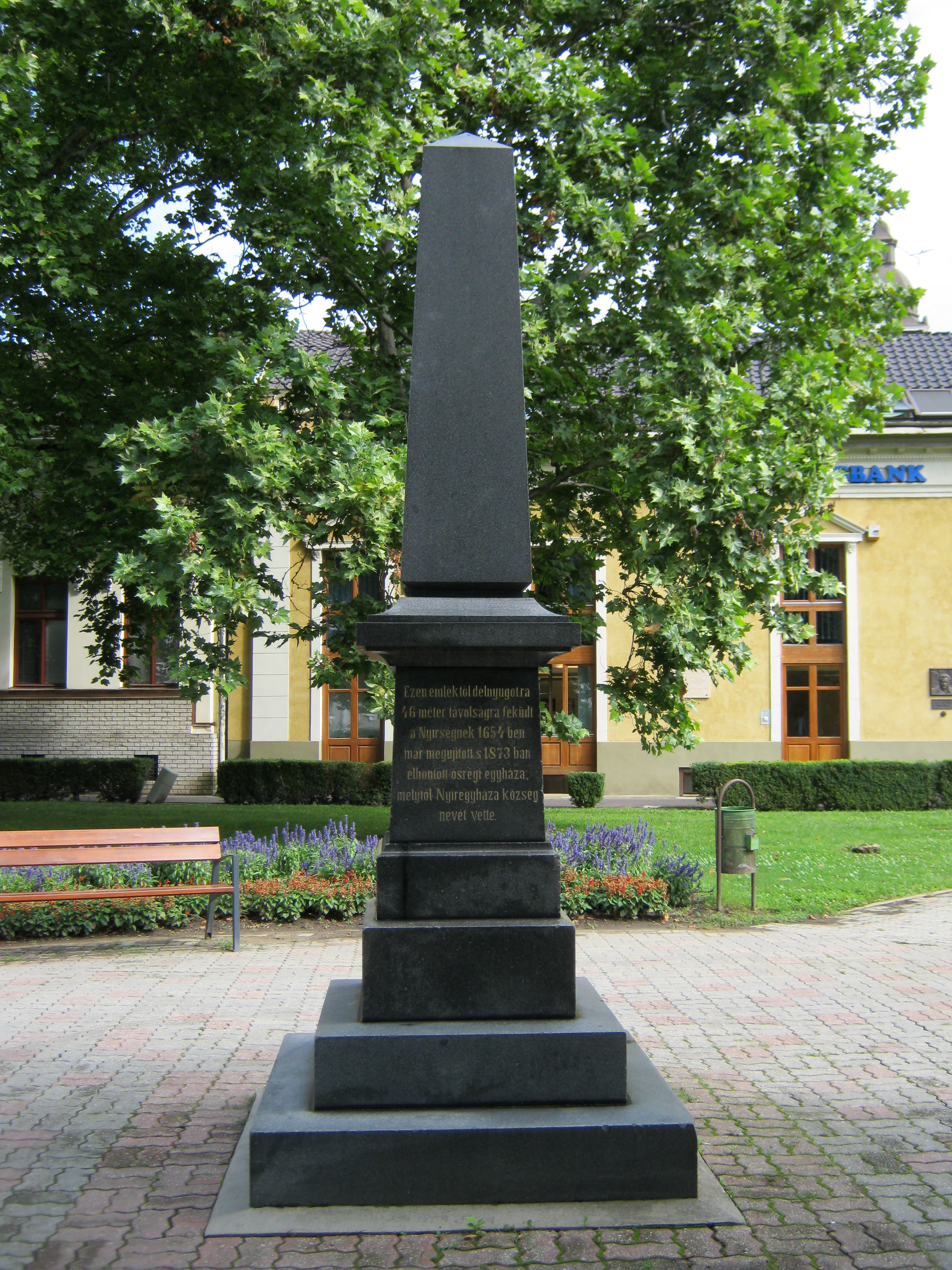 Nyilvános 952 | 1766 | Nyíregyháza, Kálvin tér: A református templom emlékoszlopa | Nyíregyháza legrégibb történetére a 'honfoglalás ezredéves ünneplése alkalmából' emelt obeliszk emlékeztet a Kálvin téren, a mai református templom közelében. Az oszlop egyik feliratából kiderül, hogy 'ezen emléktől délnyugatra 46 méter távolságra feküdt a Nyírségnek 1654-ben már megújított s 1873-ban elbontott ősrégi egyháza, melytől Nyíregyháza község nevét vette'. Az obeliszket a vármegye díszközgyűlése keretében, 1896. május 11-én Mikecz János alispán ünnepi beszédét követően leplezték le, majd a város nevében Bencs László polgármester vette át. A harmadik feliratot a honfoglalás 1100. évfordulóján a város elöljárói vésették az obeliszkre. Felh. irod.: www.beszelamarvany.lapunk.hu A felvétel 2010 augusztus elején készült |