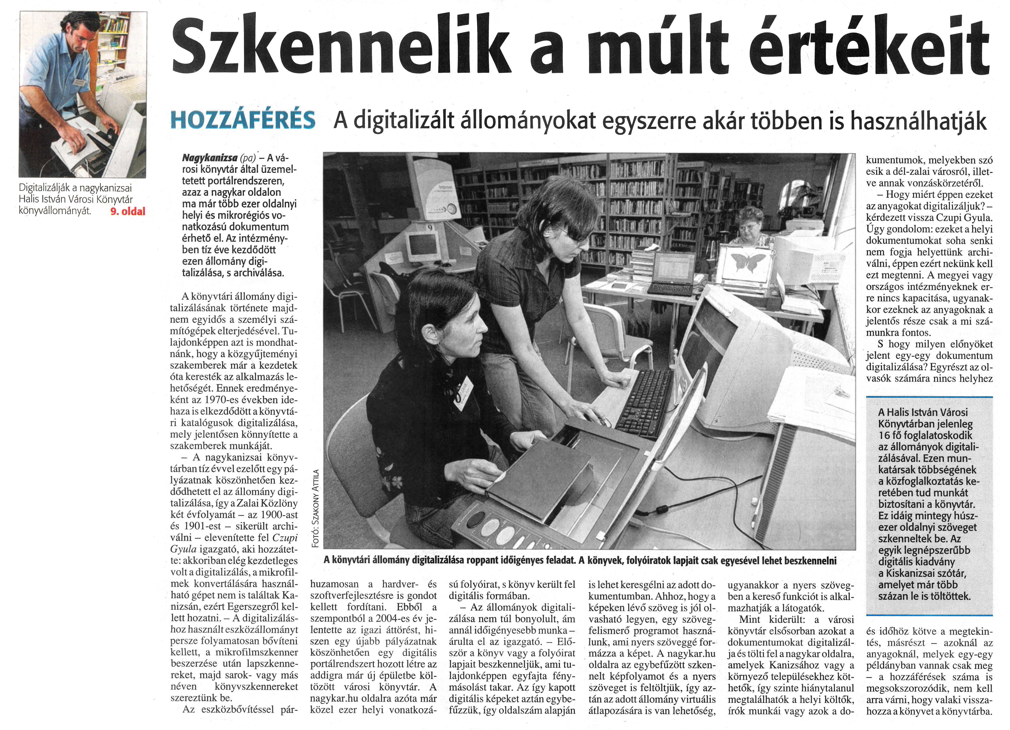 Nyilvános 1116 | 1525 | Zalai Hírlap 2009.10.08. 236. szám 9. oldal - Szkennelik a múlt értékeit | A cikk szövege: Digitalizálják a nagykanizsai Halis István Városi Könyvtár könyvállományát. 9. oldal Szkennelik a múlt értékeit A könyvtári állomány digitalizálása roppant időigényes feladat. A könyvek, folyóiratok lapjait csak egyesével lehet beszkennelni HOZZÁFÉRÉS A digitalizált állományokat egyszerre akar többen is használhatják Nagykanizsa (pa) - A városi könyvtár által üzemeltetett portálrendszeren, azaz a nagykar oldalon ma már több ezer oldalnyi helyi és mikrorégiós vonatkozású dokumentum érhető el. Az intézményben tíz éve kezdődött ezen állomány digitalizálása, s archiválása. A könyvtári állomány digitalizálásának története majdnem egyidős a személyi számítógépek elterjedésével. Tulajdonképpen azt is mondhatnánk, hogy a közgyűjteményi szakemberek már a kezdetek óta keresték az alkalmazás lehetőségét. Ennek eredményeként az 1970-es években idehaza is elkezdődött a könyvtári katalógusok digitalizálása, mely jelentősen könnyítette a szakemberek munkáját. - A nagykanizsai könyvtárban tíz évvel ezelőtt egy pályázatnak köszönhetően kezdődhetett el az állomány digitalizálása, így a Zalai Közlöny két évfolyamát - az 1900-ast és 190l-est - sikerült archiválni - elevenítette fel Czupi Gyula igazgató, aki hozzátette: akkoriban elég kezdetleges volt a digitalizálás, a mikrofilmek konvertálására használható gépet nem is találtak Kanizsán, ezért Egerszegről kellett hozatni. - A digitalizáláshoz használt eszközállományt persze folyamatosan bővíteni kellett, a mikrofilmszkenner beszerzése után lapszkennereket, majd sarok- vagy más néven könyvszkennereket szereztünk be. Az eszközbővítéssel párhuzamosan a hardver- és szoftverfejlesztésre is gondot kellett fordítani. Ebből a szempontból a 2004-es év jelentette az igazi áttörést, hiszen egy újabb pályázatnak köszönhetően egy digitális portálrendszert hozott létre az addigra már új épületbe költözött városi könyvtár. A nagykar.hu oldalra azóta már közel ezer helyi vonatkozású folyóirat, s könyv került fel digitális formában. - Az állományok digitalizálása nem túl bonyolult, ám annál időigényesebb munka -árulta el az igazgató. - Először a könyv vagy a folyóirat lapjait beszkenneljük, ami tulajdonképpen egyfajta fénymásolást takar. Az így kapott digitális képeket aztán egybefűzzük, így oldalszám alapján is lehet keresgélni az adott dokumentumban. Ahhoz, hogy a képeken lévő szöveg is jól olvasható legyen, egy szövegfelismerő programot használunk, ami nyers szöveggé formázza a képet. A nagykar.hu oldalra az egybefűzött szkennert képfolyamot és a nyers szöveget is feltöltjük, így aztán az adott állomány virtuális átlapozására is van lehetőség, ugyanakkor a nyers szövegben a kereső funkciót is alkalmazhatják a látogatók. Mint kiderült: a városi könyvtár elsősorban azokat a dokumentumokat digitalizálja és tölti fel a nagykar oldalra, amelyek Kanizsához vagy a környező településekhez köthetők, így szinte hiánytalanul megtalálhatók a helyi költők, írók munkái vagy azok a dokumentumok, melyekben szó esik a dél-zalai városról, illetve annak vonzáskörzetéről. - Hogy miért éppen ezeket az anyagokat digitalizáljuk? -kérdezett vissza Czupi Gyula. Úgy gondolom: ezeket a helyi dokumentumokat soha senki nem fogja helyettünk archiválni, éppen ezért nekünk kell ezt megtenni. A megyei vagy országos intézményeknek erre nincs kapacitása, ugyanakkor ezeknek az anyagoknak a jelentős része csak a mi számunkra fontos. S hogy milyen előnyöket jelent egy-egy dokumentum digitalizálása? Egyrészt az olvasók számára nincs helyhez A Halis István Városi Könyvtárban jelenleg 16 fő foglalatoskodik az állományok digitalizálásával. Ezen munkatársak többségének a közfoglalkoztatás keretében tud munkát biztosítani a könyvtár. Ez idáig mintegy húszezer oldalnyi szöveget szkenneltek be. Az egyik legnépszerűbb digitális kiadvány a Kiskanizsai szótár, amelyet már több százan le is töltöttek. és időhöz kötve a megtekintés, másrészt - azoknál az anyagoknál, melyek egy-egy példányban vannak csak meg - a hozzáférések száma is megsokszorozódik, nem kell arra várni, hogy valaki visszahozza a könyvet a könyvtárba. |