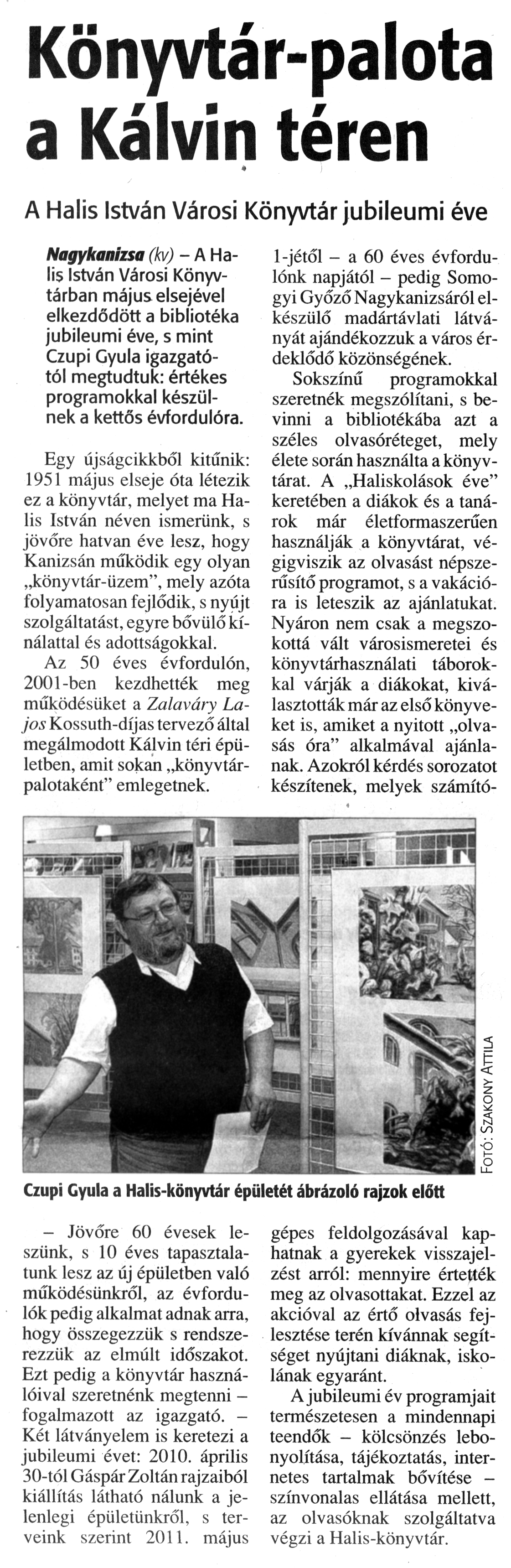 Nyilvános 1121 | 1740 | Zalai Hírlap 2010. május 10. 107. szám 7. oldal - Könyvtár-palota a Kálvin téren | A cikk szövege: Könyvtár-palota a Kálvin téren A Halis István Városi Könyvtár jubileumi éve Nagykanizsa (kv) - A Halis István Városi Könyvtárban május elsejével elkezdődött a bibliotéka jubileumi éve, s mint Czupi Gyula igazgatótól megtudtuk: értékes programokkal készülnek a kettős évfordulóra. Egy újságcikkből kitűnik: 1951 május elseje óta létezik ez a könyvtár, melyet ma Halis István néven ismerünk, s jövőre hatvan éve lesz, hogy Kanizsán működik egy olyan „könyvtár-üzem”, mely azóta folyamatosan fejlődik, s nyújt szolgáltatást, egyre bővülő kínálattal és adottságokkal. Az 50 éves évfordulón, 2001-ben kezdhették meg működésüket a Zalaváry Lajos Kossuth-díjas tervező által megálmodott Kálvin téri épületben, amit sokan „könyvtárpalotaként" emlegetnek. - Jövőre 60 évesek leszünk, s 10 éves tapasztalatunk lesz az új épületben való működésünkről, az évfordulók pedig alkalmat adnak arra, hogy összegezzük s rendszerezzük az elmúlt időszakot. Ezt pedig a könyvtár használóival szeretnénk megtenni -fogalmazott az igazgató. -Két látványelem is keretezi a jubileumi évet: 2010. április 30-tól Gáspár Zoltán rajzaiból kiállítás látható nálunk a jelenlegi épületünkről, s terveink szerint 2011. május 1-jétől - a 60 éves évfordulónk napjától - pedig Somogyi Győző Nagykanizsáról elkészülő madártávlati látványát ajándékozzuk a város érdeklődő közönségének. Sokszínű programokkal szeretnék megszólítani, s bevinni a bibliotékába azt a széles olvasóréteget, mely élete során használta a könyvtárat. A „Haliskolások éve” keretében a diákok és a tanárok már életformaszerűen használják a könyvtárat, végigviszik az olvasást népszerűsítő programot, s a vakációra is leteszik az ajánlatukat. Nyáron nem csak a megszokottá vált városismeretei és könyvtárhasználati táborokkal várják a diákokat, kiválasztották már az első könyveket is, amiket a nyitott „olvasás óra" alkalmával ajánlanak. Azokról kérdés sorozatot készítenek, melyek számítógépes feldolgozásával kaphatnak a gyerekek visszajelzést arról: mennyire értették meg az olvasottakat. Ezzel az akcióval az értő olvasás fejlesztése terén kívánnak segítséget nyújtani diáknak, iskolának egyaránt. A jubileumi év programjait természetesen a mindennapi teendők - kölcsönzés lebonyolítása, tájékoztatás, internetes tartalmak bővítése -színvonalas ellátása mellett, az olvasóknak szolgáltatva végzi a Halis-könyvtár. Czupi Gyula a Halis-könyvtár épületét ábrázoló rajzok előtt |