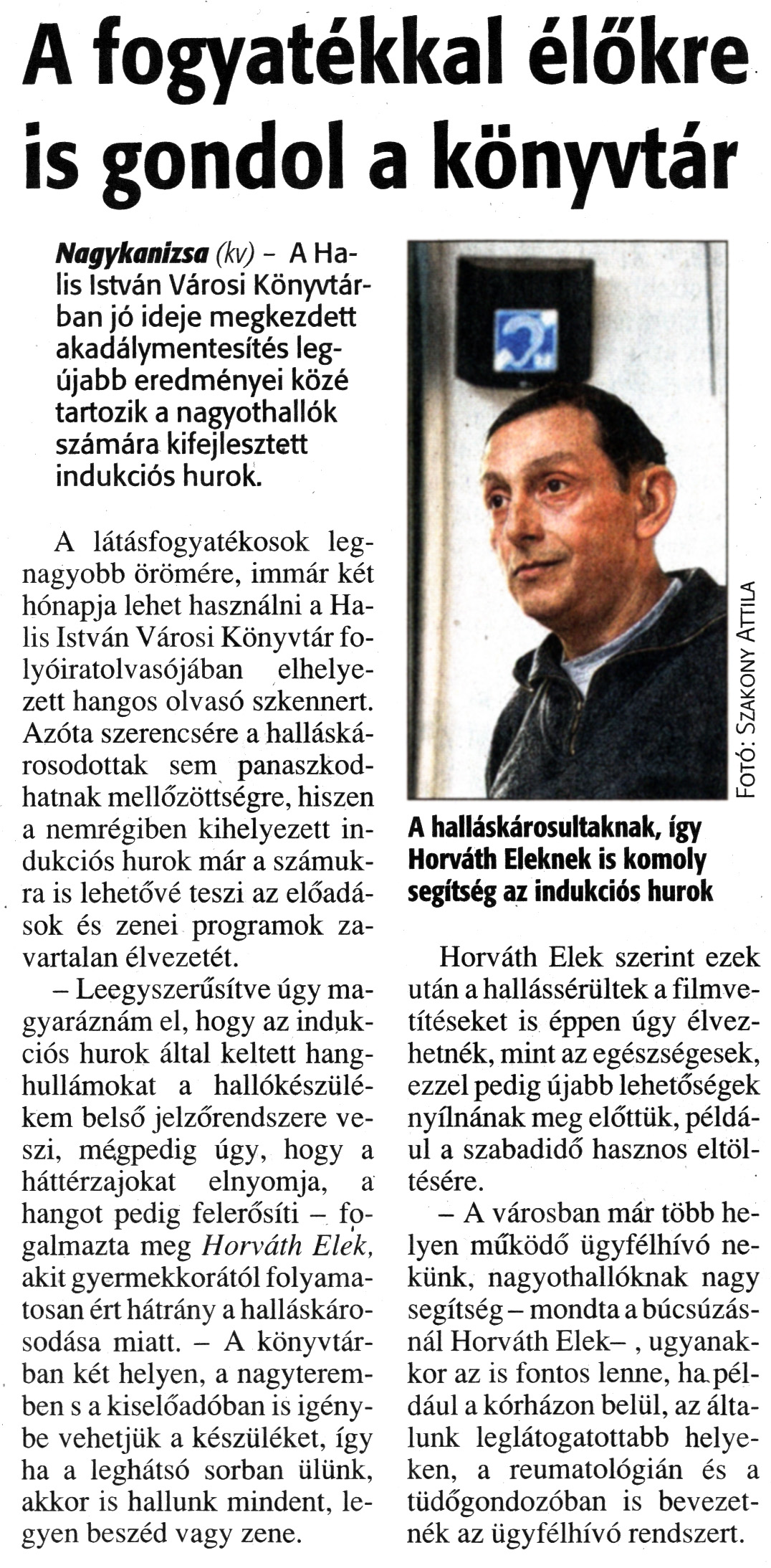 Nyilvános 1770 | 4664 | Zalai Hírlap 2011. január 14. 11. szám 11. oldal - A fogyatékkal élőkre is gondol a könyvtár | A cikk szövege: A fogyatékkal élőkre is gondol a könyvtár Nagykanizsa (kv) - A Halis István Városi Könyvtárban jó ideje megkezdett akadálymentesítés legújabb eredményei közé tartozik a nagyothallók számára kifejlesztett indukciós hurok. A látásfogyatékosok legnagyobb örömére, immár két hónapja lehet használni a Halis István Városi Könyvtár folyóiratolvasójában elhelyezett hangos olvasó szkennert. Azóta szerencsére a halláskárosodottak sem panaszkodhatnak mellőzöttségre, hiszen a nemrégiben kihelyezett indukciós hurok már a számukra is lehetővé teszi az előadások és zenei programok zavartalan élvezetét. - Leegyszerűsítve úgy magyaráznám el, hogy az indukciós hurok által keltett hanghullámokat a hallókészülékem belső jelzőrendszere veszi, mégpedig úgy, hogy a háttérzajokat elnyomja, a hangot pedig felerősíti - fogalmazta meg Horváth Elek, akit gyermekkorától folyamatosan ért hátrány a halláskárosodása miatt. - A könyvtárban két helyen, a nagyteremben s a kiselőadóban is igénybe vehetjük a készüléket, így ha a leghátsó sorban ülünk, akkor is hallunk mindent, legyen beszéd vagy zene. A halláskárosultaknak, így Horváth Eleknek is komoly segítség az indukciós hurok Horváth Elek szerint ezek után a hallássérültek a filmvetítéseket is éppen úgy élvezhetnék, mint az egészségesek, ezzel pedig újabb lehetőségek nyílnának meg előttük, például a szabadidő hasznos eltöltésére. - A városban már több helyen működő ügyfélhívó nekünk, nagyothallóknak nagy segítség - mondta a búcsúzásnál Horváth Elek –, ugyanakkor az is fontos lenne, ha például a kórházon belül, az általunk leglátogatottabb helyeken, a reumatológián és a tüdőgondozóban is bevezetnék az ügyfélhívó rendszert. Fotó: Szakony Attila |