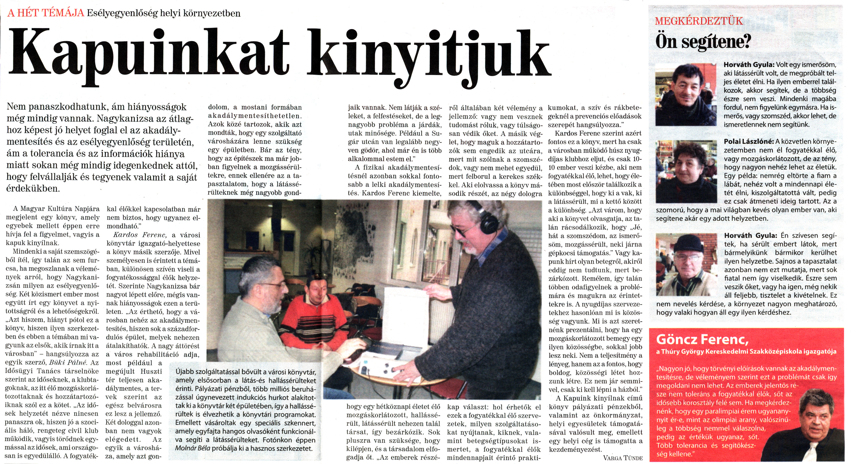 Nyilvános 1857 | 6551 | Nagykanizsai Maraton 2011. január 21. 3. szám 6-7. oldal - Kapuinkat kinyitjuk | A cikk szövege: A HÉT TÉMÁJA Esélyegyenlőség helyi környezetben Kapuinkat kinyitjuk Nem panaszkodhatunk, ám hiányosságok még mindig vannak. Nagykanizsa az átlaghoz képest jó helyet foglal el az akadálymentesítés és az esélyegyenlőség területén, ám a tolerancia és az információk hiánya miatt sokan még mindig idegenkednek attól, hogy felvállalják és tegyenek valamit a saját érdekükben. A Magyar Kultúra Napjára megjelent egy könyv, amely egyebek mellett éppen erre hívja fel a figyelmet, vagyis a kapuk kinyílnak. Mindenki a saját szemszögéből ítél, így talán az sem furcsa, ha megoszlanak a vélemények arról, hogy Nagykanizsán milyen az esélyegyenlőség. Két közismert ember most együtt írt egy könyvet a nyitottságról és a lehetőségekről. „Azt hiszem, hiányt pótol ez a könyv, hiszen ilyen szerkezetben és ebben a témában mi vagyunk az elsők, akik írnak itt a városban" - hangsúlyozza az egyik szerző, Büki Pálné. Az Idősügyi Tanács társelnöke szerint az időseknek, a klubtagoknak, az itt élő mozgáskorlátozottaknak és hozzátartozóiknak szól ez a kötet. „Az idősek helyzetét nézve nincsen panaszra ok. hiszen jó a szociális háló, rengeteg civil klub működik, vagyis törődnek egymással az idősek, ami országosan is egyedülálló. A fogyatékkal élőkkel kapcsolatban már nem biztos, hogy ugyanez elmondható." Kardos Ferenc, a városi könyvtár igazgató-helyettese a könyv másik szerzője. Mivel személyesen is érintett a témában, különösen szívén viseli a fogyatékossággal élők helyzetét. Szerinte Nagykanizsa bár nagyot lépett előre, mégis vannak hiányosságok ezen a területen. „Az érthető, hogy a városban nehéz az akadálymentesítés, hiszen sok a századfordulós épület, melyek nehezen átalakíthatók. A nagy áttörést a város rehabilitáció adja, most például a megújult Huszti tér teljesen akadálymentes, a tervek szerint az egész belvárosra ez lesz a jellemző. Két dologgal azonban nem vagyok elégedett. Az egyik a városháza, amely azt gondolom, a mostani formában akadály mentesít hetet len. Azok közé tartozok, akik azt mondták, hogy egy szolgáltató városházára lenne szükség egy épületben. Bár az tény, hogy az építészek ma már jobban figyelnek a mozgássérültekre, ennek ellenére az a tapasztalatom, hogy a látássérülteknek még nagyobb gondjaik vannak. Nem látják a széleket, a felfestéseket, de a legnagyobb probléma a járdák, utak minősége. Például a Sugár utcán van legalább negyven gödör, ahol már én is több alkalommal estem el." A fizikai akadálymentesítésnél azonban sokkal fontosabb a lelki akadálymentesítés. Kardos Ferenc kiemelte, hogy egy hétköznapi életet élő mozgáskorlátozott, hallássérült, látássérült nehezen talál társat, így bezárkózik. Sok pluszra van szüksége, hogy kilépjen, és a társadalom elfogadja őt. „Az emberek részéről általában két vélemény a jellemző: vagy nem vesznek tudomást róluk, vagy túlságosan védik őket. A másik véglet, hogy maguk a hozzátartozók sem engedik az utcára, mert mit szólnak a szomszédok, vagy nem mehet egyedül, mert felborul a kerekes székkel. Aki elolvassa a könyv második részét, az négy dologra kap választ: hol érhetők el ezek a fogyatékkal élő szervezetek, milyen szolgáltatásokat nyújtanak, kiknek, valamint betegségtípusokat ismertet, a fogyatékkal élők mindennapjait érintő praktikumokat, a szív és rákbetegeknél a prevenciós előadások szerepét hangsúlyozza." Kardos Ferenc szerint azért fontos ez a könyv, mert ha csak a városban működő húsz nyugdíjas klubhoz eljut, és csak 10-10 ember veszi kézbe, aki nem fogyatékkal élő, lehet, hogy életében most először találkozik a különbséggel, hogy ki a vak, ki a látássérült, mi a kettő között a különbség. „Azt várom, hogy aki a könyvet olvasgatja, az talán rácsodálkozik, hogy „Jé, hát a szomszédom, az ismerősöm, mozgássérült, neki járna gépkocsi támogatás." Vagy kapunk hírt olyan betegről, akiről eddig nem tudtunk, mert bezárkózott. Remélem, így talán többen odafigyelnek a problémára és magukra az érintettekre is. A nyugdíjas szervezetekhez hasonlóan mi is közösség vagyunk. Mi is azt szeretnénk prezentálni, hogy ha egy mozgáskorlátozott bemegy egy ilyen közösségbe, sokkal jobb lesz neki. Nem a teljesítmény a lényeg, hanem az a fontos, hogy boldog, közösségi létet hozzunk létre. Ez nem jár semmivel, csak ki kell lépni a házból." A Kapuink kinyílnak című könyv pályázati pénzekből, valamint az önkormányzat, helyi egyesületek támogatásával valósult meg, emellett egy helyi cég is támogatta a kezdeményezést. Varga Tünde Újabb szolgáltatással bővült a városi könyvtár, amely elsősorban a látás-és hallássérülteket érinti. Pályázati pénzből, több milliós beruházással úgynevezett indukciós hurkot alakítottak kl a könyvtár két épületében, így a hallássérültek is élvezhetik a könyvtári programokat. Emellett vásároltak egy speciális szkennert, amely egyfajta hangos olvasóként funkcionálva segíti a látássérülteket. Fotónkon éppen Molnár Béla próbálja kl a hasznos szerkezetet. MEGKÉRDEZTÜK Ön segítene? Horváth Gyula: Volt egy Ismerősöm, aki látássérült volt, de megpróbált teljes életet élni. Ha ilyen emberrel találkozok, akkor segítek, de a többség észre sem veszi. Mindenki magába fordul, nem figyelünk egymásra. Ha ismerős, vagy szomszéd, akkor lehet, de ismeretlennek nem segítünk. Polai Lászlóné: A közvetlen környezetemben nem él fogyatékkal élő, vagy mozgáskorlátozott, de az tény, hogy nagyon nehéz lehet az életük. Egy példa: nemrég 