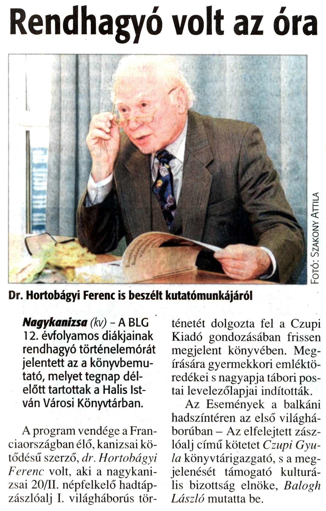Nyilvános 1876 | 5216 | Zalai Hírlap 2011. március 23. 68. szám 3. oldal - Rendhagyó volt az óra | A cikk szövege: Rendhagyó volt az óra Dr. Hortobágyi Ferenc is beszélt kutatómunkájáról Nagykanizsa (kv) - A BLG 12. évfolyamos diákjainak rendhagyó történelemórát jelentett az a könyvbemutató, melyet tegnap délelőtt tartottak a Halis István Városi Könyvtárban. A program vendége a Franciaországban élő, kanizsai kötődésű szerző, dr. Hortobágyi Ferenc volt, aki a nagykanizsai 20/II. népfelkelő hadtápzászlóalj I. világháborús történetét dolgozta fel a Czupi Kiadó gondozásában frissen megjelent könyvében. Megírására gyermekkori emléktöredékei s nagyapja tábori postai levelezőlapjai indították. Az Események a balkáni hadszíntéren az első világháborúban - Az elfelejtett zászlóalj című kötetet Czupi Gyula könyvtárigazgató, s a megjelenését támogató kulturális bizottság elnöke, Balogh László mutatta be. Fotó: Szakony Attila |