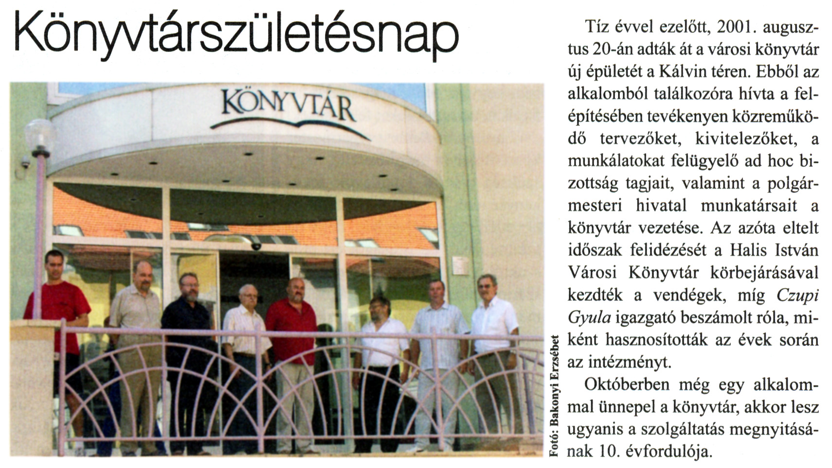 Nyilvános 2730 | 9010 | Kanizsa 2011. szeptember 1. 28. szám 4. oldal - Könyvtárszületésnap | Könyvtárszületésnap Tíz évvel ezelőtt, 2001. augusztus 20-án adták át a városi könyvtár új épületét a Kálvin téren. Ebből az alkalomból találkozóra hívta a felépítésében tevékenyen közreműködő tervezőket, kivitelezőket, a munkálatokat felügyelő ad hoc bizottság tagjait, valamint a polgármesteri hivatal munkatársait a könyvtár vezetése. Az azóta eltelt időszak felidézését a Halis István Városi Könyvtár körbejárásával kezdték a vendégek, míg Czupi Gyula igazgató beszámolt róla, miként hasznosították az évek során az intézményt. Októberben még egy alkalommal ünnepel a könyvtár, akkor lesz ugyanis a szolgáltatás megnyitásának 10. évfordulója. |
