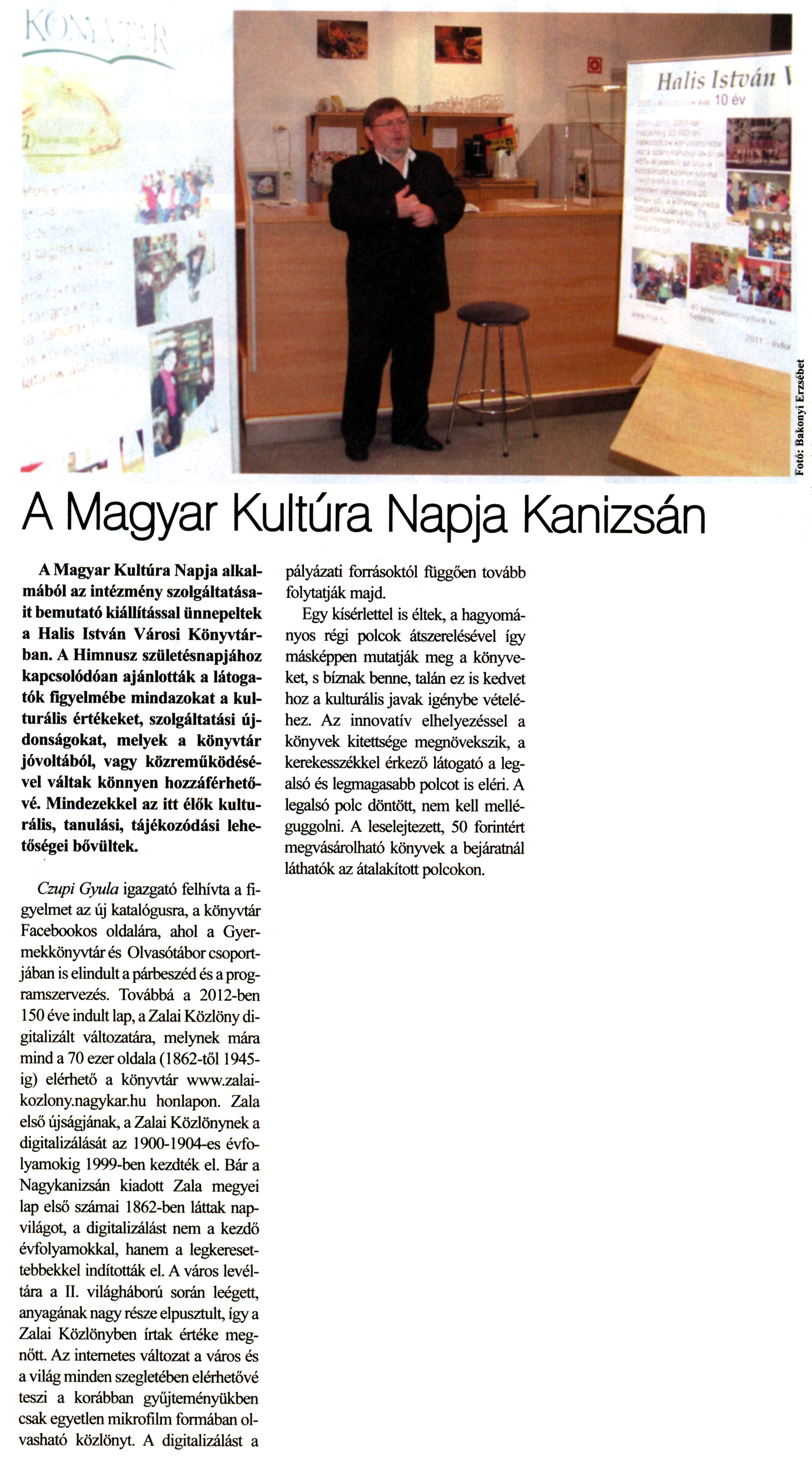 Nyilvános 2388 | 7581 | Kanizsa 2012. január 26. 3. szám 2. oldal - A Magyar Kultúra Napja Kanizsán | A Magyar Kultúra Napja Kanizsán A Magyar Kultúra Napja alkalmából az intézmény szolgáltatásait bemutató kiállítással ünnepeltek a Halis István Városi Könyvtárban. A Himnusz születésnapjához kapcsolódóan ajánlották a látogatók figyelmébe mindazokat a kulturális értékeket, szolgáltatási újdonságokat, melyek a könyvtár jóvoltából, vagy közreműködésével váltak könnyen hozzáférhetővé. Mindezekkel az itt élők kulturális, tanulási, tájékozódási lehetőségei bővültek. Czupi Gyula igazgató felhívta a figyelmet az új katalógusra, a könyvtár Facebookos oldalára, ahol a Gyermekkönyvtár és Olvasótábor csoportjában is elindult a párbeszéd és a programszervezés. Továbbá a 2012-ben 150 éve indult lap, a Zalai Közlöny digitalizált változatára, melynek mára mind a 70 ezer oldala (1862-től 1945-ig) elérhető a könyvtár www.zalai-kozlony.nagykar.hu honlapon. Zala első újságjának, a Zalai Közlönynek a digitalizálását az 1900-1904-es évfolyamokig 1999-ben kezdték el. Bár a Nagykanizsán kiadott Zala megyei lap első számai 1862-ben láttak napvilágot, a digitalizálást nem a kezdő évfolyamokkal, hanem a legkeresettebbekkel indították el. A város levéltára a II. világháború során leégett, anyagának nagy része elpusztult, így a Zalai Közlönyben írtak értéke megnőtt. Az internetes változat a város és a világ minden szegletében elérhetővé teszi a korábban gyűjteményükben csak egyetlen mikrofilm formában olvasható közlönyt. A digitalizálást a pályázati forrásoktól függően tovább folytatják majd. Egy kísérlettel is éltek, a hagyományos régi polcok átszerelésével így másképpen mutatják meg a könyveket, s bíznak benne, talán ez is kedvet hoz a kulturális javak igénybe vételéhez. Az innovatív elhelyezéssel a könyvek kitettsége megnövekszik, a kerekesszékkel érkező látogató a legalsó és legmagasabb polcot is eléri. A legalsó polc döntött, nem kell melléguggolni. A leselejtezett, 50 forintért megvásárolható könyvek a bejáratnál láthatók az átalakított polcokon. |