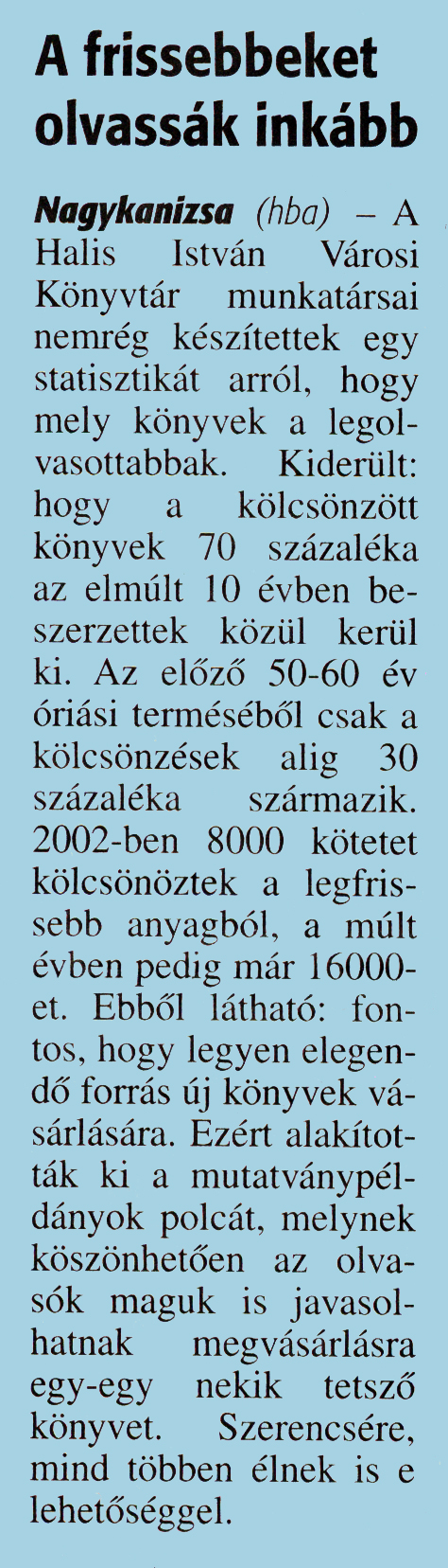 Nyilvános 1729 | 3325 | Zalai Hírlap 2016. február 15. 38. szám 4. oldal | A frissebbeket olvassák inkább Nagykanizsa (hba) - A Halis István Városi Könyvtár munkatársai nemrég készítettek egy statisztikát arról, hogy mely könyvek a legolvasottabbak. Kiderült: hogy a kölcsönzött könyvek 70 százaléka az elmúlt 10 évben beszerzettek közül kerül ki. Az előző 50-60 év óriási terméséből csak a kölcsönzések alig 30 százaléka származik. 2002-ben 8000 kötetet kölcsönöztek a legfrissebb anyagból, a múlt évben pedig már 16000-et. Ebből látható: fontos, hogy legyen elegendő forrás új könyvek vásárlására. Ezért alakították ki a mutatványpéldányok polcát, melynek köszönhetően az olvasók maguk is javasolhatnak megvásárlásra egy-egy nekik tetsző könyvet. Szerencsére, mind többen élnek is e lehetőséggel. |
