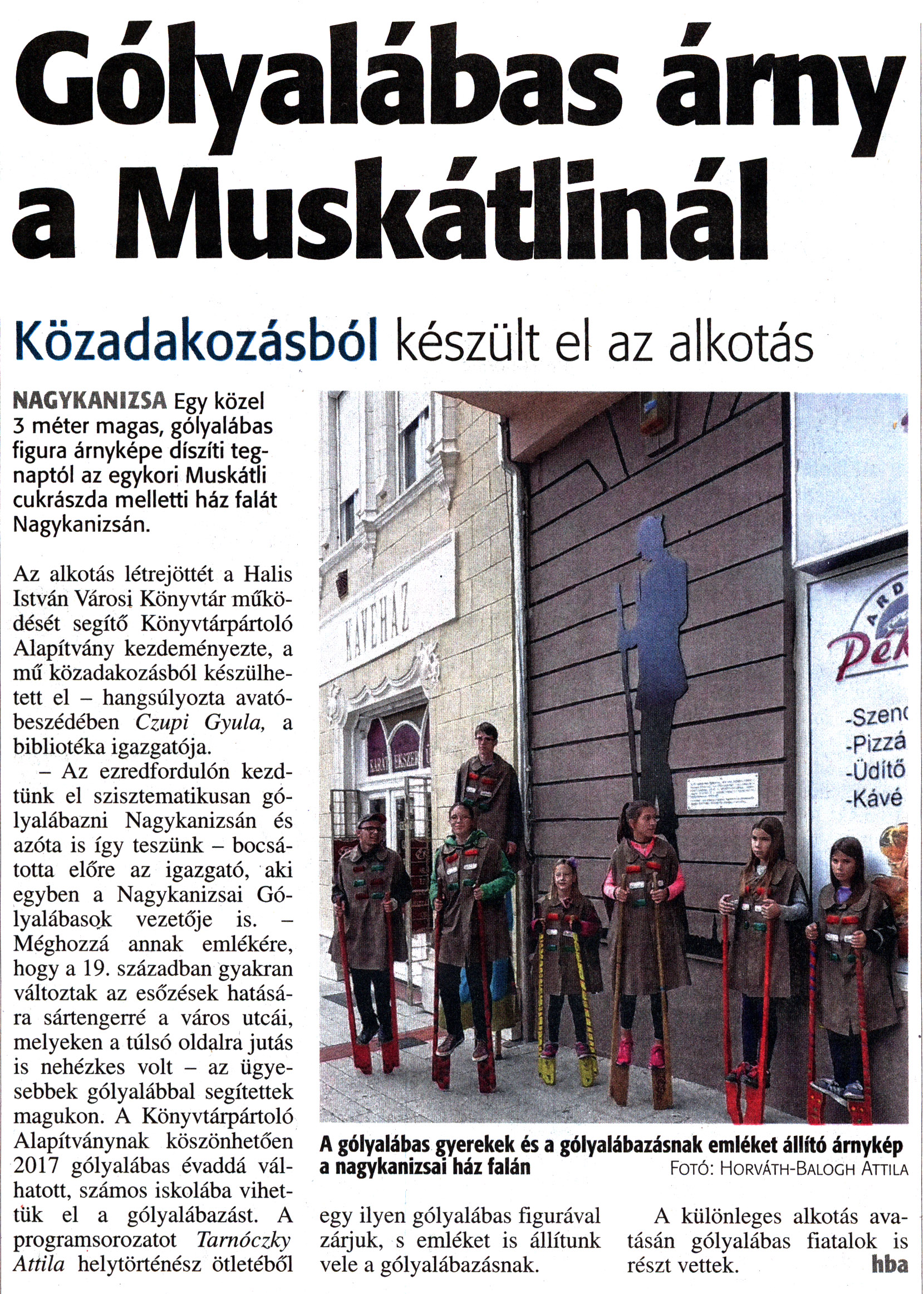 Nyilvános 1726 | 3318 | Zalai Hírlap 2017. október 7. 235. szám 16. oldal | Gólyalábas árny a Muskátlinál Közadakozásból készült el az alkotás NAGYKANIZSA Egy közel 3 méter magas, gólyalábas figura árnyképe díszíti tegnaptól az egykori Muskátli cukrászda melletti ház falát Nagykanizsán. Az alkotás létrejöttét a Halis István Városi Könyvtár működését segítő Könyvtárpártoló Alapítvány kezdeményezte, a mű közadakozásból készülhetett el - hangsúlyozta avatóbeszédében Czupi Gyula, a bibliotéka igazgatója. - Az ezredfordulón kezdtünk el szisztematikusan gólyalábazni Nagykanizsán és azóta is így teszünk - bocsátotta előre az igazgató, aki egyben a Nagykanizsai Gólyalábasok vezetője is. - Méghozzá annak emlékére, hogy a 19. században gyakran változtak az esőzések hatására sártengerré a város utcái, melyeken a túlsó oldalra jutás is nehézkes volt - az ügyesebbek gólyalábbal segítettek magukon. A Könyvtárpártoló Alapítványnak köszönhetően 2017 gólyalábas évaddá válhatott, számos iskolába vihettük el a gólyalábazást. A programsorozatot Tarnóczky Attila helytörténész ötletéből egy ilyen gólyalábas figurával zárjuk, s emléket is állítunk vele a gólyalábazásnak. A különleges alkotás avatásán gólyalábas fiatalok is részt vettek. hba A gólyalábas gyerekek és a gólyalábazásnak emléket állító árnykép a nagykanizsai ház falán Fotó: Horváth-Balogh Attila A cikk online változata: https://www.zaol.hu/kozelet/helyi-kozelet/kozadakozasbol-keszult-el-kulonleges-golyalabas-figura-2165943/ |