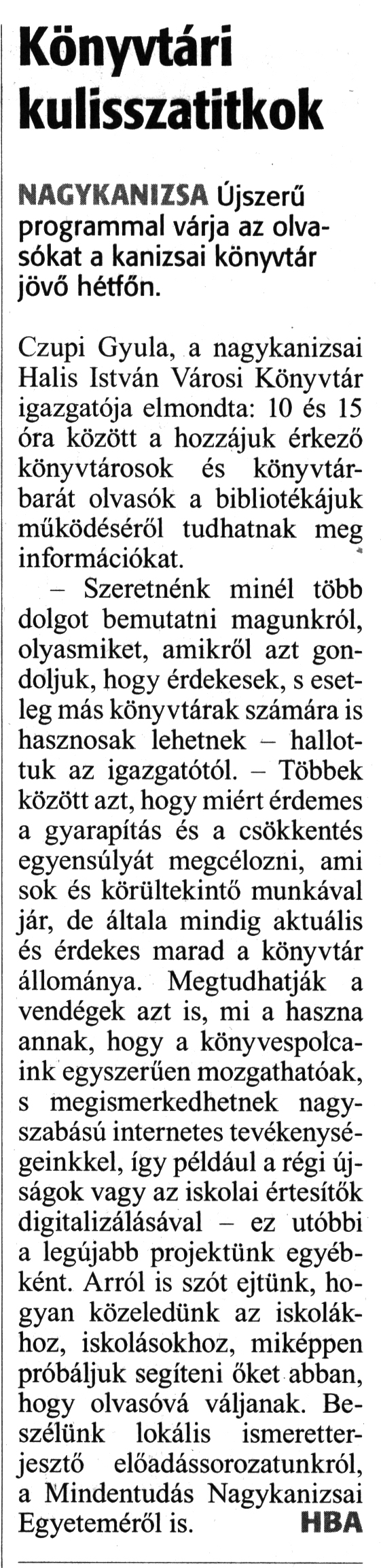 Nyilvános 1740 | 2690 | Zalai Hírlap 2018. október 5. 232. szám 7. oldal - Könyvtári kulisszatitkok | Könyvtári kulisszatitkok NAGYKANIZSA Újszerű programmal várja az olvasókat a kanizsai könyvtár jövő hétfőn. Czupi Gyula, a nagykanizsai Halis István Városi Könyvtár igazgatója elmondta: 10 és 15 óra között a hozzájuk érkező könyvtárosok és könyvtárbarát olvasók a bibliotékájuk működéséről tudhatnak meg információkat. - Szeretnénk minél több dolgot bemutatni magunkról, olyasmiket, amikről azt gondoljuk, hogy érdekesek, s esetleg más könyvtárak számára is hasznosak lehetnek - hallottuk az igazgatótól. - Többek között azt, hogy miért érdemes a gyarapítás és a csökkentés egyensúlyát megcélozni, ami sok és körültekintő munkával jár, de általa mindig aktuális és érdekes marad a könyvtár állománya. Megtudhatják a vendégek azt is, mi a haszna annak, hogy a könyvespolcaink egyszerűen mozgathatóak, s megismerkedhetnek nagyszabású internetes tevékenységeinkkel, így például a régi újságok vagy az iskolai értesítők digitalizálásával - ez utóbbi a legújabb projektünk egyébként. Arról is szót ejtünk, hogyan közeledünk az iskolákhoz, iskolásokhoz, miképpen próbáljuk segíteni őket abban, hogy olvasóvá váljanak. Beszélünk lokális ismeretterjesztő előadássorozatunkról, a Mindentudás Nagykanizsai Egyeteméről is. HBA |