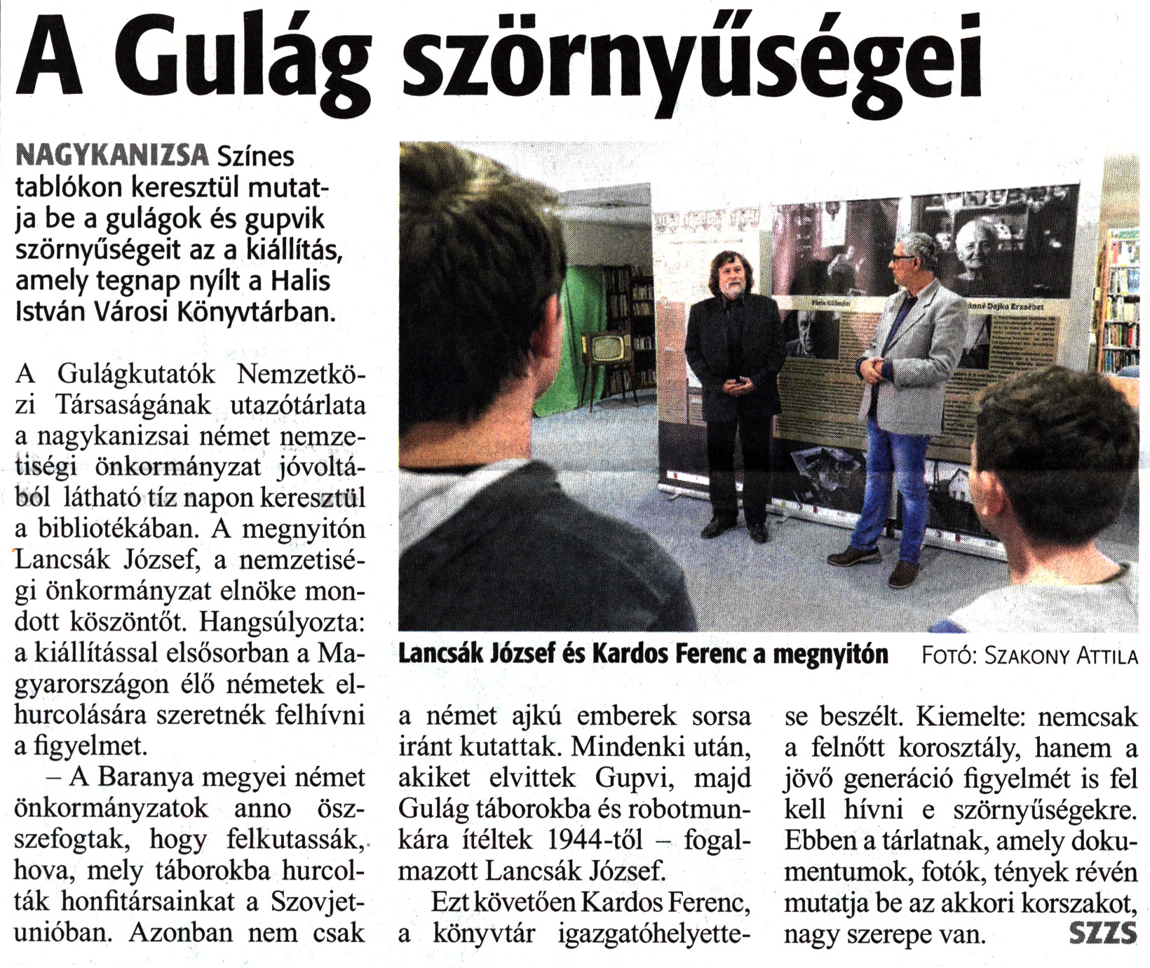 Nyilvános 1540 | 2746 | Zala Hírlap 2019. február 7. 32. szám 16. oldal | A Gulág szörnyűségei NAGYKANIZSA Színes tablókon keresztül mutatja be a gulágok és gupvik szörnyűségeit az a kiállítás, amely tegnap nyílt a Halis István Városi Könyvtárban. A Gulágkutatók Nemzetközi Társaságának utazótárlata a nagykanizsai német nemzetiségi önkormányzat jóvoltából látható tíz napon keresztül a bibliotékában. A megnyitón Lancsák József, a nemzetiségi önkormányzat elnöke mondott köszöntőt. Hangsúlyozta: a kiállítással elsősorban a Magyarországon élő németek elhurcolására szeretnék felhívni a figyelmet. - A Baranya megyei német önkormányzatok anno összefogtak, hogy felkutassák, hova, mely táborokba hurcolták honfitársainkat a Szovjetunióban. Azonban nem csak a német ajkú emberek sorsa iránt kutattak. Mindenki után, akiket elvittek Gupvi, majd Gulág táborokba és robotmunkára ítéltek 1944-től - fogalmazott Lancsák József. Ezt követően Kardos Ferenc, a könyvtár igazgatóhelyette- se beszélt. Kiemelte: nemcsak a felnőtt korosztály, hanem a jövő generáció figyelmét is fel kell hívni e szörnyűségekre. Ebben a tárlatnak, amely dokumentumok, fotók, tények révén mutatja be az akkori korszakot, nagy szerepe van. SZZS Lancsák József és Kardos Ferenc a megnyitón Fotó: Szakony Attila |