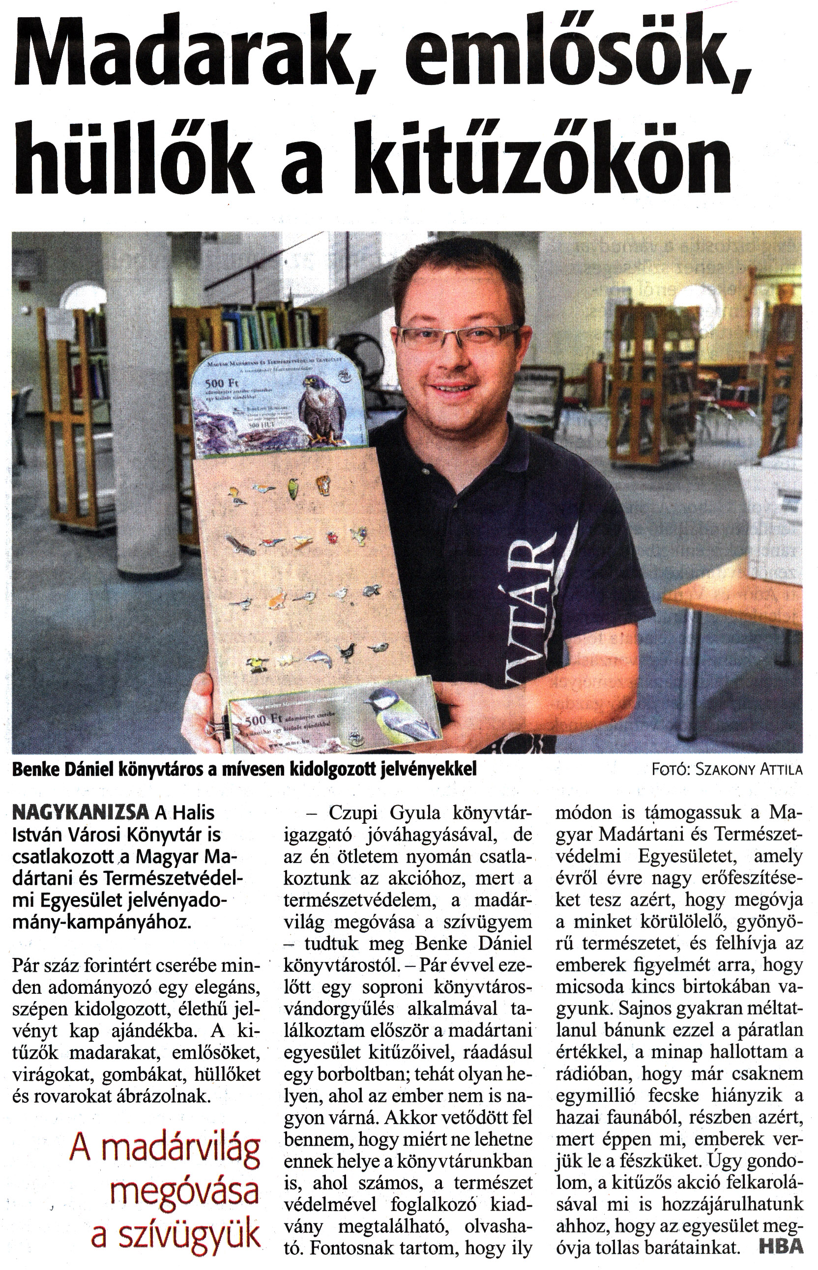 Nyilvános 1514 | 2672 | Zalai Hírlap 2019. március 18. 64. szám 6. oldal | Madarak, emlősök, hüllők a kitűzőkön Benke Dániel könyvtáros a mívesen kidolgozott jelvényekkel Fotó: Szakony Attila NAGYKANIZSA A Halis István Városi Könyvtár is csatlakozott a Magyar Madártani és Természetvédelmi Egyesület jelvényadomány-kampányához. Pár száz forintért cserébe minden adományozó egy elegáns, szépen kidolgozott, élethű jelvényt kap ajándékba. A kitűzők madarakat, emlősöket, virágokat, gombákat, hüllőket és rovarokat ábrázolnak. A madárvilág megóvása a szívügyük - Czupi Gyula könyvtárigazgató jóváhagyásával, de az én ötletem nyomán csatlakoztunk az akcióhoz, mert a természetvédelem, a madárvilág megóvása a szívügyem - tudtuk meg Benke Dániel könyvtárostól. - Pár évvel ezelőtt egy soproni könyvtárosvándorgyűlés alkalmával találkoztam először a madártani egyesület kitűzőivel, ráadásul egy borboltban; tehát olyan helyen, ahol az ember nem is nagyon várná. Akkor vetődött fel bennem, hogy miért ne lehetne ennek helye a könyvtárunkban is, ahol számos, a természet védelmével foglalkozó kiadvány megtalálható, olvasható. Fontosnak tartom, hogy ily módon is támogassuk a Magyar Madártani és Természetvédelmi Egyesületet, amely évről évre nagy erőfeszítéseket tesz azért, hogy megóvja a minket körülölelő, gyönyörű természetet, és felhívja az emberek figyelmét arra, hogy micsoda kincs birtokában vagyunk. Sajnos gyakran méltatlanul bánunk ezzel a páratlan értékkel, a minap hallottam a rádióban, hogy már csaknem egymillió fecske hiányzik a hazai faunából, részben azért, mert éppen mi, emberek verjük le a fészküket. Úgy gondolom, a kitűzős akció felkarolásával mi is hozzájárulhatunk ahhoz, hogy az egyesület megóvja tollas barátainkat. HBA |