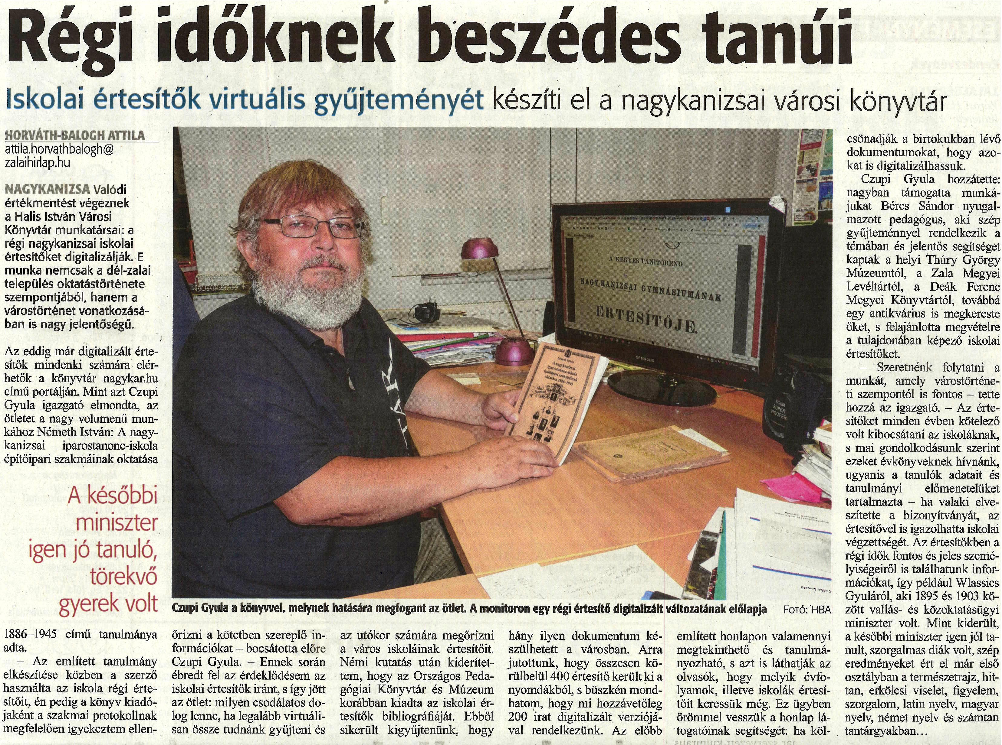 Nyilvános 1268 | 2283 | Régi időknek beszédes tanúi | Iskolai értesítők virtuális gyűjteményét készíti el a nagykanizsai városi könyvtár HORVÁTH-BALOGH ATTILA attila.horvathbalogh@zalaihirlap.hu NAGYKANIZSA Valódi értékmentést végeznek a Halis István Városi Könyvtár munkatársai: a régi nagykanizsai iskolai értesítőket digitalizálják. E munka nemcsak a dél-zalai település oktatástörténete szempontjából, hanem a várostörténet vonatkozásában is nagy jelentőségű. Az eddig már digitalizált értesítők mindenki számára elérhetők a könyvtár nagykar.hu című portálján. Mint azt Czupi Gyula igazgató elmondta, az ötletet a nagy volumenű munkához Németh István: A nagykanizsai iparostanonc-iskola építőipari szakmáinak oktatása - A későbbi miniszter igen jó tanuló, törekvő gyerek volt - 1886-1945 című tanulmánya adta. -Az említett tanulmány elkészítése közben a szerző használta az iskola régi értesítőit, én pedig a könyv kiadójaként a szakmai protokollnak megfelelően igyekeztem ellenőrizni a kötetben szereplő információkat - bocsátotta előre Czupi Gyula. - Ennek során ébredt fel az érdeklődésem az iskolai értesítők iránt, s így jött az ötlet: milyen csodálatos dolog lenne, ha legalább virtuálisan össze tudnánk gyűjteni és az utókor számára megőrizni a város iskoláinak értesítőit. Némi kutatás után kiderítettem, hogy az Országos Pedagógiai Könyvtár és Múzeum korábban kiadta az iskolai értesítők bibliográfiáját. Ebből sikerült kigyűjtenünk, hogy hány ilyen dokumentum készülhetett a városban. Arra jutottunk, hogy összesen körülbelül 400 értesítő került ki a nyomdákból, s büszkén mondhatom, hogy mi hozzávetőleg 200 irat digitalizált verziójával rendelkezünk. Az előbb említett honlapon valamennyi megtekinthető és tanulmányozható, s azt is láthatják az olvasók, hogy melyik évfolyamok, illetve iskolák értesítőit keressük még. Ez ügyben örömmel vesszük a honlap látogatóinak segítségét: ha kölcsönadják a birtokukban lévő dokumentumokat, hogy azokat is digitalizálhassuk. Czupi Gyula hozzátette: nagyban támogatta munkájukat Béres Sándor nyugalmazott pedagógus, aki szép gyűjteménnyel rendelkezik a témában és jelentős segítséget kaptak a helyi Thúry György Múzeumtól, a Zala Megyei Levéltártól, a Deák Ferenc Megyei Könyvtártól, továbbá egy antikvárius is megkereste őket, s felajánlotta megvételre a tulajdonában képező iskolai értesítőket. - Szeretnénk folytatni a munkát, amely várostörténeti szempontéi is fontos - tette hozzá az igazgató. - Az értesítőket minden évben kötelező volt kibocsátani az iskoláknak, s mai gondolkodásunk szerint ezeket évkönyveknek hívnánk, ugyanis a tanulók adatait és tanulmányi előmenetelüket tartalmazta - ha valaki elveszítette a bizonyítványát, az értesítővel is igazolhatta iskolai végzettségét. Az értesítőkben a régi idők fontos és jeles személyiségeiről is találhatunk információkat, így például Wlassics Gyuláról, aki 1895 és 1903 között vallás- és közoktatásügyi miniszter volt. Mint kiderült, a későbbi miniszter igen jól tanult, szorgalmas diák volt, szép eredményeket ért el már első osztályban a természetrajz, hittan, erkölcsi viselet, figyelem, szorgalom, latin nyelv, magyar nyelv, német nyelv és számtan tantárgyakban... Czupi Gyula a könyvvel, melynek hatására megfogant az ötlet. A monitoron egy régi értesítő digitalizált változatának előlapja Fotó: HBA |