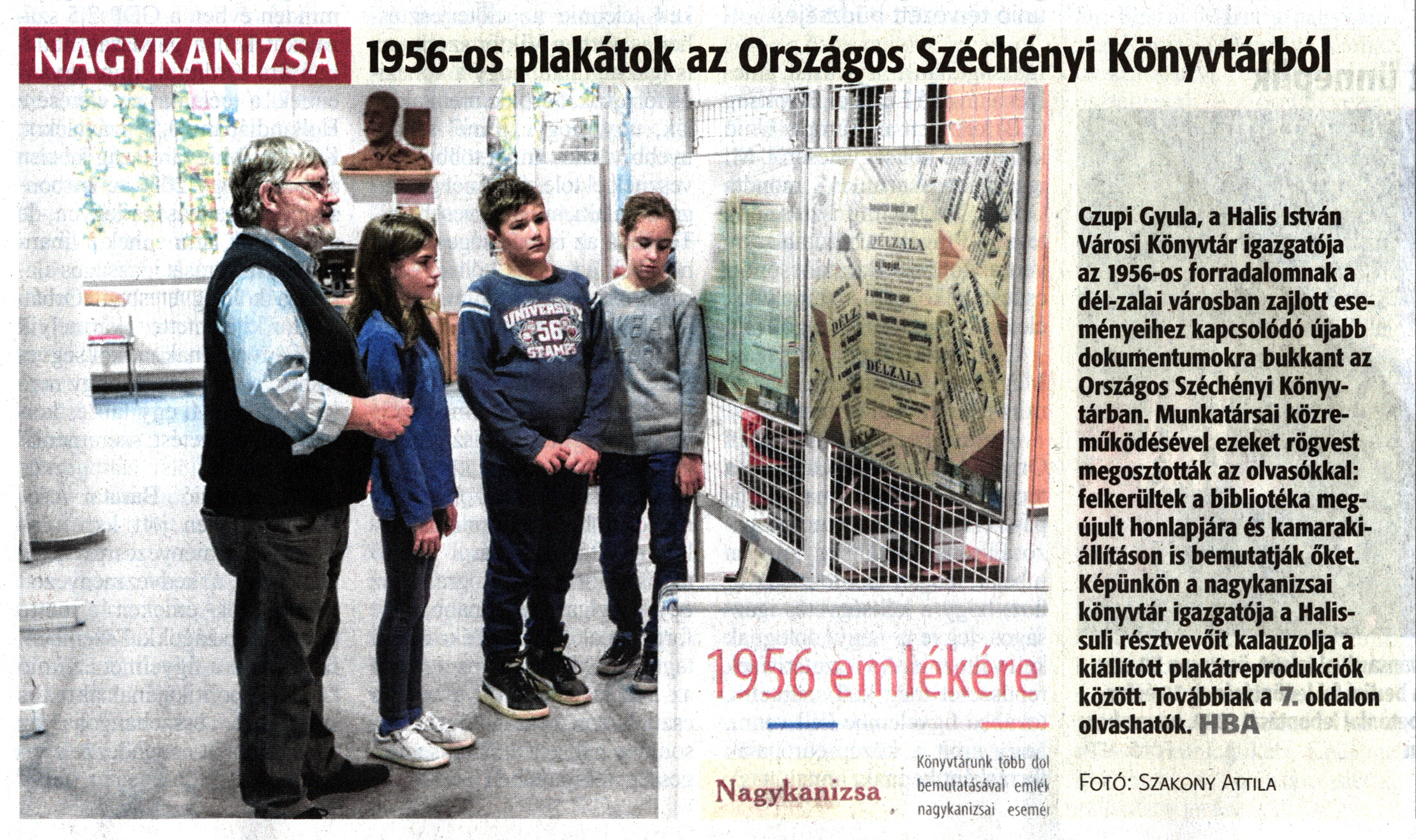 Nyilvános 1324 | 2193 | Zalai Hírlap 2019. november 6. 257. szám 1. oldal - 1956-os plakátok az Országos Széchenyi Könyvtárból | 1956-os plakátok az Országos Széchényi Könyvtárból Czupi Gyula, a Halis István Városi Könyvtár igazgatója az 1956-os forradalomnak a dél-zalai városban zajlott eseményeihez kapcsolódó újabb dokumentumokra bukkant az Országos Széchényi Könyvtárban. Munkatársai közreműködésével ezeket rögvest megosztották az olvasókkal: felkerültek a bibliotéka megújult honlapjára és kamarakiállításon is bemutatják őket. Képünkön a nagykanizsai könyvtár igazgatója a Halis-suli résztvevőit kalauzolja a kiállított plakátreprodukciók között. Továbbiak a 7. oldalon olvashatók. HBA Fotó: Szakony Attila |