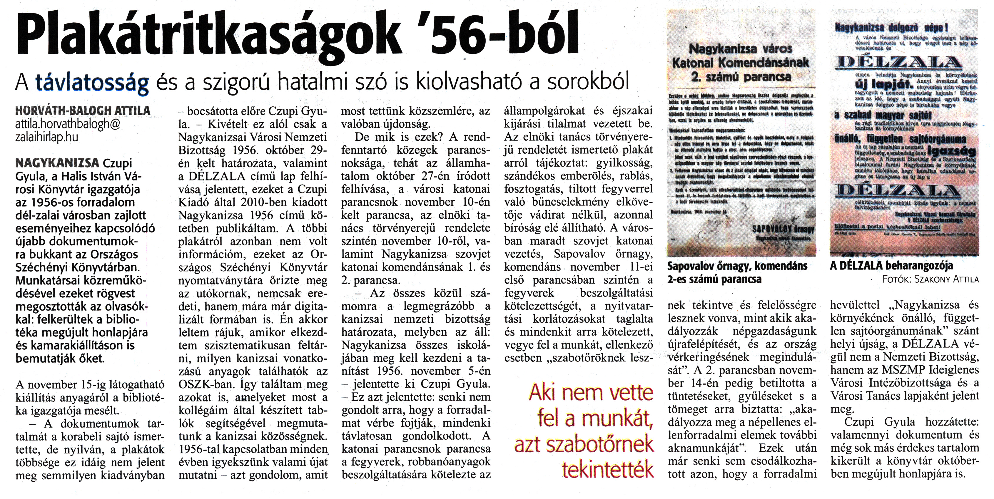 Nyilvános 1437 | 2323 | Zalai Hírlap 2019. november 6. 257. szám 7. oldal - Plakátritkaságok 56-ból | Plakátritkaságok \'56-ból A távlatosság és a szigorú hatalmi szó is kiolvasható a sorokból HORVÁTH-BALOGH ATTILA attila.horvathbalogh@ zalaihirlap.hu NAGYKANIZSA Czupi Gyula, a Halis István Városi Könyvtár igazgatója az 1956-os forradalom dél-zalai városban zajlott eseményeihez kapcsolódó újabb dokumentumokra bukkant az Országos Széchényi Könyvtárban. Munkatársai közreműködésével ezeket rögvest megosztották az olvasókkal: felkerültek a bibliotéka megújult honlapjára és kamarakiállításon is bemutatják őket. A november 15-ig látogatható kiállítás anyagáról a bibliotéka igazgatója mesélt. - A dokumentumok tartalmát a korabeli sajtó ismertette, de nyilván, a plakátok többsége ez idáig nem jelent meg semmilyen kiadványban - bocsátotta előre Czupi Gyula. - Kivételt ez alól csak a Nagykanizsai Városi Nemzeti Bizottság 1956. október 29-én kelt határozata, valamint a DÉLZALA című lap felhívása jelentett, ezeket a Czupi Kiadó által 2010-ben kiadott Nagykanizsa 1956 című kötetben publikáltam. A többi plakátról azonban nem volt információm, ezeket az Országos Széchényi Könyvtár nyomtatványtára őrizte meg az utókornak, nemcsak eredeti, hanem mára már digitalizált formában is. Én akkor leltem rájuk, amikor elkezdtem szisztematikusan feltárni, milyen kanizsai vonatkozású anyagok találhatók az OSZK-ban. így találtam meg azokat is, amelyeket most a kollégáim által készített tablók segítségével megmutatunk a kanizsai közösségnek. 1956-tal kapcsolatban minden évben igyekszünk valami újat mutatni - azt gondolom, amit most tettünk közszemlére, az valóban újdonság. De mik is ezek? A rendfenntartó közegek parancsnoksága, tehát az államhatalom október 27-én íródott felhívása, a városi katonai parancsnok november 10-én kelt parancsa, az elnöki tanács törvényerejű rendelete szintén november 10-ről, valamint Nagykanizsa szovjet katonai komendánsának 1. és 2. parancsa. - Az összes közül számomra a legmegrázóbb a kanizsai nemzeti bizottság határozata, melyben az áll: Nagykanizsa összes iskolájában meg kell kezdeni a tanítást 1956. november 5-én - jelentette ki Czupi Gyula. - Ez azt jelentette: senki nem gondolt arra, hogy a forradalmat vérbe fojtják, mindenki távlatosan gondolkodott. A katonai parancsnok parancsa a fegyverek, robbanóanyagok beszolgáltatására kötelezte az állampolgárokat és éjszakai kijárási tilalmat vezetett be. Az elnöki tanács törvényerejű rendeletét ismertető plakát arról tájékoztat: gyilkosság, szándékos emberölés, rablás, fosztogatás, tiltott fegyverrel való bűncselekmény elkövetője vádirat nélkül, azonnal bíróság elé állítható. A városban maradt szovjet katonai vezetés, Sapovalov őrnagy, komendáns november 11-ei első parancsában szintén a fegyverek beszolgáltatási kötelezettségét, a nyitvatartási korlátozásokat taglalta és mindenkit arra kötelezett, vegye fel a munkát, ellenkező esetben „szabotőröknek lesznek tekintve és felelősségre lesznek vonva, mint akik akadályozzák népgazdaságunk újrafelépítését, és az ország vérkeringésének megindulását". A 2. parancsban november 14-én pedig betiltotta a tüntetéseket, gyűléseket s a tömeget arra biztatta: „akadályozza meg a népellenes ellenforradalmi elemek további aknamunkáját". Ezek után már senki sem csodálkozhatott azon, hogy a forradalmi hevülettel „Nagykanizsa és környékének önálló, független sajtóorgánumának" szánt helyi újság, a DÉLZALA végül nem a Nemzeti Bizottság, hanem az MSZMP Ideiglenes Városi Intézőbizottsága és a Városi Tanács lapjaként jelent meg. Czupi Gyula hozzátette: valamennyi dokumentum és még sok más érdekes tartalom kikerült a könyvtár októberben megújult honlapjára is. Sapovalov őrnagy, komendáns 2-es számú parancsa A DÉLZALA beharangozója • Fotók: Szakony Attila |