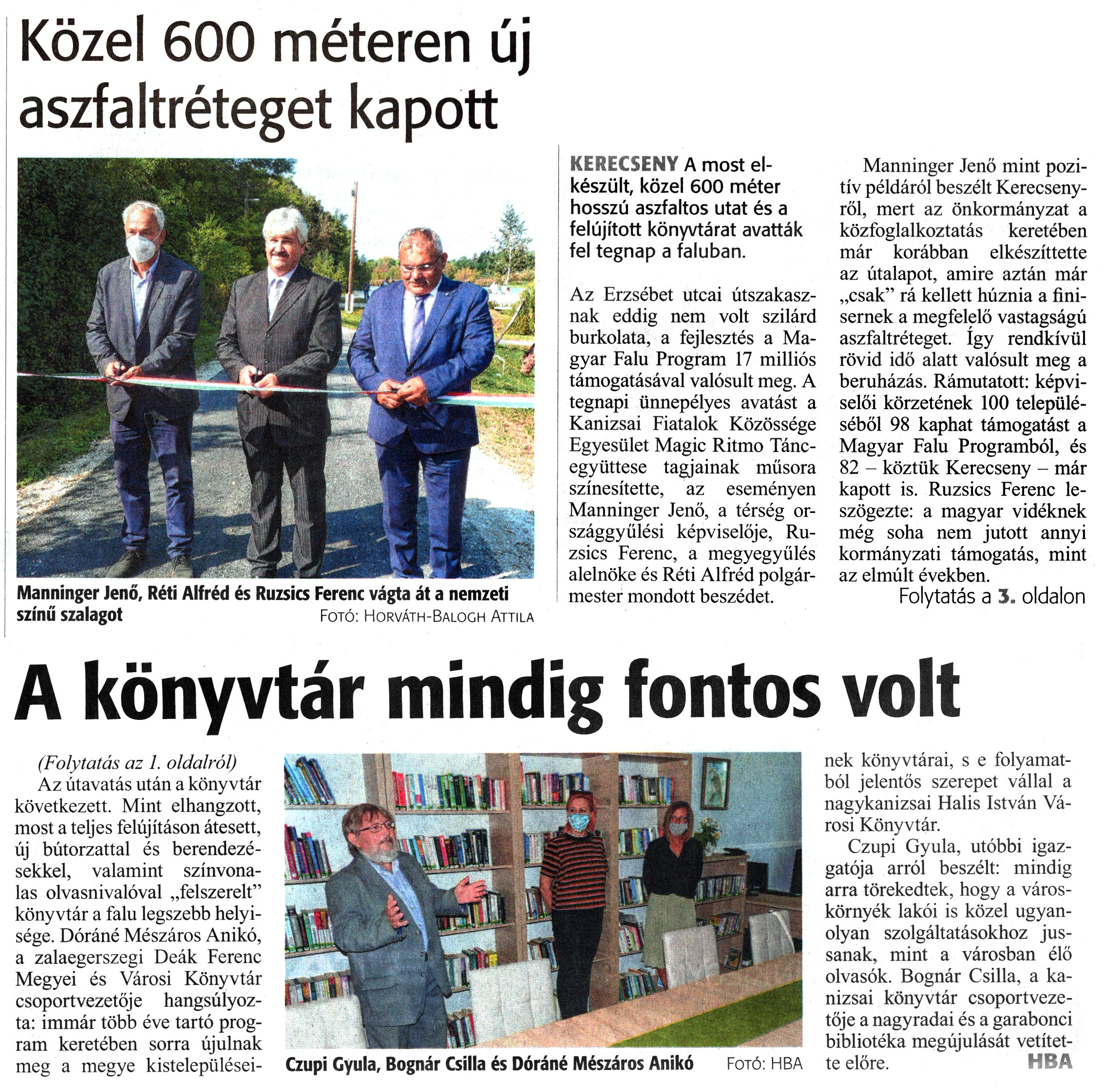 Nyilvános 1315 | 1882 | Zalai Hírlap 2020. szeptember 19. 220. szám 1, 3. oldal | Közel 600 méteren új aszfaltréteget kapott KERECSENY A most elkészült, közel 600 méter hosszú aszfaltos utat és a felújított könyvtárat avatták fel tegnap a faluban. Az Erzsébet utcai útszakasznak eddig nem volt szilárd burkolata, a fejlesztés a Magyar Falu Program 17 milliós támogatásával valósult meg. A tegnapi ünnepélyes avatást a Kanizsai Fiatalok Közössége Egyesület Magic Ritmo Táncegyüttese tagjainak műsora színesítette, az eseményen Manninger Jenő, a térség országgyűlési képviselője, Ruzsics Ferenc, a megyegyülés alelnöke és Réti Alfréd polgármester mondott beszédet. Manninger Jenő mint pozitív példáról beszélt Kerecsenyről, mert az önkormányzat a közfoglalkoztatás keretében már korábban elkészíttette az útalapot, amire aztán már „csak" rá kellett húznia a finisernek a megfelelő vastagságú aszfaltréteget. így rendkívül rövid idő alatt valósult meg a beruházás. Rámutatott: képviselői körzetének 100 településéből 98 kaphat támogatást a Magyar Falu Programból, és 82 - köztük Kerecseny - már kapott is. Ruzsics Ferenc leszögezte: a magyar vidéknek még soha nem jutott annyi kormányzati támogatás, mint az elmúlt években. Folytatás a 3. oldalon A könyvtár mindig fontos volt (Folytatás az 1. oldalról) Az útavatás után a könyvtár következett. Mint elhangzott, most a teljes felújításon átesett, új bútorzattal és berendezésekkel, valamint színvonalas olvasnivalóval „felszerelt" könyvtár a falu legszebb helyisége. Dóráné Mészáros Anikó, a zalaegerszegi Deák Ferenc Megyei és Városi Könyvtár csoportvezetője hangsúlyozta: immár több éve tartó program keretében sorra újulnak meg a megye kistelepüléseinek könyvtárai, s e folyamatból jelentős szerepet vállal a nagykanizsai Halis István Városi Könyvtár. Czupi Gyula, utóbbi igazgatója arról beszélt: mindig arra törekedtek, hogy a városkörnyék lakói is közel ugyanolyan szolgáltatásokhoz jussanak, mint a városban élő olvasók. Bognár Csilla, a kanizsai könyvtár csoportvezetője a nagyradai és a garabonci bibliotéka megújulását vetítette előre. HBA Manninger Jenő, Réti Alfréd és Ruzsics Ferenc vágta át a nemzeti színű szalagot Fotó: Horváth-Balogh Attila Czupi Gyula, Bognár Csilla és Dóráné Mészáros Anikó Fotó: HBA |