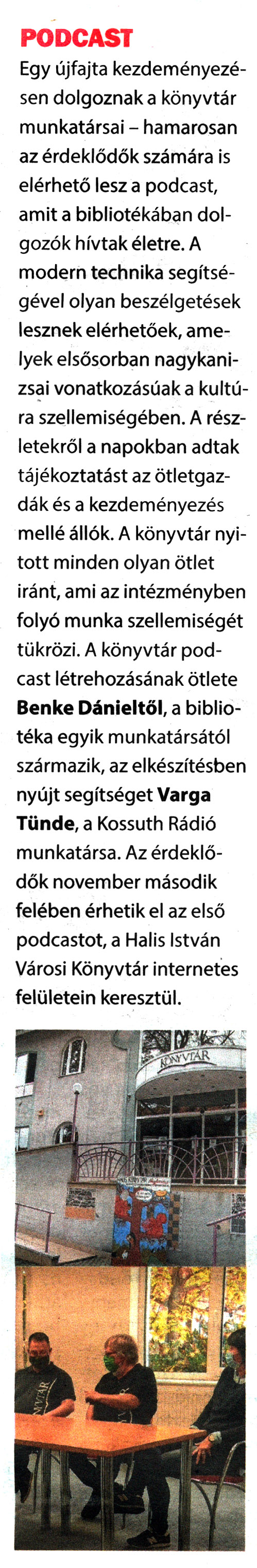 Nyilvános 1360 | 2306 | Kanizsa 2020. november 6. 40. szám 3. oldal | PODCAST Egy újfajta kezdeményezésen dolgoznak a könyvtár munkatársai - hamarosan az érdeklődők számára is elérhető lesz a podcast, amit a bibliotékában dolgozók hívtak életre. A modern technika segítségével olyan beszélgetések lesznek elérhetőek, amelyek elsősorban nagykanizsai vonatkozásúak a kultúra szellemiségében. A részletekről a napokban adtak tájékoztatást az ötletgazdák és a kezdeményezés mellé állók. A könyvtár nyitott minden olyan ötlet iránt, ami az intézményben folyó munka szellemiségét tükrözi. A könyvtár podcast létrehozásának ötlete Benke Dánieltől, a bibliotéka egyik munkatársától származik, az elkészítésben nyújt segítséget Varga Tünde, a Kossuth Rádió munkatársa. Az érdeklődők november második felében érhetik el az első podcastot, a Halis István Városi Könyvtár internetes felületein keresztül. |