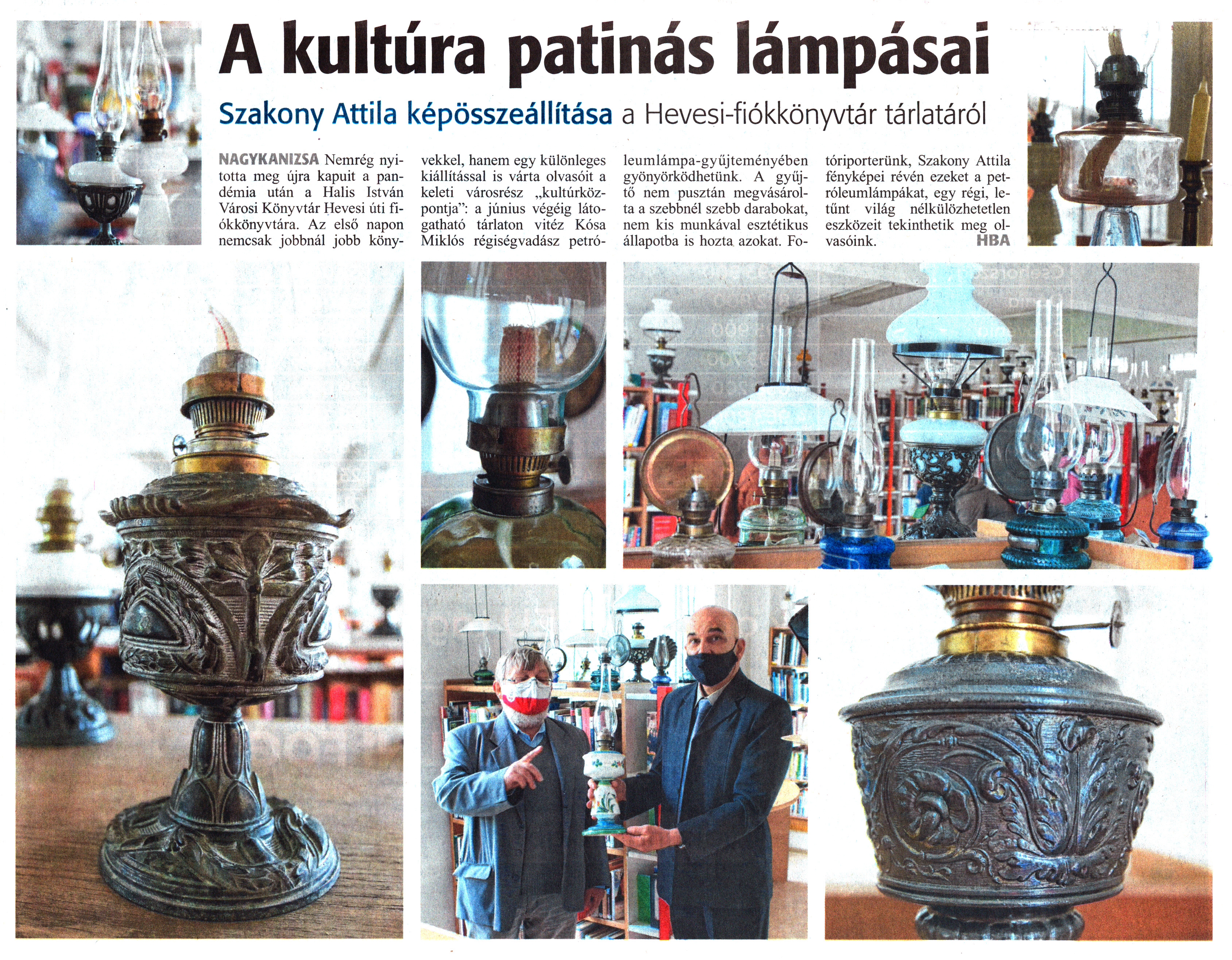 Nyilvános 1022 | 1714 | Zalai Hírlap 2021. május 26. 119. szám 5. oldal | A kultúra patinás lámpásai Szakony Attila képösszeállítása a Hevesi-fiókkönyvtár tárlatáról NAGYKANIZSA Nemrég nyitotta meg újra kapuit a pandémia után a Halis István Városi Könyvtár Hevesi úti fiókkönyvtára. Az első napon nemcsak jobbnál jobb könyvekkel, hanem egy különleges kiállítással is várta olvasóit a keleti városrész „kultúrközpontja": a június végéig látogatható tárlaton vitéz Kósa Miklós régiségvadász petróleumlámpa-gyűjteményében gyönyörködhetünk. A gyűjtő nem pusztán megvásárolta a szebbnél szebb darabokat, nem kis munkával esztétikus állapotba is hozta azokat. Fotóriporterünk, Szakony Attila fényképei révén ezeket a petróleumlámpákat, egy régi, letűnt világ nélkülözhetetlen eszközeit tekinthetik meg olvasóink. HBA |