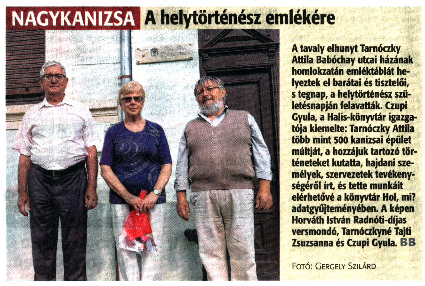 Nyilvános 982 | 1800 | Zalai Hírlap 2021. június 12. 134. szám 3. oldal | A tavaly elhunyt Tarnóczky Attila Babóchay utcai házának homlokzatán emléktáblát helyeztek el barátai és tisztelői, s tegnap, a helytörténész születésnapján felavatták. Czupi Gyula, a Halis-könyvtár igazgatója kiemelte: Tarnóczky Attila több mint 500 kanizsai épület múltját, a hozzájuk tartozó történeteket kutatta, hajdani személyek, szervezetek tevékenységéről írt és tette munkáit elérhetővé a könyvtár Hol, mi? adatgyűjteményében. A képen Horváth István Radnóti-díjas versmondó, Tarnóczkyné Tajti Zsuzsanna és Czupi Gyula. BB Fotó: Gergely Szilárd |