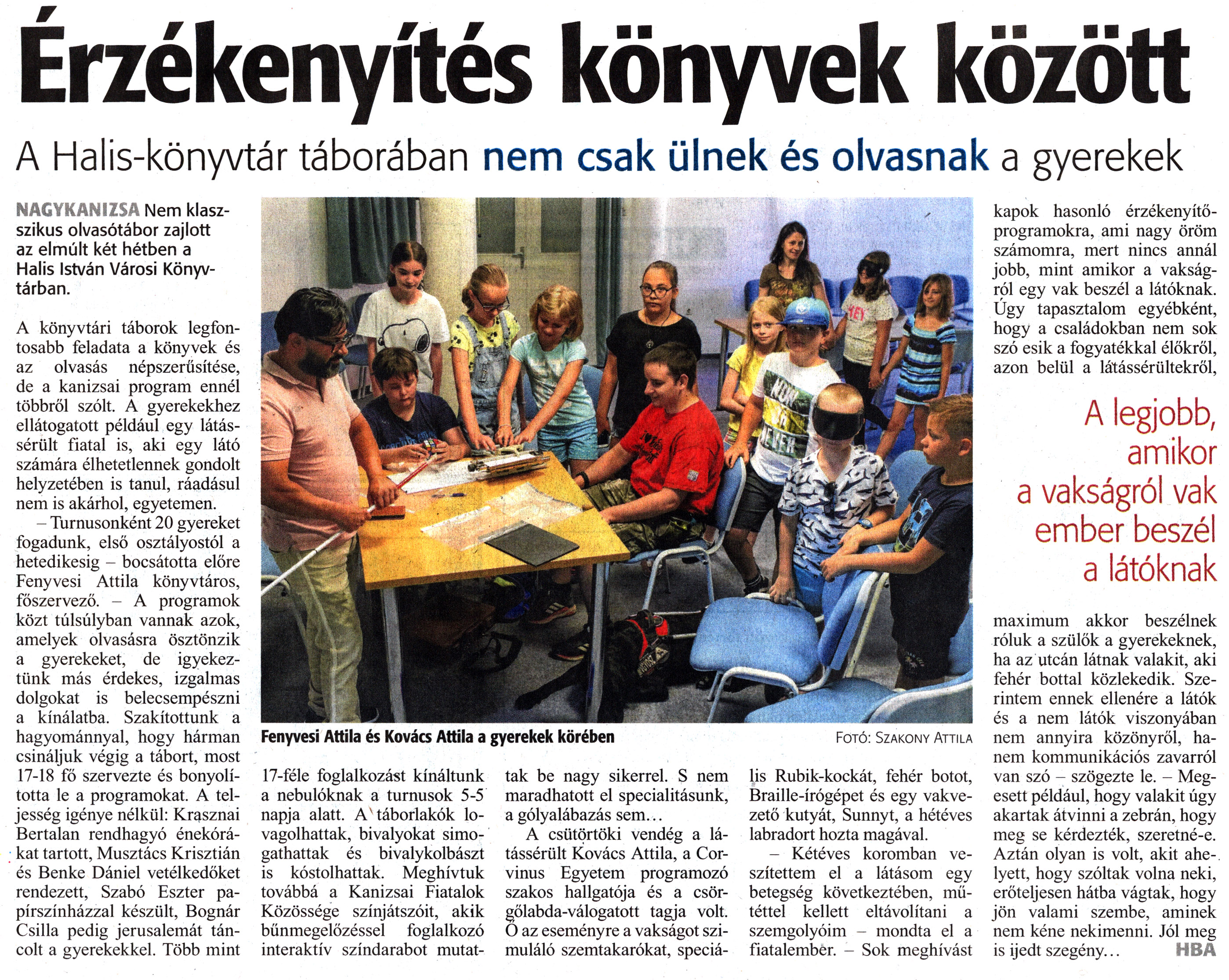 Nyilvános 1062 | 1476 | Zalai Hírlap 2021. július 3. 152. szám 3. oldal | Érzékenyítés könyvek között A Halis-könyvtár táborában nem csak ülnek és olvasnak a gyerekek NAGYKANIZSA Nem klasszikus olvasótábor zajlott az elmúlt két hétben a Halis István Városi Könyvtárban. A könyvtári táborok legfontosabb feladata a könyvek és az olvasás népszerűsítése, de a kanizsai program ennél többről szólt. A gyerekekhez ellátogatott például egy látássérült fiatal is, aki egy látó számára élhetetlennek gondolt helyzetében is tanul, ráadásul nem is akárhol, egyetemen. - Turnusonként 20 gyereket fogadunk, első osztályostól a hetedikesig - bocsátotta előre Fenyvesi Attila könyvtáros, főszervező. - A programok közt túlsúlyban vannak azok, amelyek olvasásra ösztönzik a gyerekeket, de igyekeztünk más érdekes, izgalmas dolgokat is belecsempészni a kínálatba. Szakítottunk a hagyománnyal, hogy hárman csináljuk végig a tábort, most 17-18 fő szervezte és bonyolította le a programokat. A teljesség igénye nélkül: Krasznai Bertalan rendhagyó énekórákat tartott, Musztács Krisztián és Benke Dániel vetélkedőket rendezett, Szabó Eszter papírszínházzal készült, Bognár Csilla pedig jerusalemát táncolt a gyerekekkel. Több mint 17-féle foglalkozást kínáltunk a nebulóknak a turnusok 5-5 napja alatt. A táborlakók lovagolhattak, bivalyokat simogathattak és bivalykolbászt is kóstolhattak. Meghívtuk továbbá a Kanizsai Fiatalok Közössége színjátszóit, akik bűnmegelőzéssel foglalkozó interaktív színdarabot mutattak be nagy sikerrel. S nem maradhatott el specialitásunk, a gólyalábazás sem... A csütörtöki vendég a látássérült Kovács Attila, a Corvinus Egyetem programozó szakos hallgatója és a csörgőlabda-válogatott tagja volt. Ő az eseményre a vakságot szimuláló szemtakarókat, speciális Rubik-kockát, fehér botot, Braille-írógépet és egy vakvezető kutyát, Sunnyt, a hétéves labradort hozta magával. - Kétéves koromban veszítettem el a látásom egy betegség következtében, műtéttel kellett eltávolítani a szemgolyóim - mondta el a fiatalember. - Sok meghívást kapok hasonló érzékenyítő-programokra, ami nagy öröm számomra, mert nincs annál jobb, mint amikor a vakságról egy vak beszél a látóknak. Úgy tapasztalom egyébként, hogy a családokban nem sok szó esik a fogyatékkal élőkről, azon belül a látássérültekről, maximum akkor beszélnek róluk a szülök a gyerekeknek, ha az utcán látnak valakit, aki fehér bottal közlekedik. Szerintem ennek ellenére a látók és a nem látók viszonyában nem annyira közönyről, hanem kommunikációs zavarról van szó - szögezte le. - Megesett például, hogy valakit úgy akartak átvinni a zebrán, hogy meg se kérdezték, szeretné-e. Aztán olyan is volt, akit ahelyett, hogy szóltak volna neki, erőteljesen hátba vágtak, hogy jön valami szembe, aminek nem kéne nekimenni. Jól meg is ijedt szegény... HBA Fenyvesi Attila és Kovács Attila a gyerekek körében Fotó: Szakony Attila |