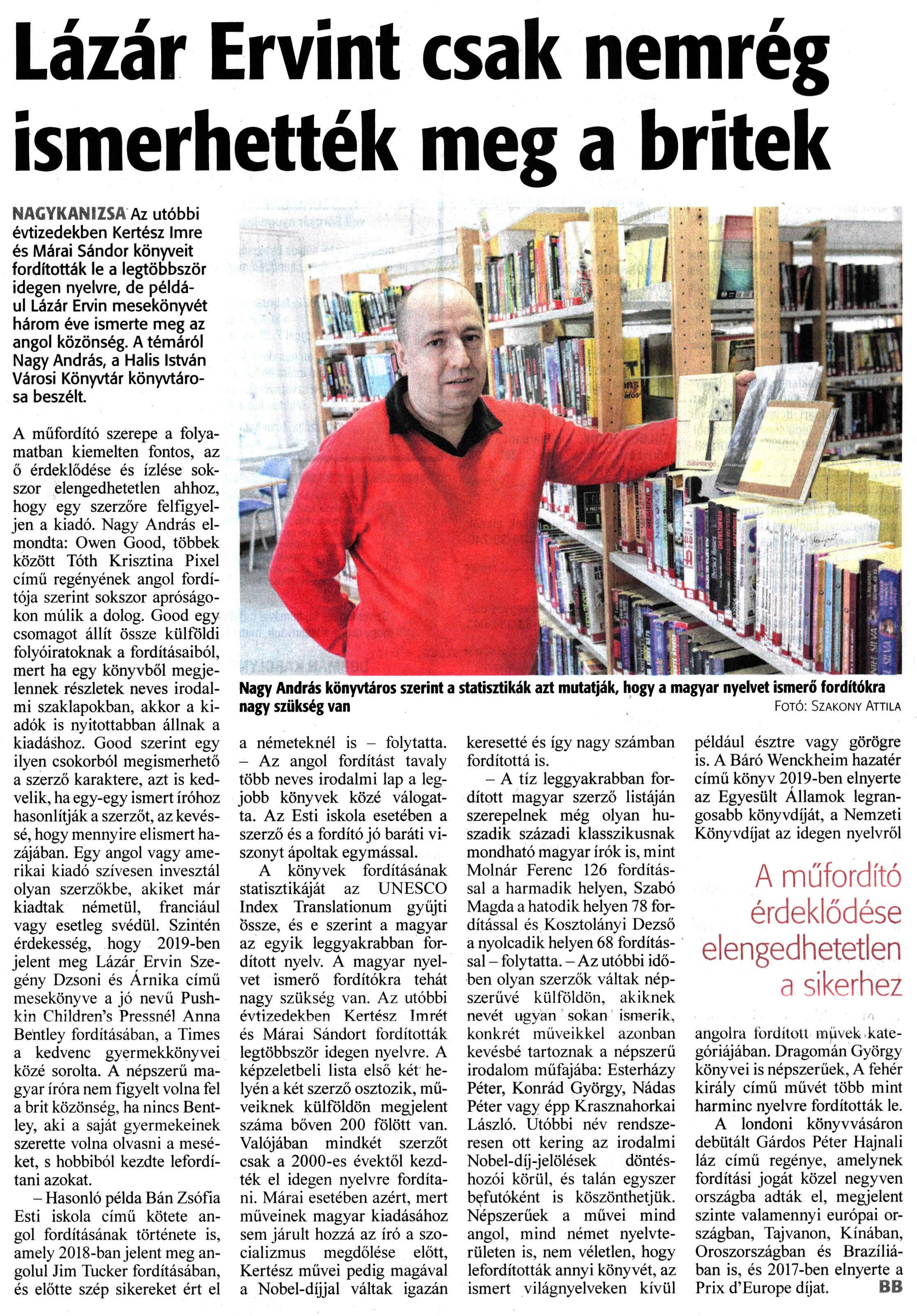 Nyilvános 1146 | 1605 | Zalai Hírlap 2022. február 9. 33. szám 12. oldal | Lázár Ervint csak nemrég ismerhették meg a britek NAGYKANIZSA Az utóbbi évtizedekben Kertész Imre és Márai Sándor könyveit fordították le a legtöbbször idegen nyelvre, de például Lázár Ervin mesekönyvét három éve ismerte meg az angol közönség. A témáról Nagy András, a Halis István Városi Könyvtár könyvtárosa beszélt. A műfordító szerepe a folyamatban kiemelten fontos, az ő érdeklődése és ízlése sokszor elengedhetetlen ahhoz, hogy egy szerzőre felfigyeljen a kiadó. Nagy András elmondta: Owen Good, többek között Tóth Krisztina Pixel című regényének angol fordítója szerint sokszor apróságokon múlik a dolog. Good egy csomagot állít össze külföldi folyóiratoknak a fordításaiból, mert ha egy könyvből megjelennek részletek neves irodalmi szaklapokban, akkor a kiadók is nyitottabban állnak a kiadáshoz. Good szerint egy ilyen csokorból megismerhető a szerző karaktere, azt is kedvelik, ha egy-egy ismert íróhoz hasonlítják a szerzőt, az kevéssé, hogy mennyire elismert hazájában. Egy angol vagy amerikai kiadó szívesen invesztál olyan szerzőkbe, akiket már kiadtak németül, franciául vagy esetleg svédül. Szintén érdekesség, hogy 2019-ben jelent meg Lázár Ervin Szegény Dzsoni és Árnika című mesekönyve a jó nevű Push-kin Children''s Pressnél Anna Bentley fordításában, a Times a kedvenc gyermekkönyvei közé sorolta. A népszerű magyar íróra nem figyelt volna fel a brit közönség, ha nincs Bentley, aki a saját gyermekeinek szerette volna olvasni a meséket, s hobbiból kezdte lefordítani azokat. - Hasonló példa Bán Zsófia Esti iskola című kötete angol fordításának története is, amely 2018-ban jelent meg angolul Jim Tucker fordításában, és előtte szép sikereket ért el a németeknél is - folytatta. - Az angol fordítást tavaly több neves irodalmi lap a legjobb könyvek közé válogatta. Az Esti iskola esetében a szerző és a fordító jó baráti viszonyt ápoltak egymással. A könyvek fordításának statisztikáját az UNESCO Index Translationum gyűjti Össze, és e szerint a magyar az egyik leggyakrabban fordított nyelv. A magyar nyelvet ismerő fordítókra tehát nagy szükség van. Az utóbbi évtizedekben Kertész Imrét és Márai Sándort fordították legtöbbször idegen nyelvre. A képzeletbeli lista első két helyén a két szerző osztozik, műveiknek külföldön megjelent száma bőven 200 fölött van. Valójában mindkét szerzőt csak a 2000-es évektől kezdték el idegen nyelvre fordítani. Márai esetében azért, mert műveinek magyar kiadásához sem járult hozzá az író a szocializmus megdőlése előtt, Kertész művei pedig magával a Nobel-díjjal váltak igazán keresetté és így nagy számban fordítottá is. - A tíz leggyakrabban fordított magyar szerző listáján szerepelnek még olyan huszadik századi klasszikusnak mondható magyar írók is, mint Molnár Ferenc 126 fordítással a harmadik helyen, Szabó Magda a hatodik helyen 78 fordítással és Kosztolányi Dezső a nyolcadik helyen 68 fordítással - folytatta. - Az utóbbi időben olyan szerzők váltak népszerűvé külföldön, akiknek nevét ugyan sokan ismerik, konkrét műveikkel azonban kevésbé tartoznak a népszerű irodalom műfajába: Esterházy Péter, Konrád György, Nádas Péter vagy épp Krasznahorkai László. Utóbbi név rendszeresen ott kering az irodalmi Nobel-díj-jelölések döntéshozói körül, és talán egyszer befutóként is köszönthetjük. Népszerűek a művei mind angol, mind német nyelvterületen is, nem véletlen, hogy lefordították annyi könyvét, az ismert világnyelveken kívül például észtre vagy görögre is. A Báró Wenckheim hazatér című könyv 2019-ben elnyerte az Egyesült Államok legrangosabb könyvdíját, a Nemzeti Könyvdíjat az idegen nyelvről angolra fordított müvek kategóriájában. Dragomán György könyvei is népszerűek, A fehér király című művét több mint harminc nyelvre fordították le. A londoni könyvvásáron debütált Gárdos Péter Hajnali láz című regénye, amelynek fordítási jogát közel negyven országba adták el, megjelent szinte valamennyi európai országban, Tajvanon, Kínában, Oroszországban és Brazíliában is, és 2017-ben elnyerte a Prix d''Europe díjat. BB Nagy András könyvtáros szerint a statisztikák azt mutatják, hogy a magyar nyelvet ismerő fordítókra nagy szükség van Fotó: Szakony Attila |