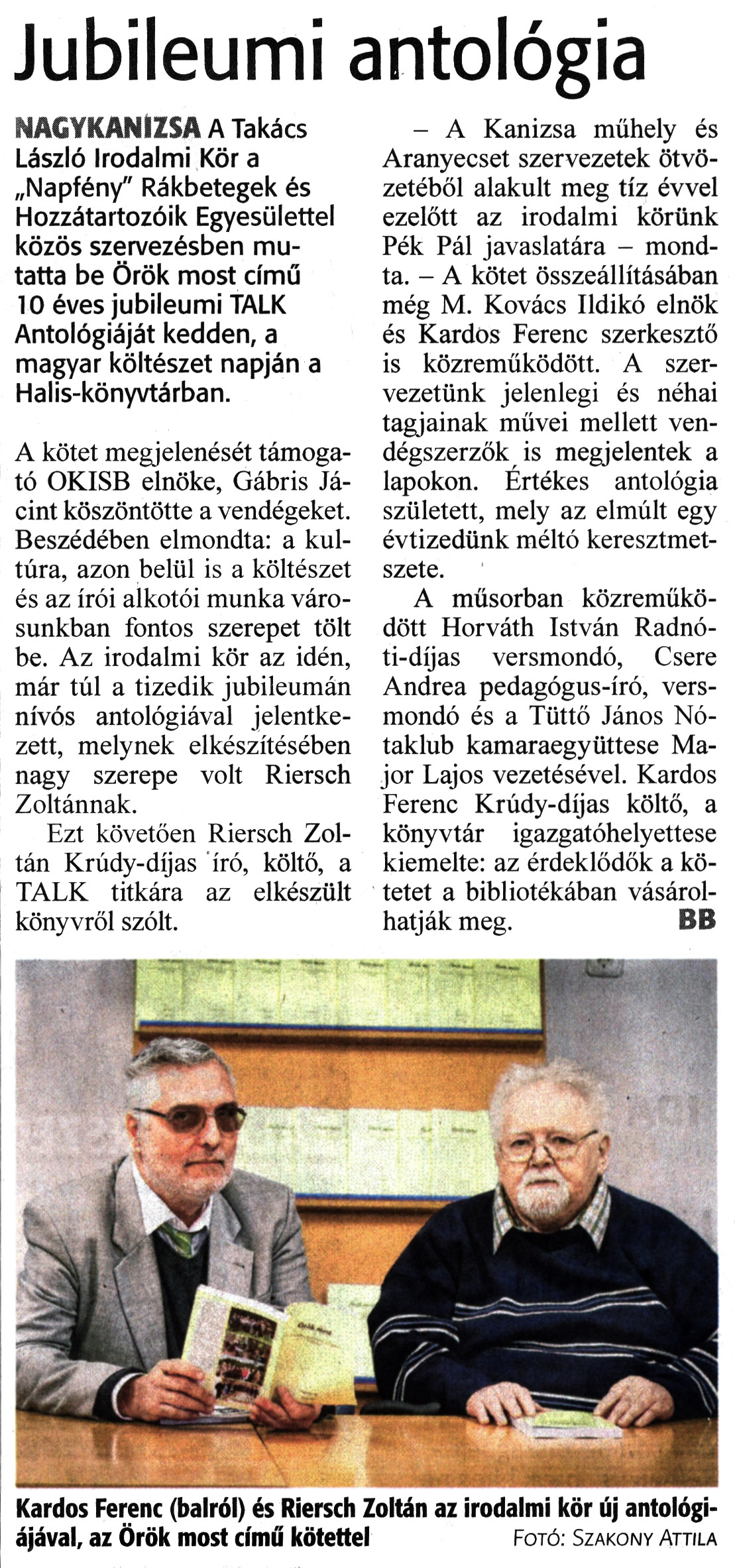 Nyilvános 1000 | 1250 | Zalai Hírlap 2023. április 13. 85. szám 2. oldal | Jubileumi antológia NAGYKANIZSA A Takács László Irodalmi Kör a „Napfény" Rákbetegek és Hozzátartozóik Egyesülettel közös szervezésben mutatta be Örök most című 10 éves jubileumi TALK Antológiáját kedden, a magyar költészet napján a Halis-könyvtárban. A kötet megjelenését támogató OKISB elnöke, Gábris Jácint köszöntötte a vendégeket. Beszédében elmondta: a kultúra, azon belül is a költészet és az írói alkotói munka városunkban fontos szerepet tölt be. Az irodalmi kör az idén, már túl a tizedik jubileumán nívós antológiával jelentkezett, melynek elkészítésében nagy szerepe volt Riersch Zoltánnak. Ezt követően Riersch Zoltán Krúdy-díjas író, költő, a TALK titkára az elkészült könyvről szólt. - A Kanizsa műhely és Aranyecset szervezetek ötvözetéből alakult meg tíz évvel ezelőtt az irodalmi körünk Pék Pál javaslatára - mondta. - A kötet összeállításában még M. Kovács Ildikó elnök és Kardos Ferenc szerkesztő is közreműködött. A szervezetünk jelenlegi és néhai tagjainak művei mellett vendégszerzők is megjelentek a lapokon. Értékes antológia született, mely az elmúlt egy évtizedünk méltó keresztmetszete. A műsorban közreműködött Horváth István Radnóti-díjas versmondó, Csere Andrea pedagógus-író, versmondó és a Tüttő János Nótaklub kamaraegyüttese Major Lajos vezetésével. Kardos Ferenc Krúdy-díjas költő, a könyvtár igazgatóhelyettese kiemelte: az érdeklődők a kötetet a bibliotékában vásárolhatják meg. BB Kardos Ferenc (balról) és Riersch Zoltán az irodalmi kör új antológiájával, az Örök most című kötettel Fotó. Szakony Attila |