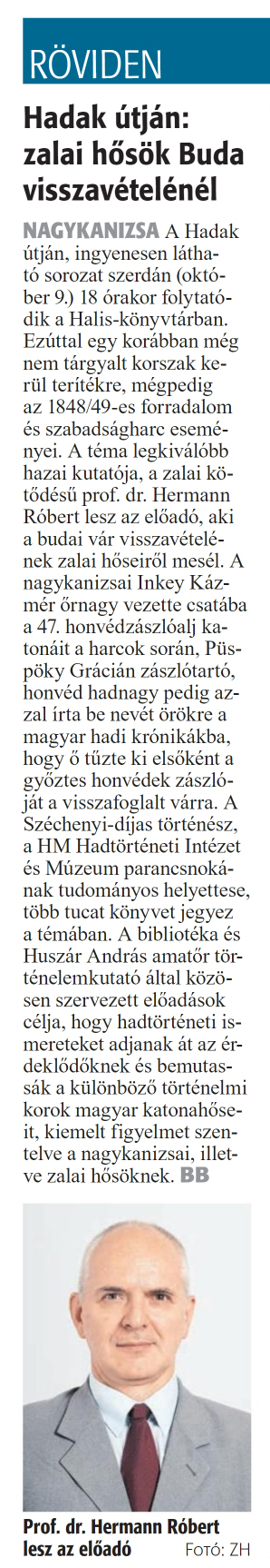 Nyilvános 617 | 780 | Zalai Hírlap 2024. október 7. 234. szám 2. oldal | RÖVIDEN Hadak útján: zalai hősök Buda visszavételénél NAGYKANIZSA A Hadak útján, ingyenesen látható sorozat szerdán (október 9.) 18 órakor folytatódik a Halis-könyvtárban. Ezúttal egy korábban még nem tárgyalt korszak kerül terítékre, mégpedig az 1848/49-es forradalom és szabadságharc eseményei. A téma legkiválóbb hazai kutatója, a zalai kötődésű prof. dr. Hermann Róbert lesz az előadó, aki a budai vár visszavételének zalai hőseiről mesél. A nagykanizsai Inkey Kázmér őrnagy vezette csatába a 47. honvédzászlóalj katonáit a harcok során, Püspöky Grácián zászlótartó, honvéd hadnagy pedig azzal írta be nevét örökre a magyar hadi krónikákba, hogy ő tűzte ki elsőként a győztes honvédek zászlóját a visszafoglalt várra. A Széchenyi-díjas történész, a HM Hadtörténeti Intézet és Múzeum parancsnokának tudományos helyettese, több tucat könyvet jegyez a témában. A bibliotéka és Huszár András amatőr történelemkutató által közösen szervezett előadások célja, hogy hadtörténeti ismereteket adjanak át az érdeklődőknek és bemutassák a különböző történelmi korok magyar katonahőseit, kiemelt figyelmet szentelve a nagykanizsai, illetve zalai hősöknek. BB Prof. dr. Hermann Róbert lesz az előadó Fotó: ZH |