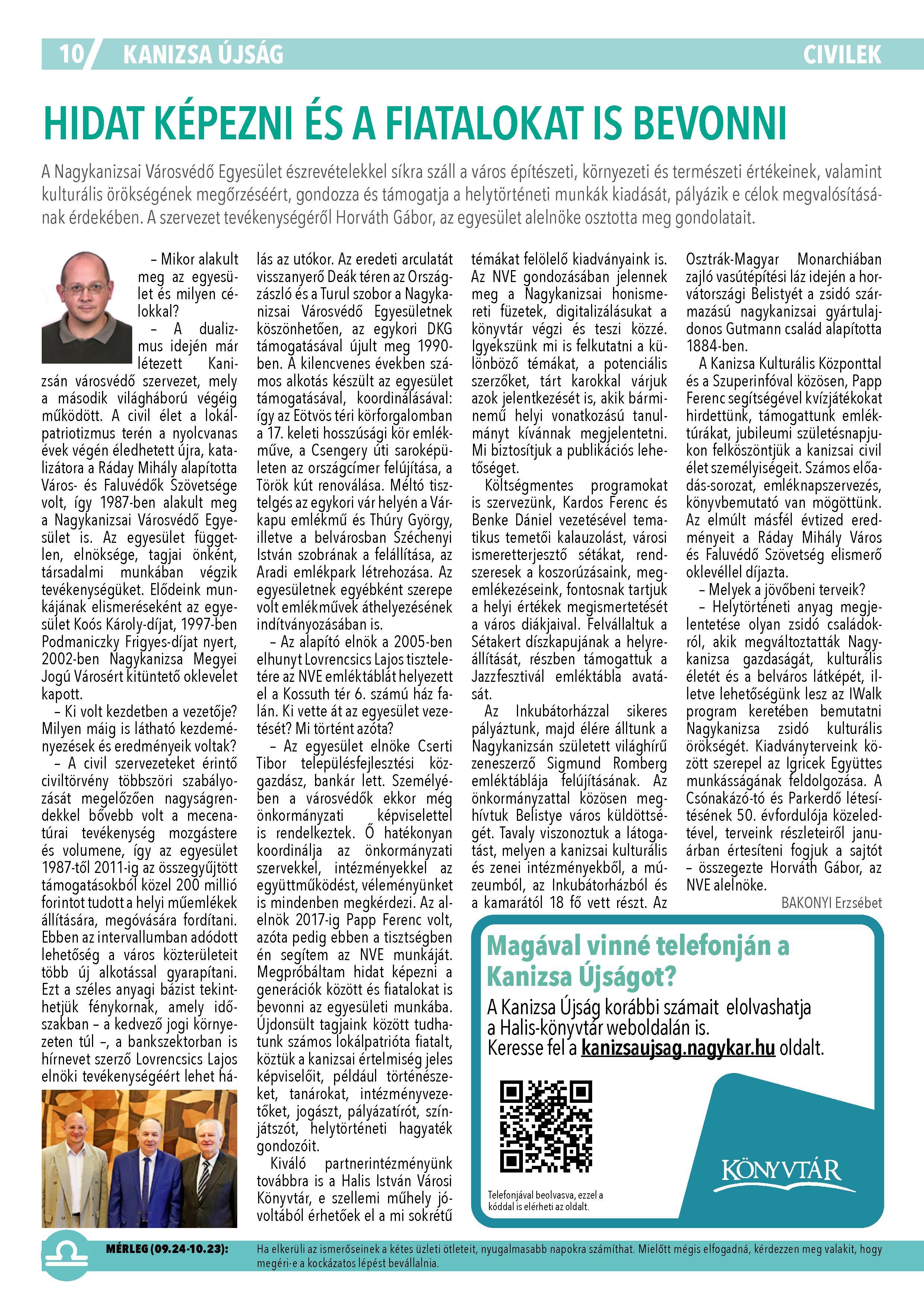 Nyilvános 802 | 992 | Kanizsa 2025. január 8. 1. szám 10. oldal | HIDAT KÉPEZNI ÉS A FIATALOKAT IS BEVONNI A Nagykanizsai Városvédő Egyesület észrevételekkel síkra száll a város építészeti, környezeti és természeti értékeinek, valamint kulturális örökségének megőrzéséért, gondozza és támogatja a helytörténeti munkák kiadását, pályázik e célok megvalósításának érdekében. A szervezet tevékenységéről Horváth Gábor, az egyesület alelnöke osztotta meg gondolatait. – Mikor alakult meg az egyesület és milyen célokkal? – A dualizmus idején már létezett Kanizsán városvédő szervezet, mely a második világháború végéig működött. A civil élet a lokálpatriotizmus terén a nyolcvanas évek végén éledhetett újra, katalizátora a Ráday Mihály alapította Város- és Faluvédők Szövetsége volt, így 1987-ben alakult meg a Nagykanizsai Városvédő Egyesület is. Az egyesület független, elnöksége, tagjai önként, társadalmi munkában végzik tevékenységüket. Elődeink munkájának elismeréseként az egyesület Koós Károly-díjat, 1997-ben Podmaniczky Frigyes-díjat nyert, 2002-ben Nagykanizsa Megyei Jogú Városért kitüntető oklevelet kapott. – Ki volt kezdetben a vezetője? Milyen máig is látható kezdeményezések és eredményeik voltak? – A civil szervezeteket érintő civiltörvény többszöri szabályozását megelőzően nagyságrendekkel bővebb volt a mecenatúrai tevékenység mozgástere és volumene, így az egyesület 1987-től 2011-ig az összegyűjtött támogatásokból közel 200 millió forintot tudott a helyi műemlékek állítására, megóvására fordítani. Ebben az intervallumban adódott lehetőség a város közterületeit több új alkotással gyarapítani. Ezt a széles anyagi bázist tekinthetjük fénykornak, amely időszakban – a kedvező jogi környezeten túl –, a bankszektorban is hírnevet szerző Lovrencsics Lajos elnöki tevékenységéért lehet hálás az utókor. Az eredeti arculatát visszanyerő Deák téren az Országzászló és a Turul szobor a Nagykanizsai Városvédő Egyesületnek köszönhetően, az egykori DKG támogatásával újult meg 1990- ben. A kilencvenes években számos alkotás készült az egyesület támogatásával, koordinálásával: így az Eötvös téri körforgalomban a 17. keleti hosszúsági kör emlékműve, a Csengery úti saroképületen az országcímer felújítása, a Török kút renoválása. Méltó tisztelgés az egykori vár helyén a Várkapu emlékmű és Thúry György, illetve a belvárosban Széchenyi István szobrának a felállítása, az Aradi emlékpark létrehozása. Az egyesületnek egyébként szerepe volt emlékművek áthelyezésének indítványozásában is. – Az alapító elnök a 2005-ben elhunyt Lovrencsics Lajos tiszteletére az NVE emléktáblát helyezett el a Kossuth tér 6. számú ház falán. Ki vette át az egyesület vezetését? Mi történt azóta? – Az egyesület elnöke Cserti Tibor településfejlesztési közgazdász, bankár lett. Személyében a városvédők ekkor még önkormányzati képviselettel is rendelkeztek. Ő hatékonyan koordinálja az önkormányzati szervekkel, intézményekkel az együttműködést, véleményünket is mindenben megkérdezi. Az alelnök 2017-ig Papp Ferenc volt, azóta pedig ebben a tisztségben én segítem az NVE munkáját. Megpróbáltam hidat képezni a generációk között és fiatalokat is bevonni az egyesületi munkába. Újdonsült tagjaink között tudhatunk számos lokálpatrióta fiatalt, köztük a kanizsai értelmiség jeles képviselőit, például történészeket, tanárokat, intézményvezetőket, jogászt, pályázatírót, színjátszót, helytörténeti hagyaték gondozóit. Kiváló partnerintézményünk továbbra is a Halis István Városi Könyvtár, e szellemi műhely jóvoltából érhetőek el a mi sokrétű témákat felölelő kiadványaink is. Az NVE gondozásában jelennek meg a Nagykanizsai honismereti füzetek, digitalizálásukat a könyvtár végzi és teszi közzé. Igyekszünk mi is felkutatni a különböző témákat, a potenciális szerzőket, tárt karokkal várjuk azok jelentkezését is, akik bárminemű helyi vonatkozású tanulmányt kívánnak megjelentetni. Mi biztosítjuk a publikációs lehetőséget. Költségmentes programokat is szervezünk, Kardos Ferenc és Benke Dániel vezetésével tematikus temetői kalauzolást, városi ismeretterjesztő sétákat, rendszeresek a koszorúzásaink, megemlékezéseink, fontosnak tartjuk a helyi értékek megismertetését a város diákjaival. Felvállaltuk a Sétakert díszkapujának a helyreállítását, részben támogattuk a Jazzfesztivál emléktábla avatását. A z Inkubátorházzal sikeres pályáztunk, majd élére álltunk a Nagykanizsán született világhírű zeneszerző Sigmund Romberg emléktáblája felújításának. Az önkormányzattal közösen meghívtuk Belistye város küldöttségét. Tavaly viszonoztuk a látogatást, melyen a kanizsai kulturális és zenei intézményekből, a múzeumból, az Inkubátorházból és a kamarától 18 fő vett részt. Az Osztrák-Magyar Monarchiában zajló vasútépítési láz idején a horvátországi Belistyét a zsidó származású nagykanizsai gyártulajdonos Gutmann család alapította 1884-ben. A Kanizsa Kulturális Központtal és a Szuperinfóval közösen, Papp Ferenc segítségével kvízjátékokat hirdettünk, támogattunk emléktúrákat, jubileumi születésnapjukon felköszöntjük a kanizsai civil élet személyiségeit. Számos előadás- sorozat, emléknapszervezés, könyvbemutató van mögöttünk. Az elmúlt másfél évtized eredményeit a Ráday Mihály Város és Faluvédő Szövetség elismerő oklevéllel díjazta. – Melyek a jövőbeni terveik? – Helytörténeti anyag megjelentetése olyan zsidó családokról, akik megváltoztatták Nagykanizsa gazdaságát, 