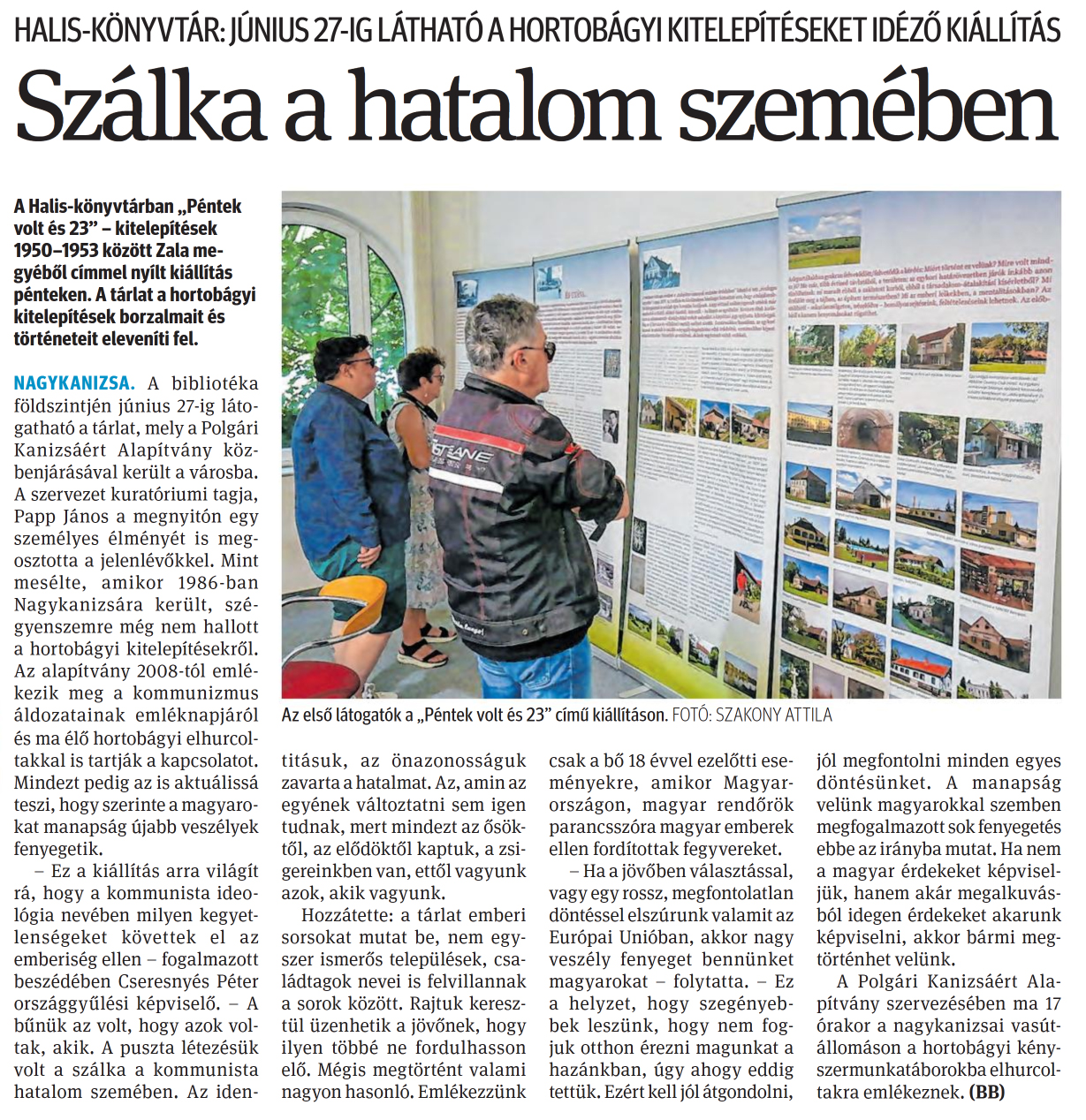 Nyilvános 878 | 1355 | Zalai Hírlap 2025. június 16. 137. szám 3. oldal | HALIS-KÖNYVTÁR: JÚNIUS 27-IG LÁTHATÓ A HORTOBÁGYI KITELEPÍTÉSEKET IDÉZŐ KIÁLLÍTÁS Szálka a hatalom szemében Az első látogatók a „Péntek volt és 23" című kiállításon. FOTÓ: SZAKONY ATTILA A Halis-könyvtárban „Péntek volt és 23" - kitelepítések 1950-1953 között Zala megyéből címmel nyílt kiállítás pénteken. A tárlat a hortobágyi kitelepítések borzalmait és történeteit eleveníti fel. NAGYKANIZSA. A bibliotéka földszintjén június 27-ig látogatható a tárlat, mely a Polgári Kanizsáért Alapítvány közbenjárásával került a városba. A szervezet kuratóriumi tagja, Papp János a megnyitón egy személyes élményét is megosztotta a jelenlévőkkel. Mint mesélte, amikor 1986-ban Nagykanizsára került, szégyenszemre még nem hallott a hortobágyi kitelepítésekről. Az alapítvány 2008-tól emlékezik meg a kommunizmus áldozatainak emléknapjáról és ma élő hortobágyi elhurcol-takkal is tartják a kapcsolatot. Mindezt pedig az is aktuálissá teszi, hogy szerinte a magyarokat manapság újabb veszélyek fenyegetik. - Ez a kiállítás arra világít rá, hogy a kommunista ideológia nevében milyen kegyetlenségeket követtek el az emberiség ellen - fogalmazott beszédében Cseresnyés Péter országgyűlési képviselő. - A bűnük az volt, hogy azok voltak, akik. A puszta létezésük volt a szálka a kommunista hatalom szemében. Az identitásuk, az önazonosságuk zavarta a hatalmat. Az, amin az egyének változtatni sem igen tudnak, mert mindezt az ősöktől, az elődöktől kaptuk, a zsigereinkben van, ettől vagyunk azok, akik vagyunk. Hozzátette: a tárlat emberi sorsokat mutat be, nem egyszer ismerős települések, családtagok nevei is felvillannak a sorok között. Rajtuk keresztül üzenhetik a jövőnek, hogy ilyen többé ne fordulhasson elő. Mégis megtörtént valami nagyon hasonló. Emlékezzünk csak a bő 18 évvel ezelőtti eseményekre, amikor Magyarországon, magyar rendőrök parancsszóra magyar emberek ellen fordítottak fegyvereket. - Ha a jövőben választással, vagy egy rossz, megfontolatlan döntéssel elszúrunk valamit az Európai Unióban, akkor nagy veszély fenyeget bennünket magyarokat - folytatta. - Ez a helyzet, hogy szegényebbek leszünk, hogy nem fogjuk otthon érezni magunkat a hazánkban, úgy ahogy eddig tettük. Ezért kell jól átgondolni, jól megfontolni minden egyes döntésünket. A manapság velünk magyarokkal szemben megfogalmazott sok fenyegetés ebbe az irányba mutat. Ha nem a magyar érdekeket képviseljük, hanem akár megalkuvásból idegen érdekeket akarunk képviselni, akkor bármi megtörténhet velünk. A Polgári Kanizsáért Alapítvány szervezésében ma 17 órakor a nagykanizsai vasútállomáson a hortobágyi kényszermunkatáborokba elhurcol-takra emlékeznek. (BB) |