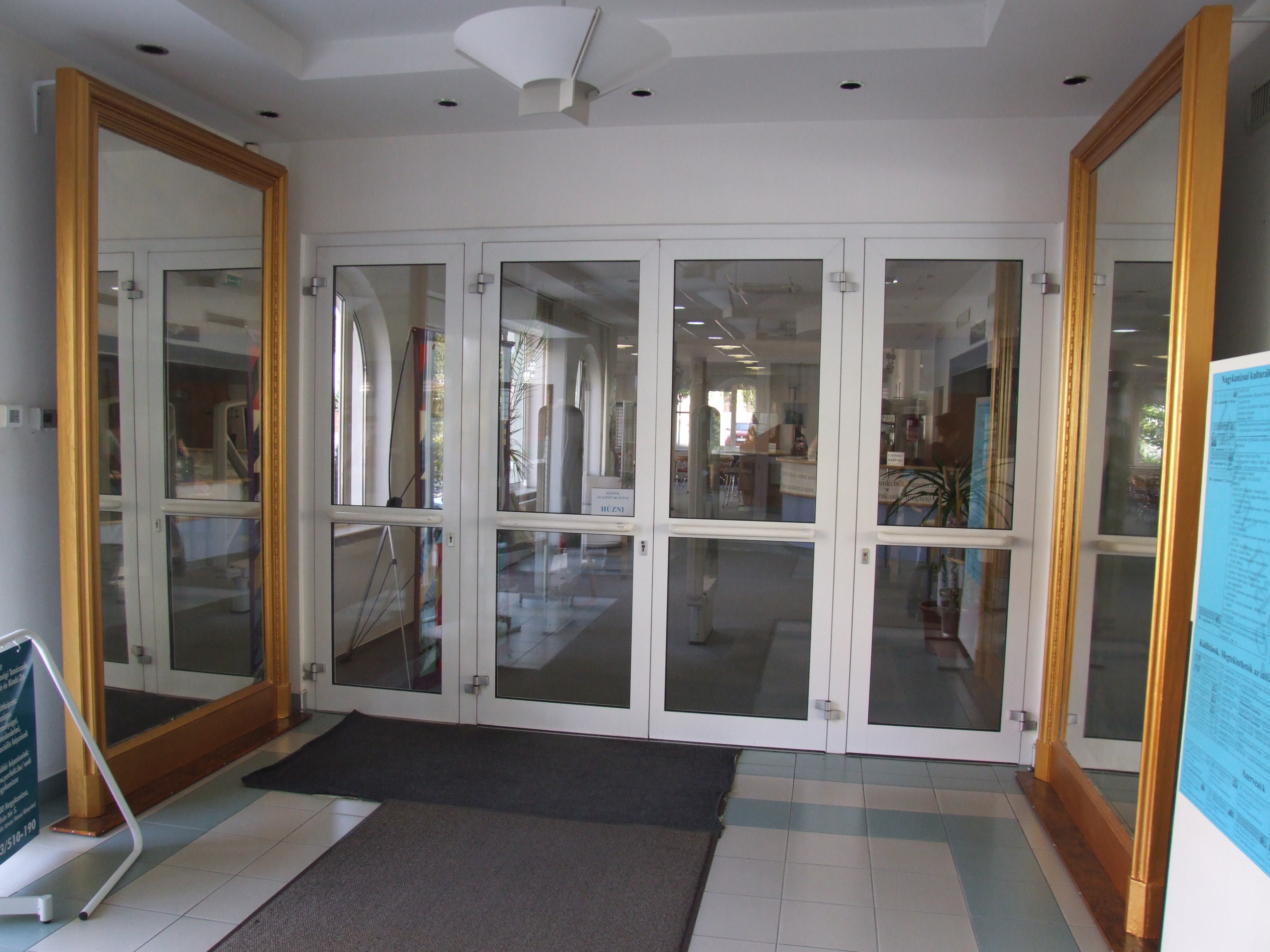 Nyilvános 1258 | 2656 | Rövid leírás | Teljes leírás (417 B) | A 60 éves születésnapját ünneplő könyvtár a kezdetek (1950-es évek) után a Sugár út 3-ban töltött időszak bemutatására készül (1956-1988). A bemutató több eleme látható már az épületben, köztük az a két nagy méretű tükör is, mely a Sugár úti épület dísze volt. A tükrök a bejáratnál kerültek elhelyezésre Tarnóczky Attila felújító munkája után. (2011. szeptember 15.) |