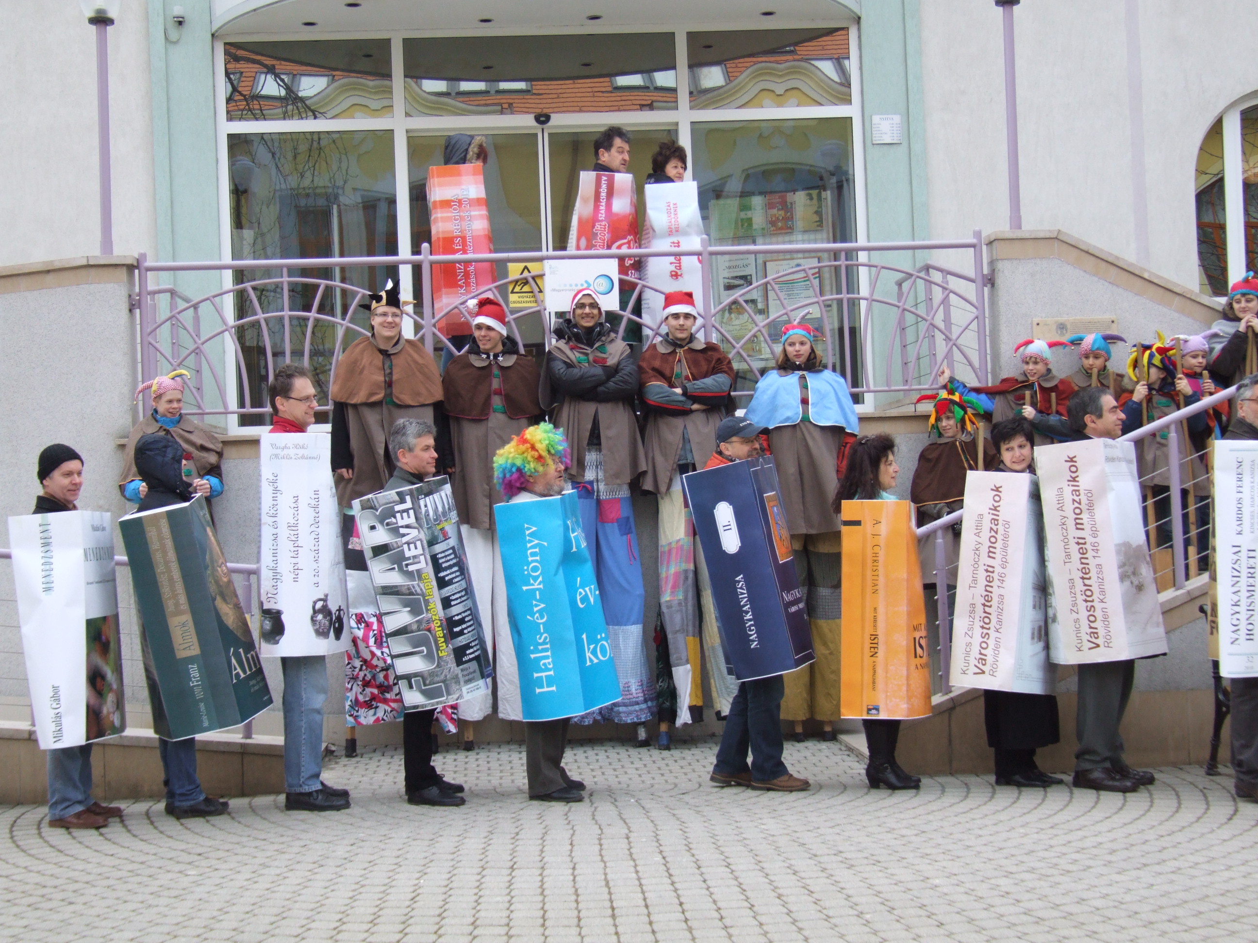 Nyilvános 1324 | 2889 | 2013. február 9. A farsangi fánkfesztiválra készülve felhívásban kértük olvasóinkat, hogy öltsék magukra kedves könyvüket. Egy „könyvespolcnyi” jelentkező vette magára kedves olvasmányát, az ő vonulásukról készültek ezek a képek. A környezetükben néhol láthatók a Nagykanizsai Gólyalábasok, akik szintén a könyvtárhoz kötődnek. A „felvonuló kötetek” a könyvtár épületében még megtekinthetők. | |