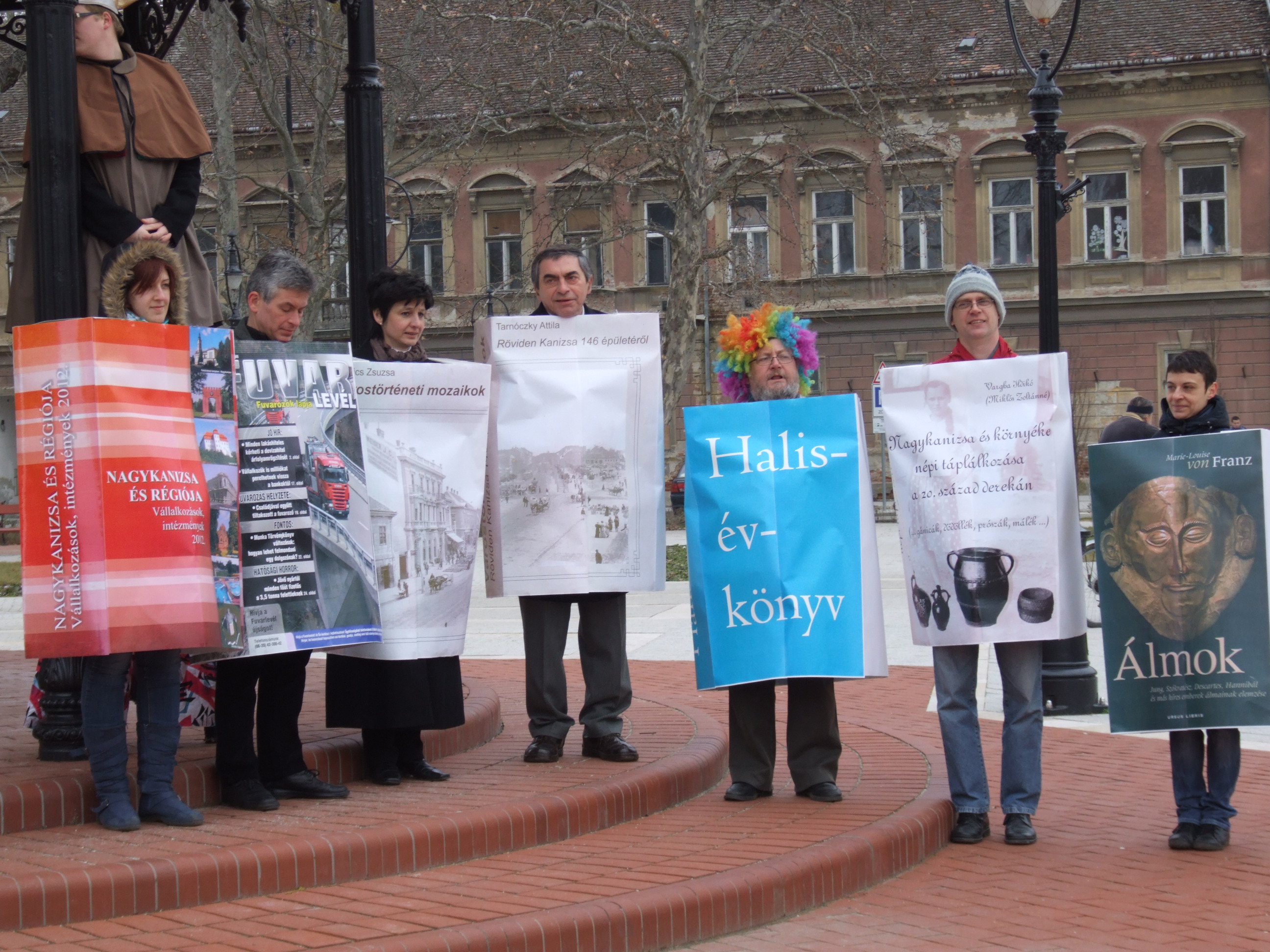 Nyilvános 933 | 1298 | 2013. február 9. A farsangi fánkfesztiválra készülve felhívásban kértük olvasóinkat, hogy öltsék magukra kedves könyvüket. Egy „könyvespolcnyi” jelentkező vette magára kedves olvasmányát, az ő vonulásukról készültek ezek a képek. A környezetükben néhol láthatók a Nagykanizsai Gólyalábasok, akik szintén a könyvtárhoz kötődnek. A „felvonuló kötetek” a könyvtár épületében még megtekinthetők. | |