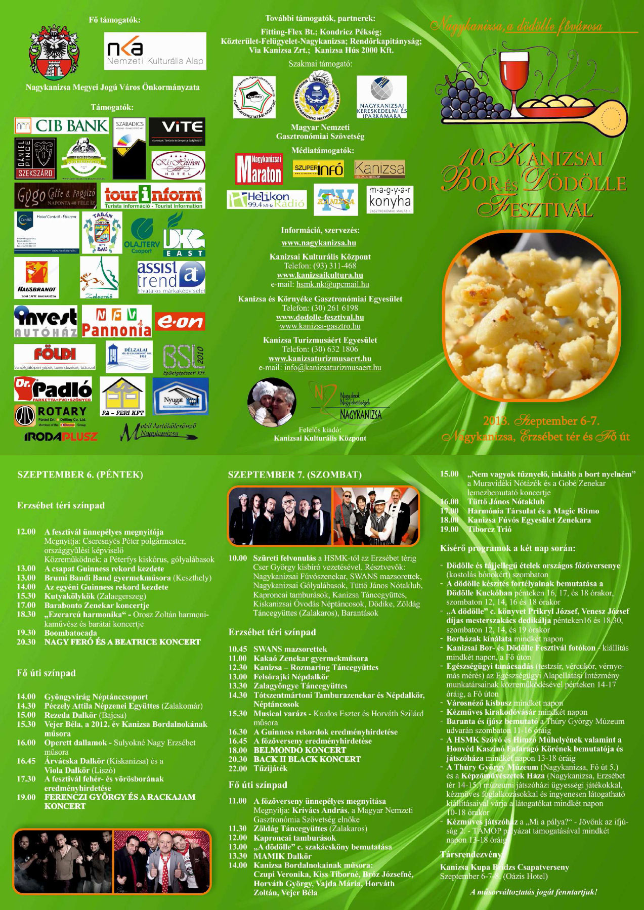 Nyilvános 1434 | 4007 | X. Kanizsai Bor- és Dödölle Fesztivál | 2013. szeptember 6. - 2013. szeptember 7. X. Kanizsai Bor- és Dödölle Fesztivál SZEPTEMBER 6. (PÉNTEK) Erzsébet téri színpad 12.00 A fesztivál ünnepélyes megnyitója Megnyitja: Cseresnyés Péter polgármester,országgyűlési képviselő Közreműködnek: a Péterfys kiskórus, gólyalábasok 13.00 A csapat Guinness rekord kezdete 13.00 Brumi Bandi Band gyermekműsora (Keszthely) 14.00 Az egyéni Guinness rekord kezdete 15.30 Kutyakölykök (Zalaegerszeg) 17.00 Barabonto Zenekar koncertje 18.30 „Ezerarcú harmonika“ - Orosz Zoltán harmonikaművész és barátai koncertje 19.30 Boombatocada 20.30 NAGY FERÓ ÉS A BEATRICE KONCERT Fő úti színpad 14.00 Gyöngyvirág Néptánccsoport 14.30 Péczely Attila Népzenei Együttes (Zalakomár) 15.00 Rezeda Dalkör (Bajcsa) 15.30 Vejer Béla, a 2012. év Kanizsa Bordalnokának műsora 16.00 Operett dallamok - Sulyokné Nagy Erzsébet műsora 16.45 Árvácska Dalkör (Kiskanizsa) és a Viola Dalkör (Liszó) 17.30 A fesztivál fehér- és vörösborának eredményhirdetése 19.00 FERENCZI GYÖRGY ÉS A RACKAJAM KONCERT SZEPTEMBER 7. (SZOMBAT) 10.00 Szüreti felvonulás a HSMK-tól az Erzsébet térig Cser György kisbíró vezetésével. Résztvevők: Nagykanizsai Fúvószenekar, SWANS mazsorettek, Nagykanizsai Gólyalábasok, Tüttő János Nótaklub, Kaproncai tamburások, Kanizsa Táncegyüttes, Kiskanizsai Óvodás Néptáncosok, Dödike, Zöldág Táncegyüttes (Zalakaros) Erzsébet téri színpad 10.45 SWANS mazsorettek 11.00 Kakaó Zenekar gyermekműsora 12.30 Kanizsa – Rozmaring Táncegyüttes 13.00 Felsőrajki Népdalkör 13.30 Zalagyöngye Táncegyüttes 14.30 Tótszentmártoni Tamburazenekar és Népdalkör, Néptáncosok 15.30 Musical varázs - Kardos Eszter és Horváth Szilárd műsora 16.30 A Guinness rekordok eredményhirdetése 16.45 A főzőverseny eredményhirdetése 18.00 BELMONDO KONCERT 20.30 BACK II BLACK KONCERT 22.00 Tűzijáték Fő úti színpad 11.00 A főzőverseny ünnepélyes megnyitása Megnyitja: Krivács András, a Magyar Nemzeti Gasztronómia Szövetség elnöke 11.30 Zöldág Táncegyüttes (Zalakaros) 12.00 Kaproncai tamburások 13.00 „A dödölle” c. szakácsköny bemutatása 13.30 MAMIK Dalkör 14.00 Kanizsa Bordalnokainak műsora: Czupi Veronika, Kiss Tiborné, Bróz Józsefné, Horváth György, Vajda Mária, Horváth Zoltán, Vejer Béla 15.00 „Nem vagyok tűznyelő, inkább a bort nyelném” a Muravidéki Nótázók és a Gobé Zenekar lemezbemutató koncertje 16.00 Tüttő János Nótaklub 17.00 Harmónia Társulat és a Magic Ritmo 18.00 Kanizsa Fúvós Egyesület Zenekara 19.00 Tiborcz Trió Kísérő programok a két nap során: · Dödölle és tájjellegű ételek országos főzőversenye (kóstolás bónokért) szombaton · A dödölle készítés fortélyainak bemutatása a Dödölle Kuckóban pénteken 16, 17, és 18 órakor, szombaton 12, 14, 16 és 18 órakor · „A dödölle” c. könyvet Prikryl József, Venesz József díjas mesterszakács dedikálja pénteken16 és 18,30, szombaton 12, 14, és 19 órakor · Borházak kínálata mindkét napon · Kanizsai Bor- és Dödölle Fesztivál fotókon – kiállítás mindkét napon, a Fő úton · Egészségügyi tanácsadás (testzsír, vércukor, vérnyomás mérés) az Egészségügyi Alapellátási Intézmény munkatársainak közreműködésével pénteken 14-17 óráig, a Fő úton · Városnéző kisbusz mindkét napon · Kézműves kirakodóvásár mindkét napon · A HSMK Szövő és Hímző Műhelyének valamint a Honvéd Kaszinó Fafaragó Körének bemutatója és játszóháza mindkét napon 13-18 óráig · A Thúry György Múzeum (Nagykanizsa, Fő út 5.) és a Képzőművészetek Háza (Nagykanizsa, Erzsébet tér 14-15.) múzeumi játszóházi ügyességi játékokkal, kézműves foglalkozásokkal és ingyenesen látogatható kiállításaival várja a látogatókat mindkét napon 10-18 órakor · Kézműves játszóház a „Mi a pálya?“ - Jövőnk az ifjúság 2. - TÁMOP pályázat támogatásával mindkét napon 13-18 óráig Társrendezvény: Kanizsa Kupa Bridzs Csapatverseny Szeptember 6-7-8. (Oázis Hotel) A szervezők a műsorváltoztatás jogát fenntartják! (Forrás: http://www.nagykanizsa.hu/index.php?m=2&year=2013&month=8&day=6) |