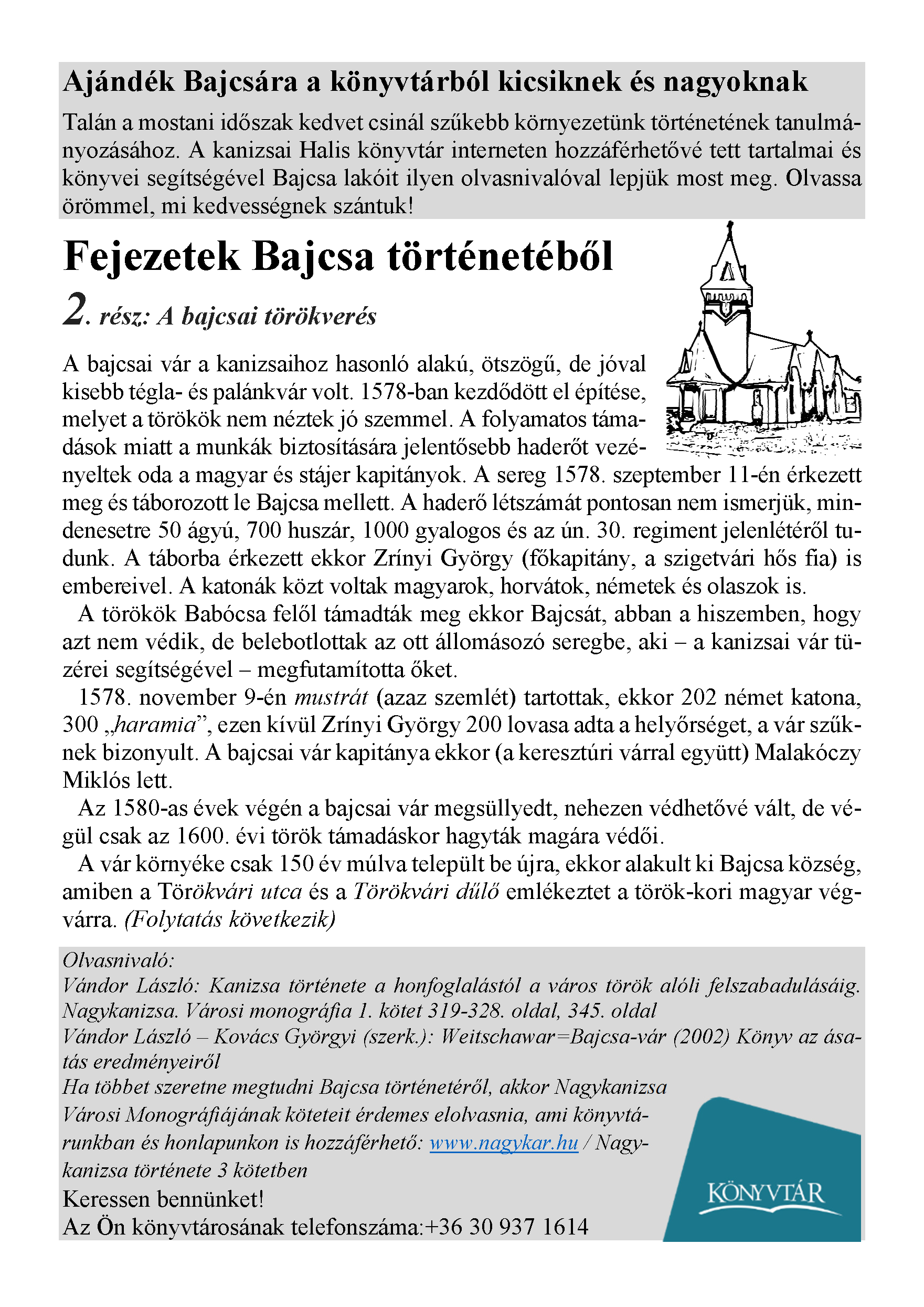 Nyilvános 1752 | 2979 | Megjelent: 2021. április 9. | Ajándék Bajcsára a könyvtárból kicsiknek és nagyoknak Talán a mostani időszak kedvet csinál szűkebb környezetünk történetének tanulmányozásához. A kanizsai Halis könyvtár interneten hozzáférhetővé tett tartalmai és könyvei segítségével Bajcsa lakóit ilyen olvasnivalóval lepjük most meg. Olvassa örömmel, mi kedvességnek szántuk! Fejezetek Bajcsa történetéből 2. rész: A bajcsai törökverés A bajcsai vár a kanizsaihoz hasonló alakú, ötszögű, de jóval kisebb tégla- és palánkvár volt. 1578-ban kezdődött el építése, melyet a törökök nem néztek jó szemmel. A folyamatos támadások miatt a munkák biztosítására jelentősebb haderőt vezényeltek oda a magyar és stájer kapitányok. A sereg 1578. szeptember 11-én érkezett meg és táborozott le Bajcsa mellett. A haderő létszámát pontosan nem ismerjük, mindenesetre 50 ágyú, 700 huszár, 1000 gyalogos és az ún. 30. regiment jelenlétéről tudunk. A táborba érkezett ekkor Zrínyi György (főkapitány, a szigetvári hős fia) is embereivel. A katonák közt voltak magyarok, horvátok, németek és olaszok is. A törökök Babócsa felől támadták meg ekkor Bajcsát, abban a hiszemben, hogy azt nem védik, de belebotlottak az ott állomásozó seregbe, aki – a kanizsai vár tüzérei segítségével – megfutamította őket. 1578. november 9-én mustrát (azaz szemlét) tartottak, ekkor 202 német katona, 300 „haramia”, ezen kívül Zrínyi György 200 lovasa adta a helyőrséget, a vár szűknek bizonyult. A bajcsai vár kapitánya ekkor (a keresztúri várral együtt) Malakóczy Miklós lett. Az 1580-as évek végén a bajcsai vár megsüllyedt, nehezen védhetővé vált, de végül csak az 1600. évi török támadáskor hagyták magára védői. A vár környéke csak 150 év múlva települt be újra, ekkor alakult ki Bajcsa község, amiben a Törökvári utca és a Törökvári dűlő emlékeztet a török-kori magyar végvárra. (Folytatás következik) Olvasnivaló: Vándor László: Kanizsa története a honfoglalástól a város török alóli felszabadulásáig. Nagykanizsa. Városi monográfia 1. kötet 319-328. oldal, 345. oldal Vándor László – Kovács Györgyi (szerk.): Weitschawar=Bajcsa-vár (2002) Könyv az ásatás eredményeiről Ha többet szeretne megtudni Bajcsa történetéről, akkor Nagykanizsa Városi Monográfiájának köteteit érdemes elolvasnia, ami könyvtá- runkban és honlapunkon is hozzáférhető: www.nagykar.hu / Nagy- kanizsa története 3 kötetben Keressen bennünket! |
