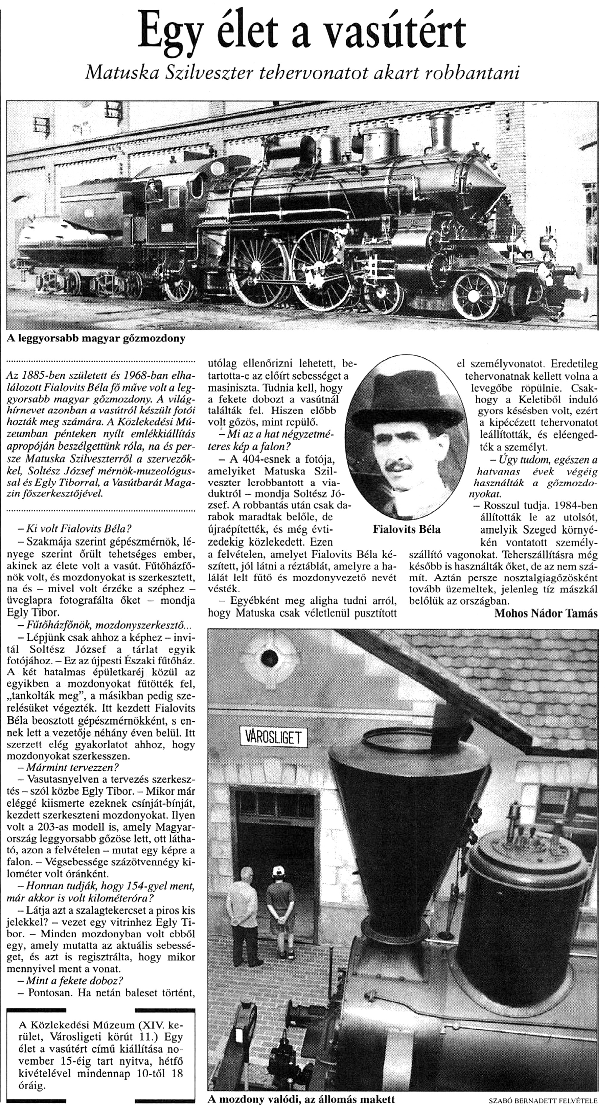 Nyilvános 1214 | 1953 | Népszabadság 1999. július 13. 28. oldal | Egy élet a vasútért Matuska Szilveszter tehervonatot akart robbantani A leggyorsabb magyar gőzmozdony Az 1885-ben született és 1968-ban elhalálozott Fialovits Béla fő műve volt a leggyorsabb magyar gőzmozdony. A világhírnevet azonban a vasútról készült fotói hozták meg számára. A Közlekedési Múzeumban pénteken nyílt emlékkiállítás apropóján beszélgettünk róla, na és persze Matuska Szilveszterről a szervezőkkel, Soltész József mérnök-muzeológussal és Egly Tiborral, a Vasútbarát Magazin főszerkesztőjével. - Ki volt Fialovits Béla ? - Szakmája szerint gépészmérnök, lényege szerint őrült tehetséges ember, akinek az élete volt a vasút. Fűtőházfőnök volt, és mozdonyokat is szerkesztett, na és - mivel volt érzéke a széphez — üveglapra fotografálta őket - mondja Egly Tibor. - Fűtőházfőnök, mozdony szerkesztő... - Lépjünk csak ahhoz a képhez - invitál Soltész József a tárlat egyik fotójához. — Ez az újpesti Északi fűtőház. A két hatalmas épületkaréj közül az egyikben a mozdonyokat fűtötték fel, „tankolták meg”, a másikban pedig szerelésüket végezték. Itt kezdett Fialovits Béla beosztott gépészmérnökként, s ennek lett a vezetője néhány éven belül. Itt szerzett elég gyakorlatot ahhoz, hogy mozdonyokat szerkesszen. - Mármint tervezzen ? - Vasutasnyelven a tervezés szerkesztés - szól közbe Egly Tibor. - Mikor már eléggé kiismerte ezeknek csínját-bínját, kezdett szerkeszteni mozdonyokat. Ilyen volt a 203-as modell is, amely Magyarország leggyorsabb gőzöse lett, ott látható, azon a felvételen - mutat egy képre a falon. — Végsebessége százötvennégy kilométer volt óránként. -Honnan tudják, hogy 154-gyel ment, már akkor is volt kilométeróra? - Látja azt a szalagtekercset a piros kis jelekkel? - vezet egy vitrinhez Egly Tibor. - Minden mozdonyban volt ebből egy, amely mutatta az aktuális sebességet, és azt is regisztrálta, hogy mikor mennyivel ment a vonat. - Mint a fekete doboz? - Pontosan. Ha netán baleset történt, utólag ellenőrizni lehetett, betartotta-e az előírt sebességet a masiniszta. Tudnia kell, hogy a fekete dobozt a vasútnál találták fel. Hiszen előbb volt gőzös, mint repülő. -Mi az a hat négyzetméteres kép a falon? - A 404-esnek a fotója, amelyiket Matuska Szilveszter lerobbantott a viaduktról — mondja Soltész József. A robbantás után csak darabok maradtak belőle, de újraépítették, és még évtizedekig közlekedett. Ezen a felvételen, amelyet Fialovits Béla készített, jól látni a réztáblát, amelyre a halálát lelt fűtő és mozdonyvezető nevét vésték. - Egyébként meg aligha tudni arról, hogy Matuska csak véletlenül pusztított el személyvonatot. Eredetileg tehervonatnak kellett volna a levegőbe röpülnie. Csakhogy a Keletiből induló gyors késésben volt, ezért a kipécézett tehervonatot leállították, és elengedték a személyt. - Úgy tudom, egészen a hatvanas évek végéig használták a gőzmozdonyokat. - Rosszul tudja. 1984-ben állították le az utolsót, amelyik Szeged környékén vontatott személyszállító vagonokat. Teherszállításra még később is használták őket, de az nem számít. Aztán persze nosztalgiagőzösként tovább üzemeltek, jelenleg tíz mászkál belőlük az országban. Mohos Nádor Tamás A Közlekedési Múzeum (XIV. kerület, Városligeti körút 11.) Egy élet a vasútért című kiállítása november 15-éig tart nyitva, hétfő kivételével mindennap 10-től 18 óráig. A mozdony valódi, az állomás makett szabó Bernadett felvétele |