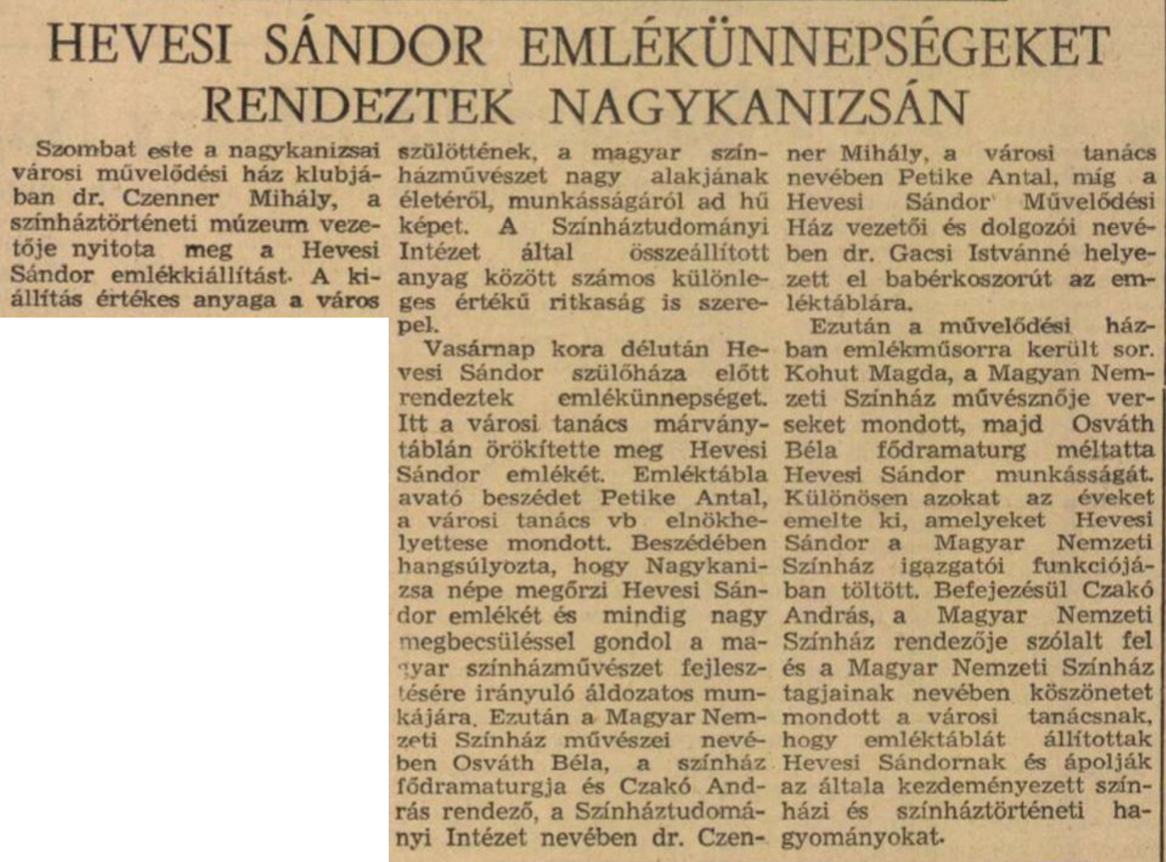 Nyilvános 1170 | 2015 | Zalai Hírlap 1964. december 15. 6. oldal | HEVESI SÁNDOR EMLÉKÜNNEPSÉGEKET RENDEZTEK NAGYKANIZSÁN Szombat este a nagykanizsai városi művelődési ház klubjában dr. Czenner Mihály, a színháztörténeti múzeum vezetője nyitotta meg a Hevesi Sándor emlékkiállítást - A kiállítás értékes anyaga a város szülöttének, a magyar színházművészet nagy alakjának életéről, munkásságáról ad hű képet. A Színháztudományi Intézet által összeállított anyag között számos különleges értékű ritkaság is szerepel. Vasárnap kora délután Hevesi Sándor szülőháza előtt rendeztek emlékünnepséget. Itt a városi tanács márványtáblán örökítette meg Hevesi Sándor emlékét. Emléktábla avató beszédet Petike Antal, a városi tanács vb elnökhelyettese mondott. Beszédében hangsúlyozta, hogy Nagykanizsa népe megőrzi Hevesi Sándor emlékét és mindig nagy megbecsüléssel gondol a magyar színházművészet fejlesztésére irányuló áldozatos munkájára. Ezután a Magyar Nemzeti Színház művészei nevében Osváth Béla, a színház fődramaturgja és Czakó András rendező, a Színháztudományi Intézet nevében dr. Czenner Mihály, a városi tanács nevében Petike Antal, míg a Hevesi Sándor Művelődési Ház vezetői és dolgozói nevében dr. Gacsi Istvánné helyezett el babérkoszorút az emléktáblára. Ezután a művelődési házban emlékműsorra került sor. Kohut Magda, a Magyan Nemzeti Színház művésznője verseket mondott, majd Osváth Béla fődramaturg méltatta Hevesi Sándor munkásságát. Különösen azokat az éveket emelte ki, amelyeket Hevesi Sándor a Magyar Nemzeti Színház igazgatói funkciójában töltött. Befejezésül Czakó András, a Magyar Nemzeti Színház rendezője szólalt fel és a Magyar Nemzeti Színház tagjainak nevében köszönetét mondott a városi tanácsnak, hogy emléktáblát állítottak Hevesi Sándornak és ápolják az általa kezdeményezett színházi és színháztörténeti hagyományokat. |