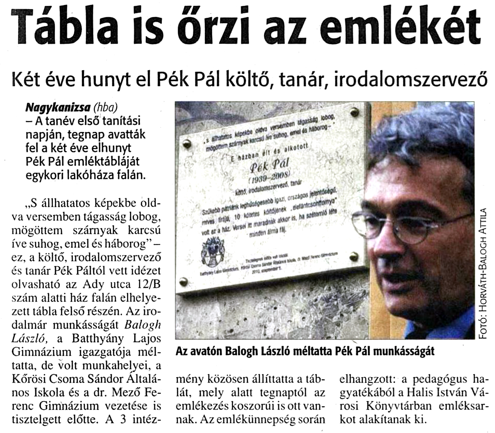 Nyilvános 861 | 1105 | Zalai Hírlap 2010. szeptember 2. 4. oldal | Tábla is őrzi az emlékét Két éve hunyt el Pék Pál költő, tanár, irodalomszervező Nagykanizsa (hba) - A tanév első tanítási napján, tegnap avatták fel a két éve elhunyt Pék Pál emléktábláját egykori lakóháza falán. „S állhatatos képekbe oldva versemben tágasság lobog, mögöttem szárnyak karcsú íve suhog, emel és háborog” - ez, a költő, irodalomszervező és tanár Pék Páltól vett idézet olvasható az Ady utca 12/B szám alatti ház falán elhelyezett tábla felső részén. Az irodalmár munkásságát Balogh László, a Batthyány Lajos Gimnázium igazgatója méltatta, de volt munkahelyei, a Körösi Csorna Sándor Általános Iskola és a dr. Mező Ferenc Gimnázium vezetése is tisztelgett előtte. A 3 intézmény közösen állíttatta a táblát, mely alatt tegnaptól az emlékezés koszorúi is ott vannak. Az emlékünnepség során elhangzott: a pedagógus hagyatékából a Halis István Városi Könyvtárban emléksarkot alakítanak ki. |