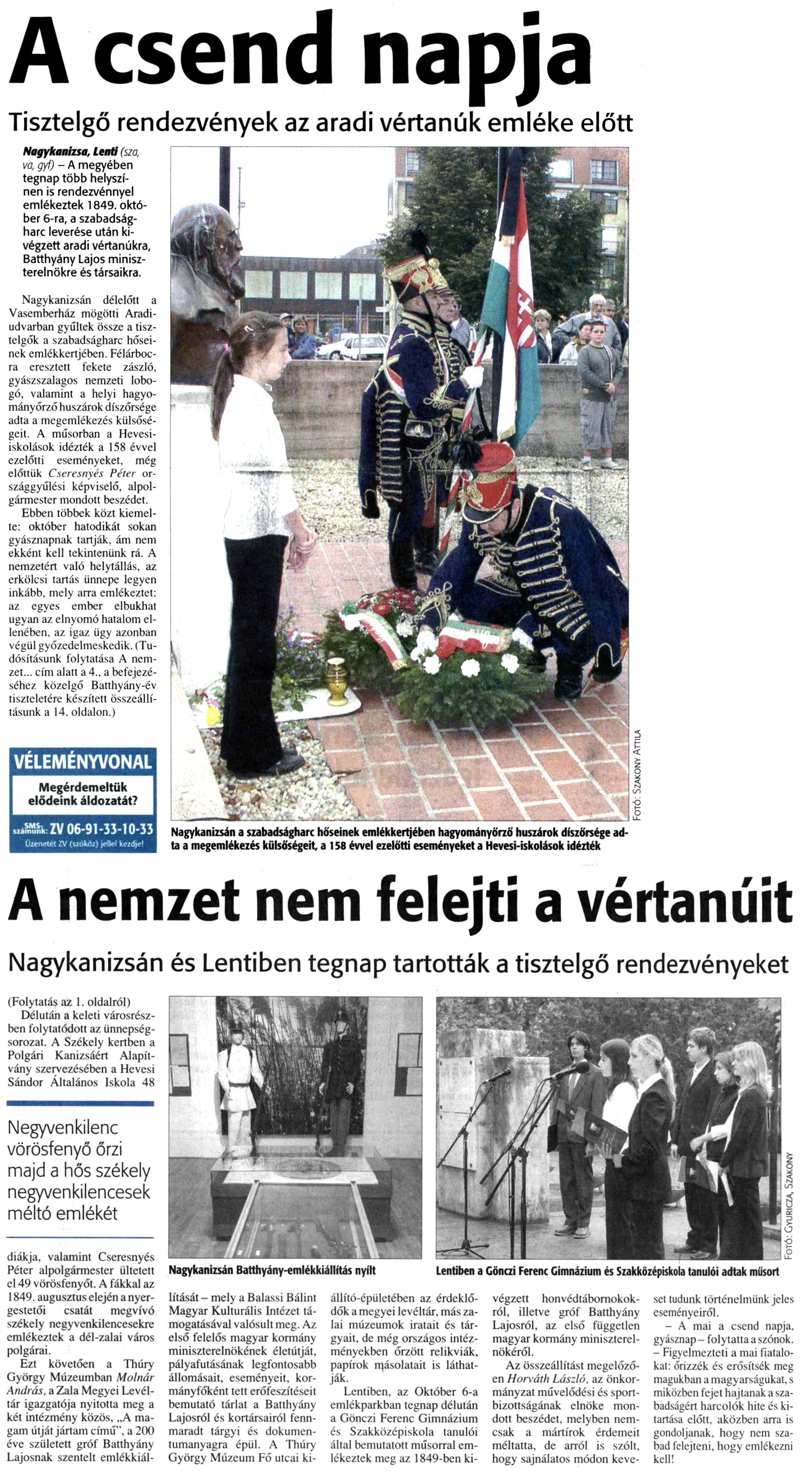 Nyilvános 449 | 625 | Zalai Hírlap 2007. október 6. 1, 4. oldal | A csend napja Tisztelgő rendezvények az aradi vértanúk emléke előtt Nagykanizsa, Lenti (sza, va, gyf) - A megyében tegnap több helyszínen is rendezvénnyel emlékeztek 1849. október 6-ra, a szabadságharc leverése után kivégzett aradi vértanúkra, Batthyány Lajos miniszterelnökre és társaikra. Nagykanizsán délelőtt a Vasemberház mögötti Aradiudvarban gyűltek össze a tisztelgők a szabadságharc hőseinek emlékkertjében. Félárbocra eresztett fekete zászló, gyászszalagos nemzeti lobogó, valamint a helyi hagyományőrző huszárok díszőrsége adta a megemlékezés külsőségeit. A műsorban a Hevesiiskolások idézték a 158 évvel ezelőtti eseményeket, még előttük Cseresnyés Péter országgyűlési képviselő, alpolgármester mondott beszédet. Ebben többek közt kiemelte: október hatodikét sokan gyásznapnak tartják, ám nem ekként kell tekintenünk rá. A nemzetért való helytállás, az erkölcsi tartás ünnepe legyen inkább, mely arra emlékeztet: az egyes ember elbukhat ugyan az elnyomó hatalom ellenében, az igaz ügy azonban végül győzedelmeskedik. (Tudósításunk folytatása A nemzet... cím alatt a 4., a befejezéséhez közelgő Batthyány-év tiszteletére készített összeállításunk a 14. oldalon.) A nemzet nem felejti a vértanúit Nagykanizsán és Lentiben tegnap tartották a tisztelgő rendezvényeket (Folytatás az 1. oldalról) Délután a keleti városrészben folytatódott az ünnepség-sorozat. A Székely kertben a Polgári Kanizsáért Alapítvány szervezésében a Hevesi Sándor Általános Iskola 48 diákja, valamint Cseresnyés Péter alpolgármester ültetett el 49 vörösfenyőt. A fákkal az 1849. augusztus elején a nyergestetői csatát megvívó székely negyvenkilencesekre emlékeztek a dél-zalai város polgárai. Ezt követően a Thúry György Múzeumban Molnár András, a Zala Megyei Levéltár igazgatója nyitotta meg a két intézmény közös, „A magam útját jártam című”, a 200 éve született gróf Batthyány Lajosnak szentelt emlékkiállítását - mely a Balassi Bálint Magyar Kulturális Intézet támogatásával valósult meg. Az első felelős magyar kormány miniszterelnökének életútját, pályafutásának legfontosabb állomásait, eseményeit, kormányfőként tett erőfeszítéseit bemutató tárlat a Batthyány Lajosról és kortársairól fennmaradt tárgyi és dokumentumanyagra épül. A Thúry György Múzeum Fő utcai kiállító- épületében az érdeklődők a megyei levéltár, más zalai múzeumok iratait és tárgyait, de még országos intézményekben őrzött relikviák, papírok másolatait is láthatják. Lentiben, az Október 6-a emlékparkban tegnap délután a Gönczi Ferenc Gimnázium és Szakközépiskola tanulói által bemutatott műsorral emlékeztek meg az 1849-ben kivégzett honvédtábornokokról, illetve gróf Batthyány Lajosról, az első független magyar kormány miniszterelnökéről. Az összeállítást megelőzően Horváth László, az önkormányzat művelődési és sportbizottságának elnöke mondott beszédet, melyben nemcsak a mártírok érdemeit méltatta, de arról is szólt, hogy sajnálatos módon keveset tudunk történelmünk jeles eseményeiről. - A mai a csend napja, gyásznap - folytatta a szónok. - Figyelmezteti a mai fiatalokat: őrizzék és erősítsék meg magukban a magyarságukat, s miközben fejet hajtanak a szabadságért harcolók hite és kitartása előtt, aközben arra is gondoljanak, hogy nem szabad felejteni, hogy emlékezni kell! Nagykanizsán Batthyány-emlékkiállítás nyílt Lentiben a Gönczi Ferenc Gimnázium és Szakközépiskola tanulói adtak műsort |
